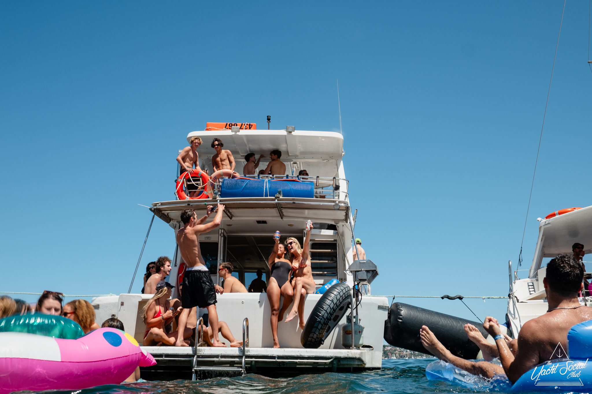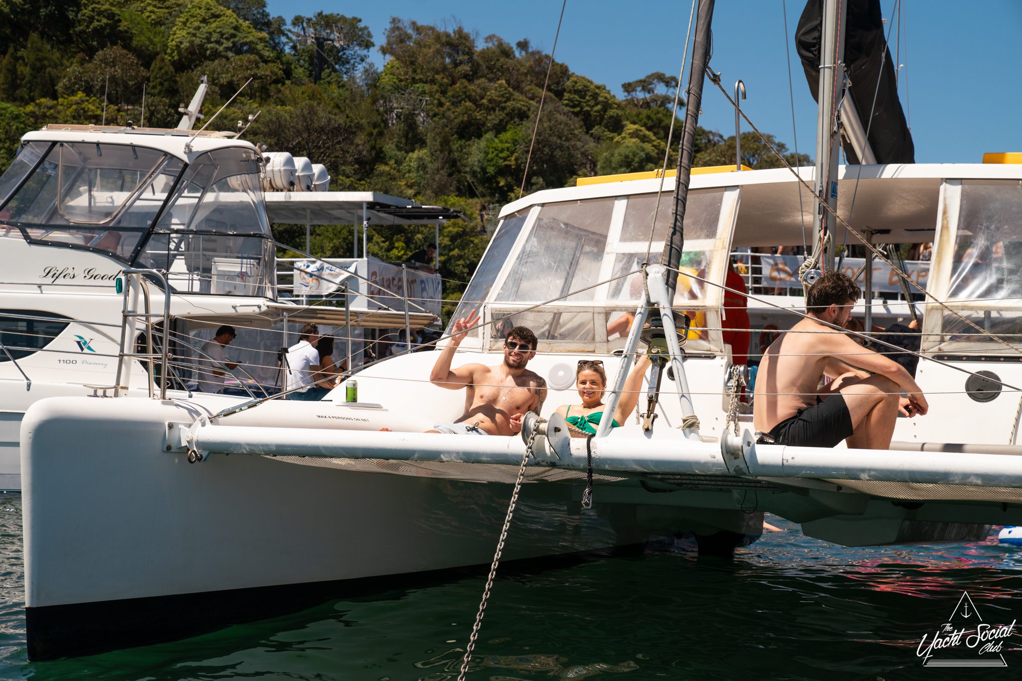People enjoying a Catamaran party in Sydney, with some on the deck and others in the water on inflatable floats, under a clear blue sky.