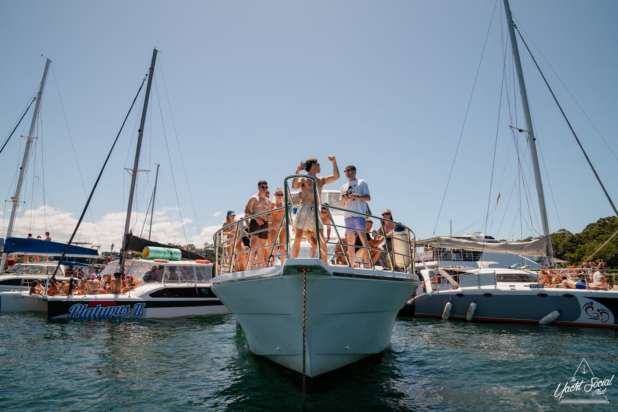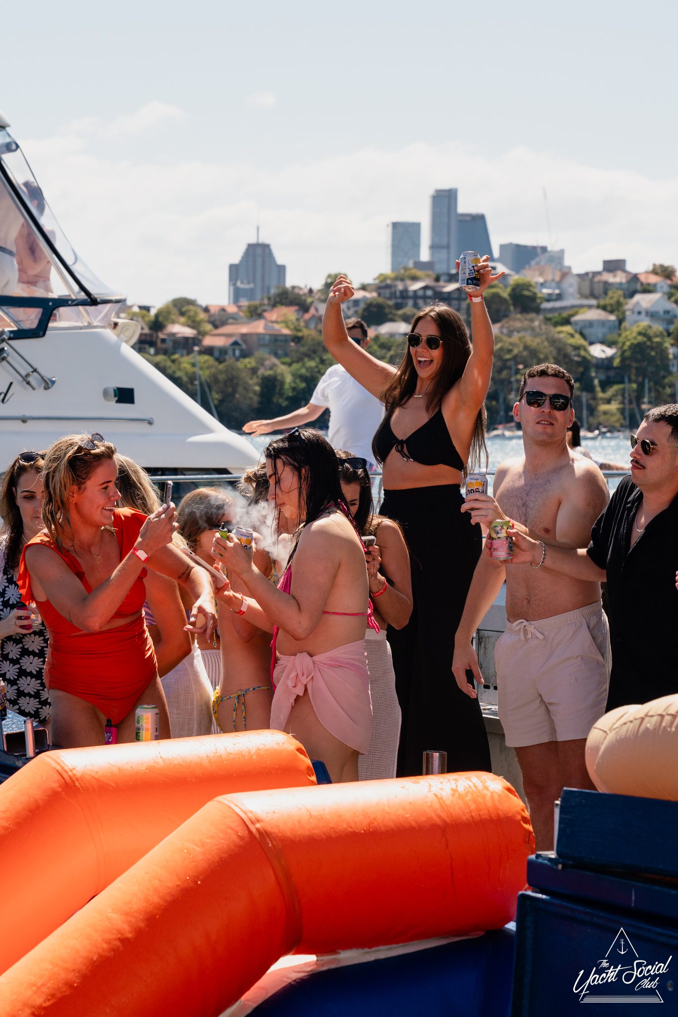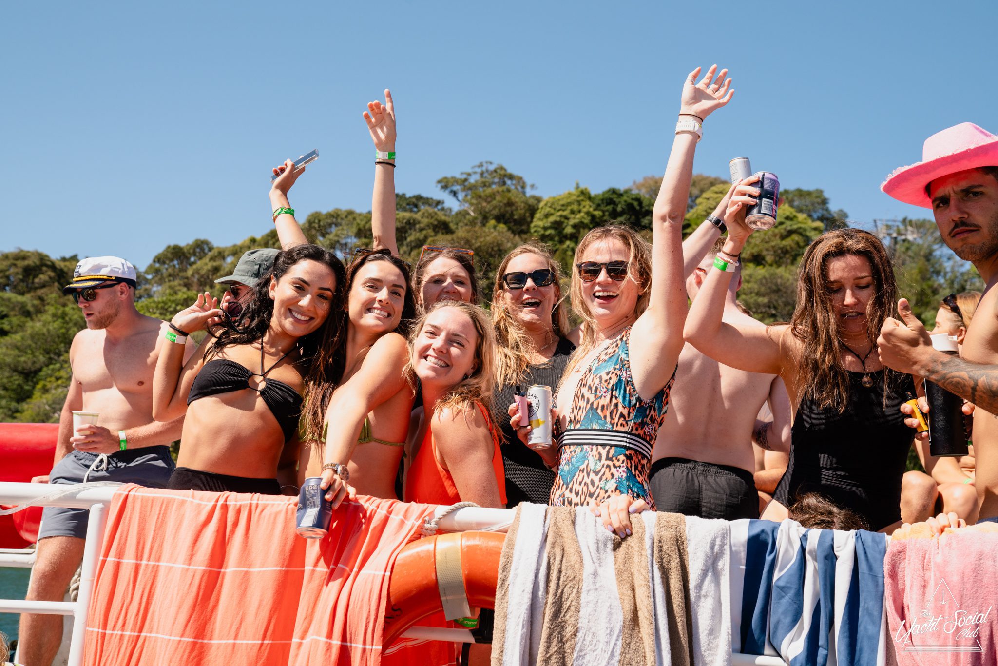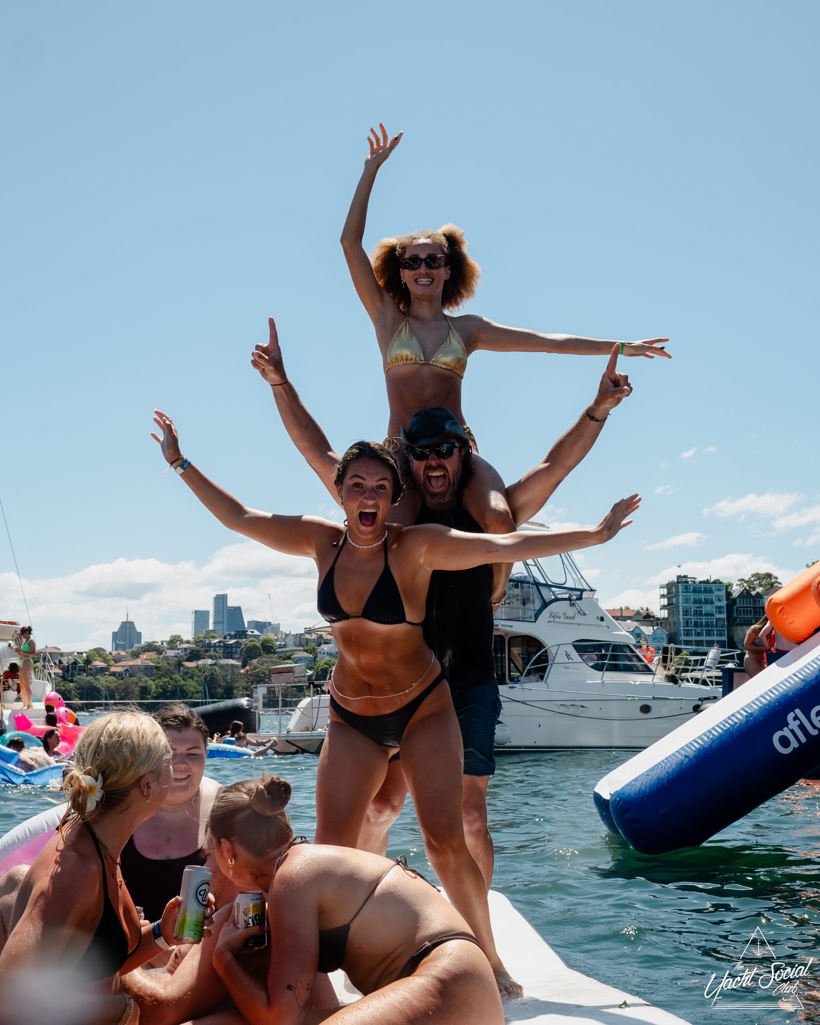 A woman in a black swimsuit sits on another woman's shoulders, raising a can and smiling. Beside them, a man in a pink cowboy hat also smiles. They are outdoors on a sunny day with people around, enjoying what appears to be a lively catamaran party in Sydney Harbour.