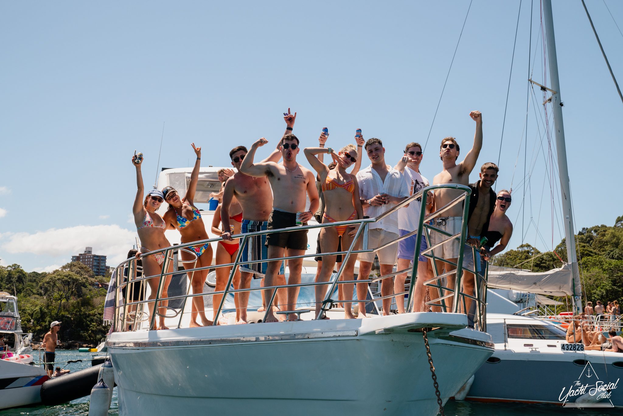 A group of people in swimwear is posing and cheering on a boat under a clear blue sky, enjoying a lively Sydney boat party hire.