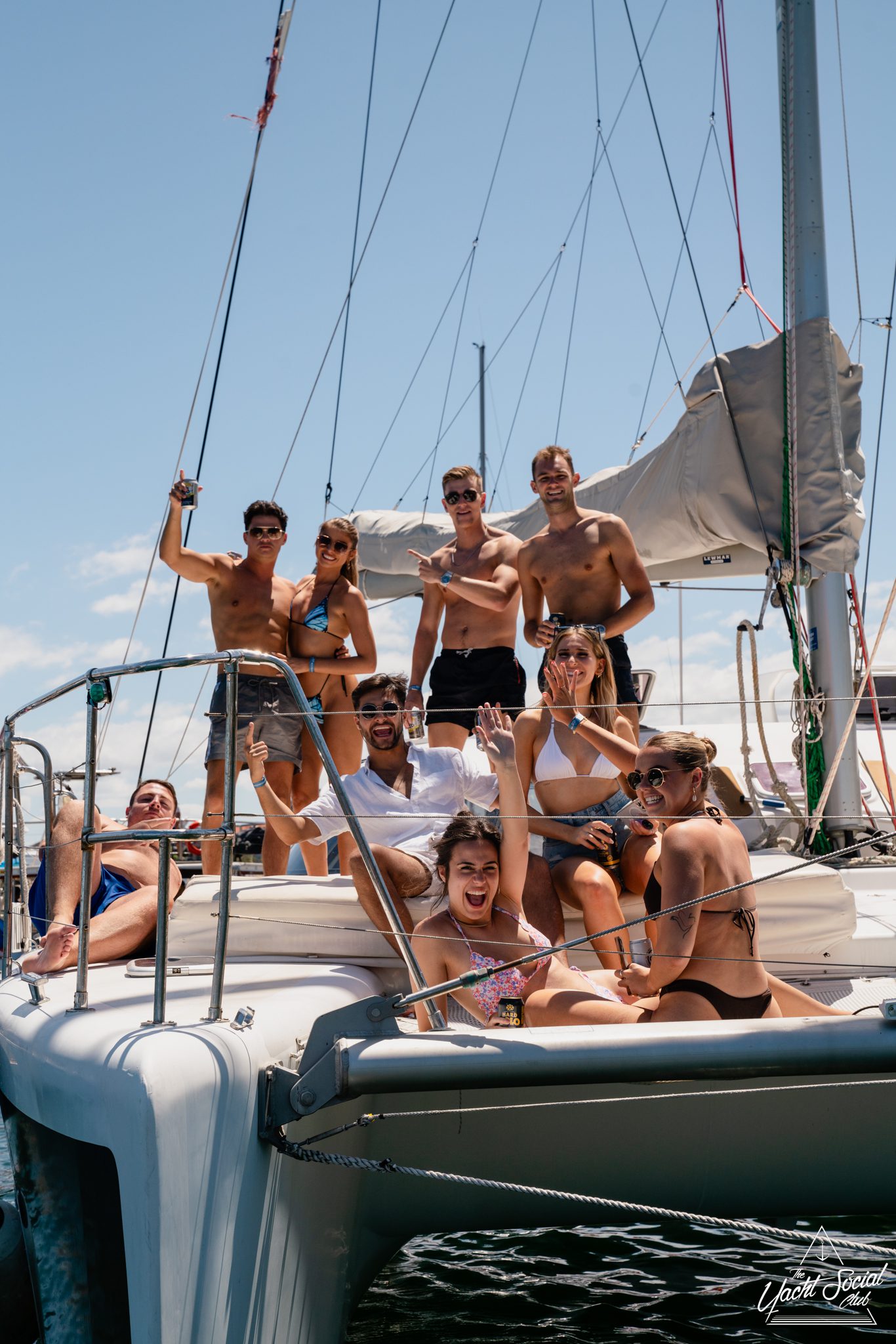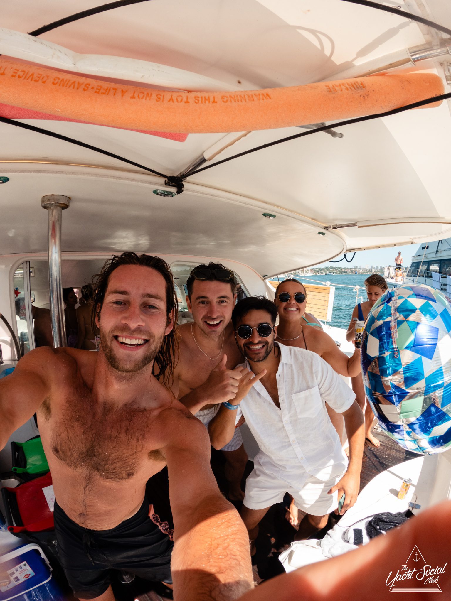 A group of people in swimwear are posing and smiling on a yacht deck under a clear sky, enjoying a lively catamaran party in Sydney.
