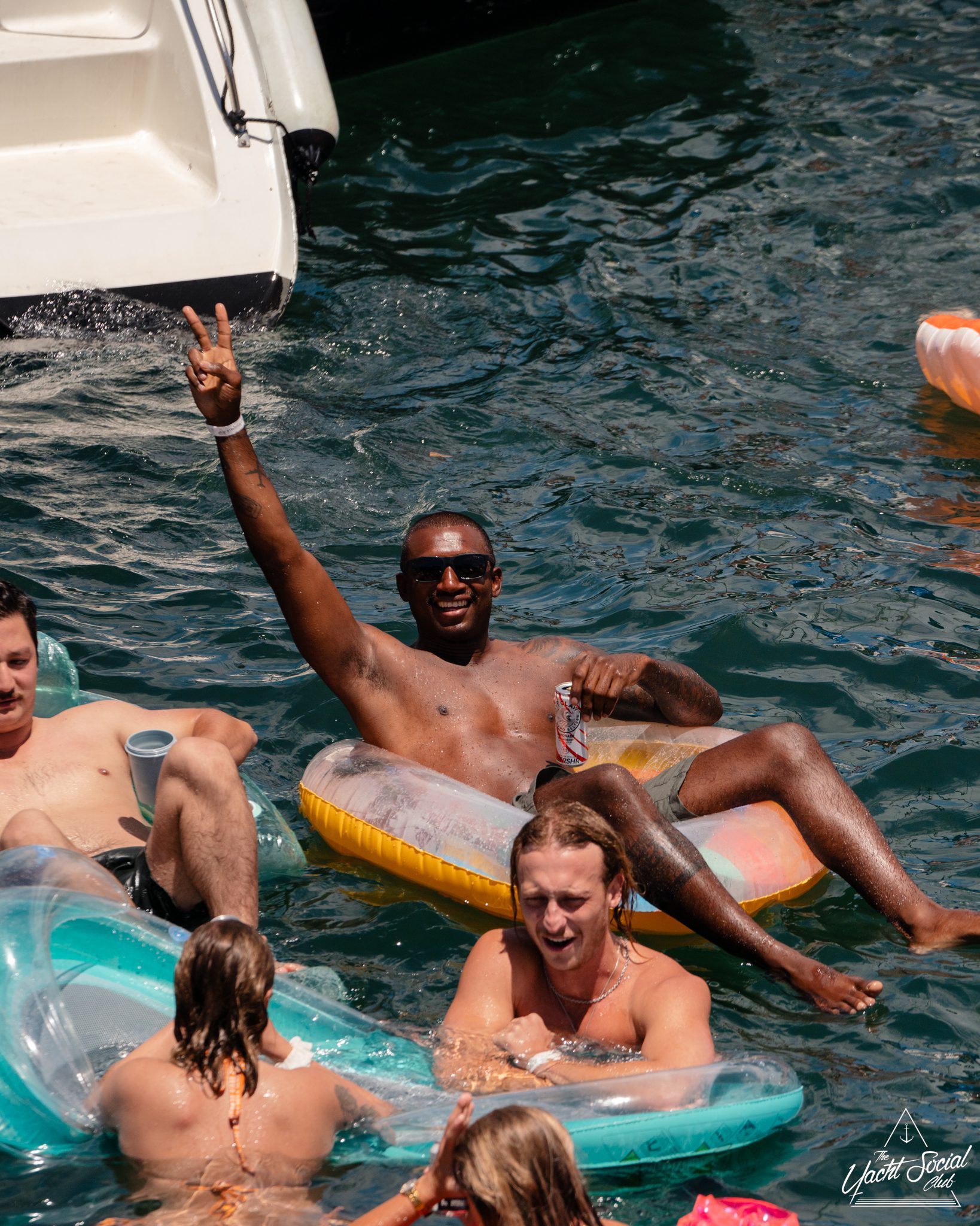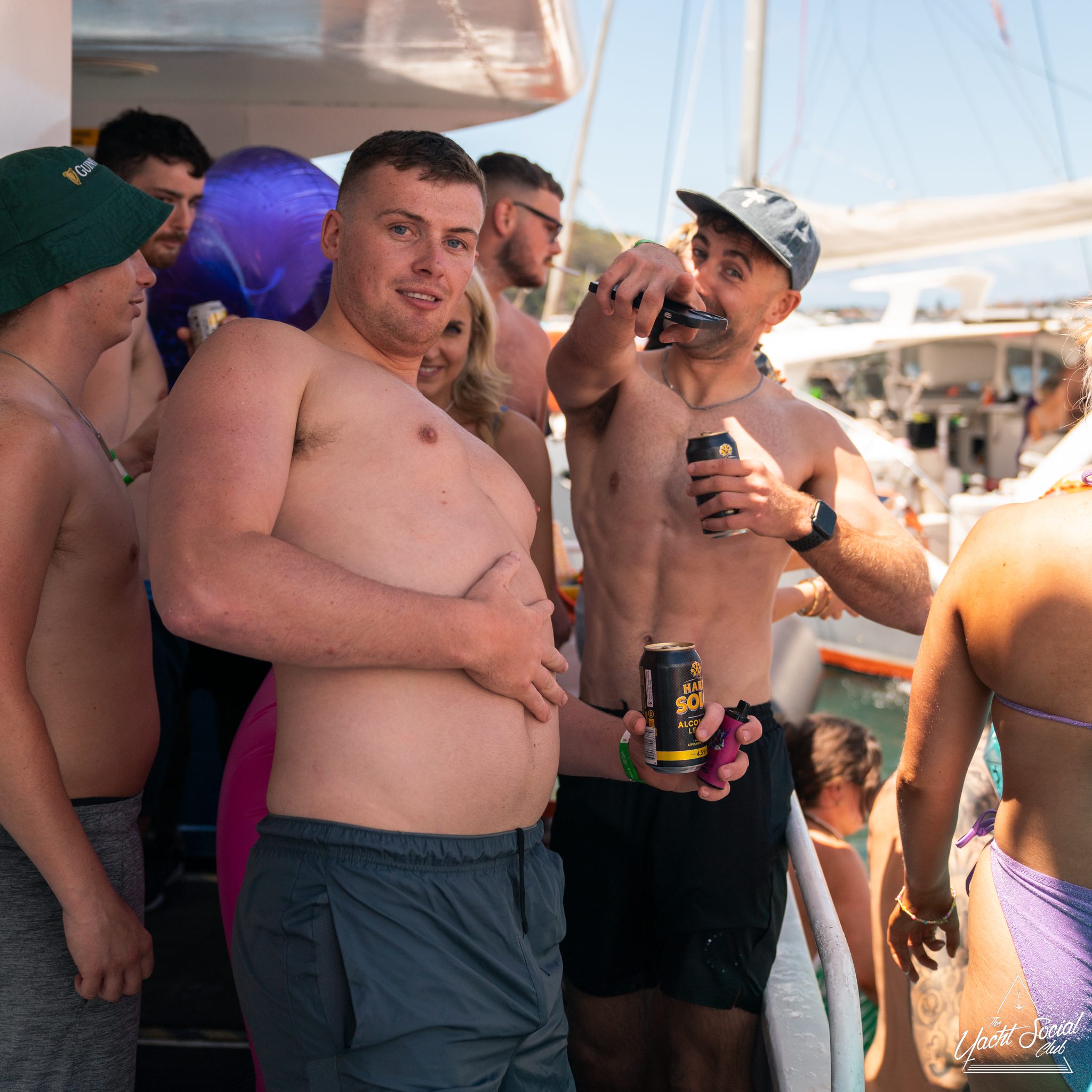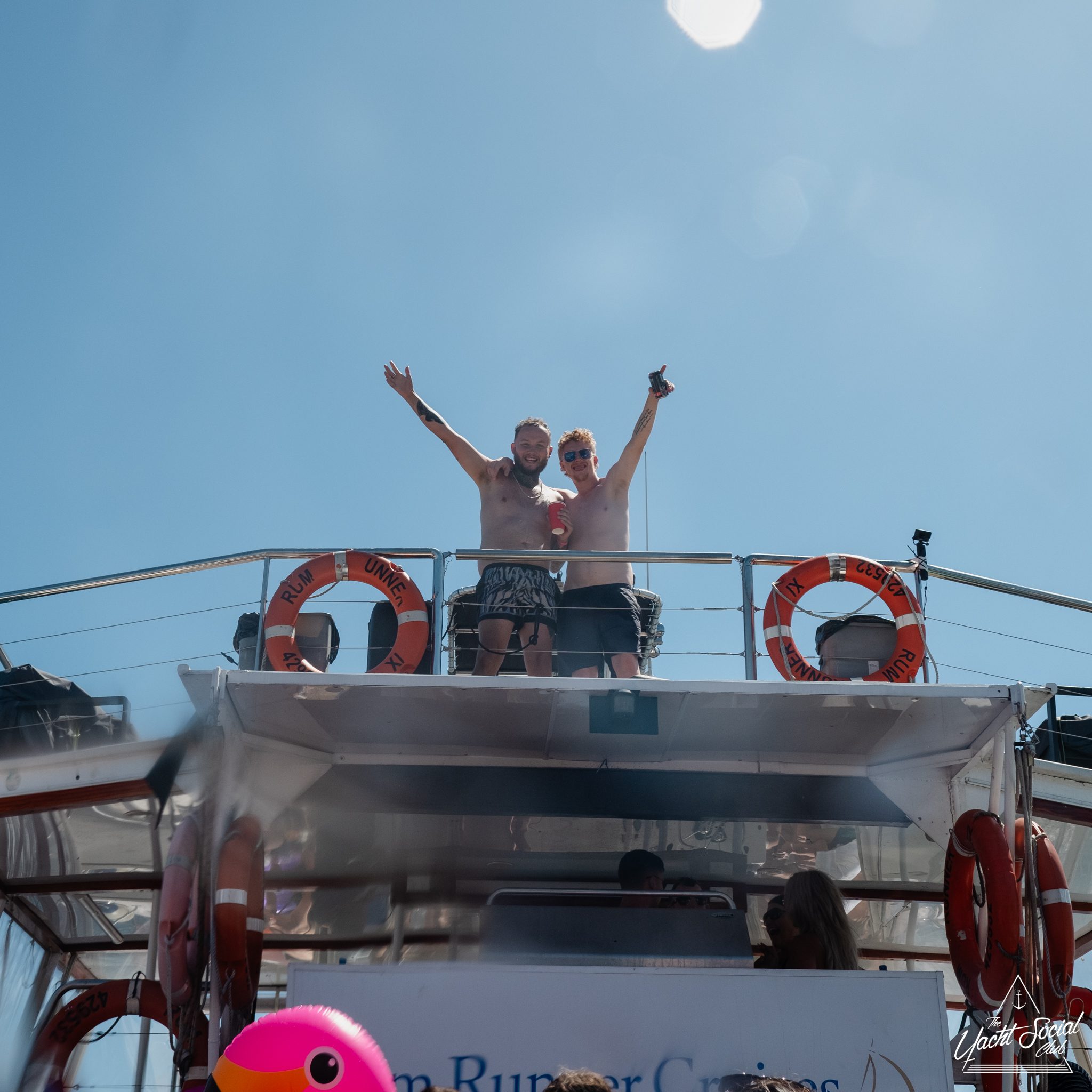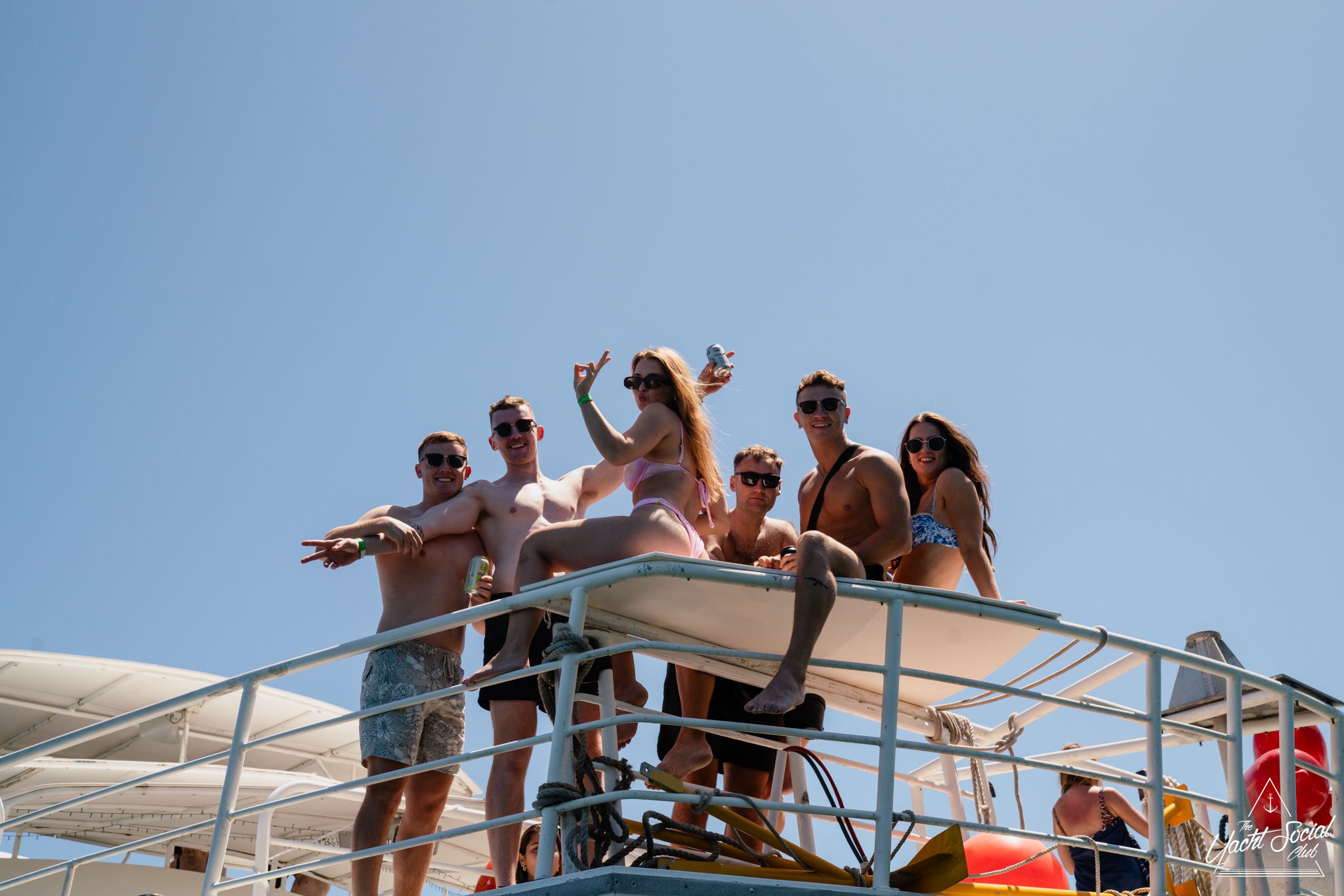 A lively group of people enjoying a party on a boat. A shirtless man on the left, wearing white sunglasses, smiles while making a peace sign. Another shirtless man next to him holds a drink. Other partygoers are visible in the background, along with another yacht nearby.