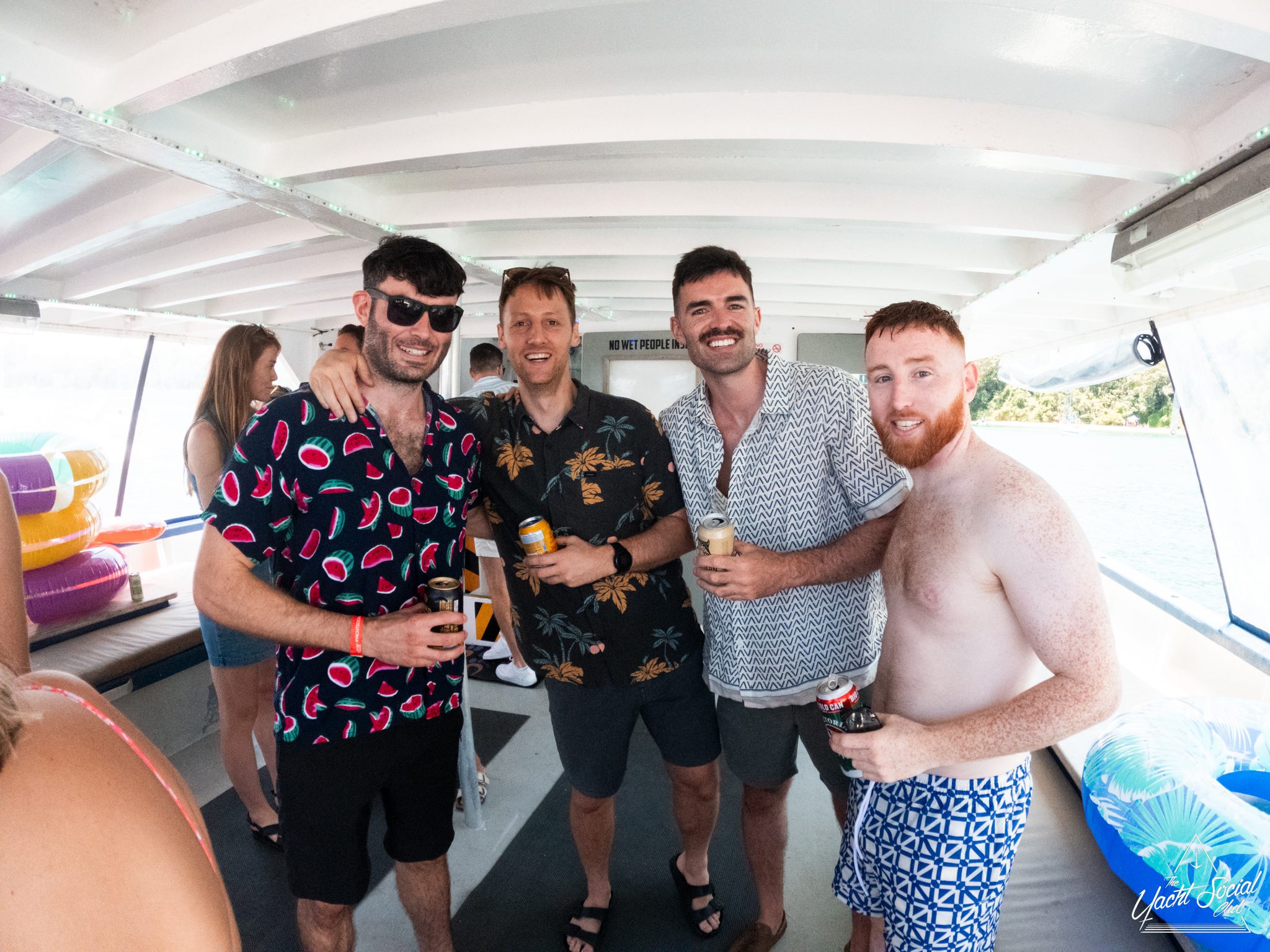 Four men are smiling and holding drinks on a boat. They are casually dressed in summer clothing, with one shirtless. Other people can be seen in the background, enjoying the vibe of a Sydney boat party hire.