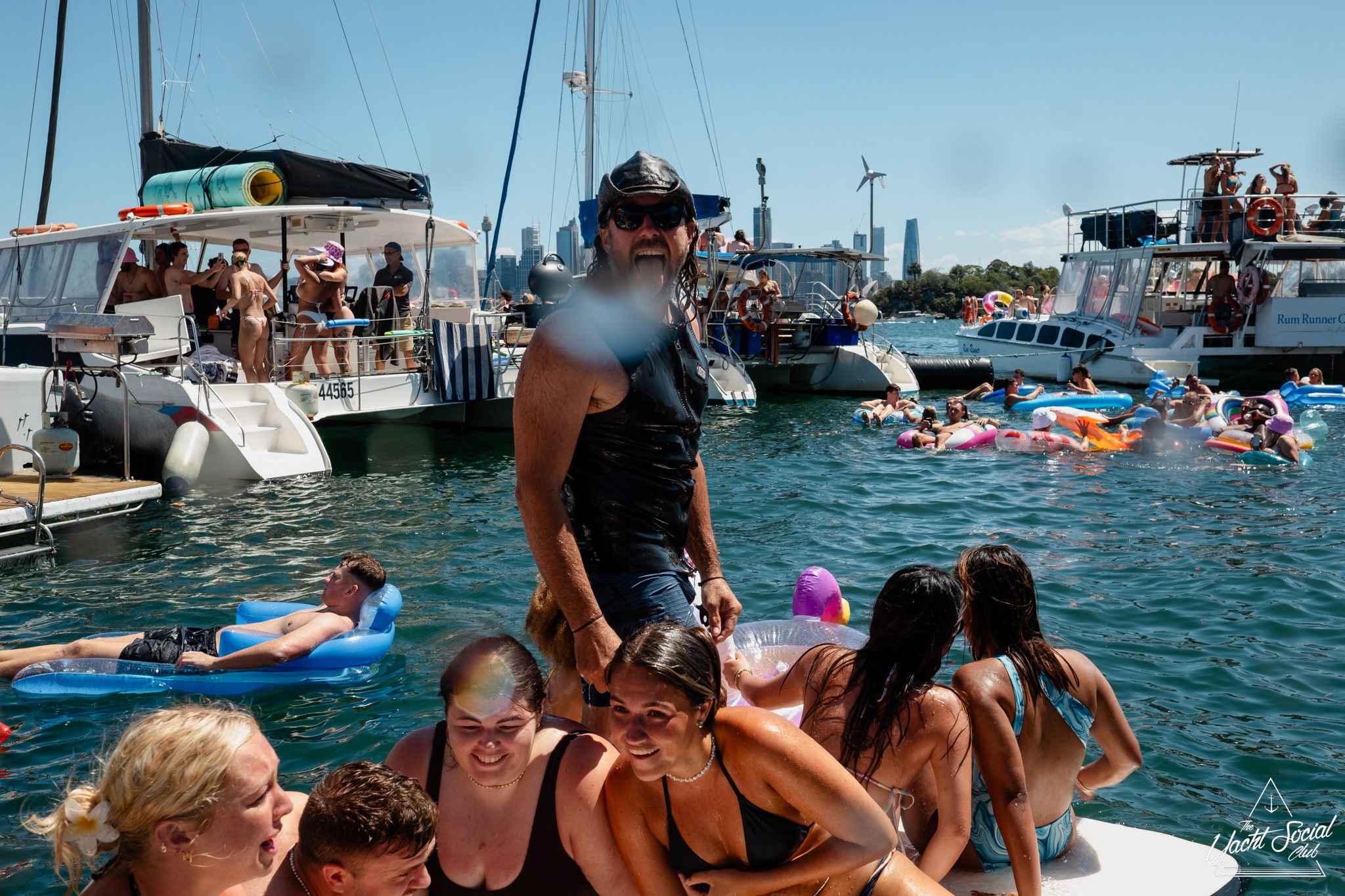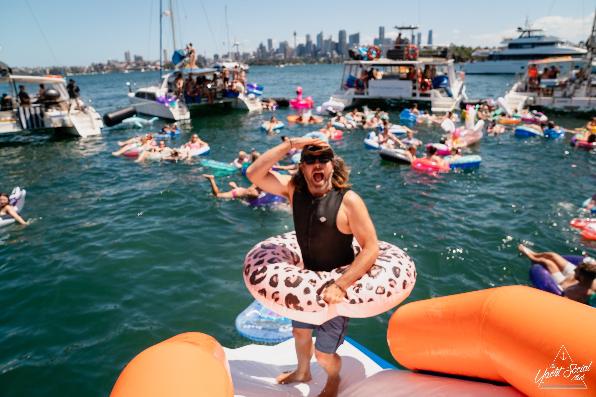 A man wearing a leopard-print swim ring stands on a float in a crowded water area with boats and people in the background, while city buildings are visible in the distance. A DJ boat hire Sydney event adds to the lively atmosphere.