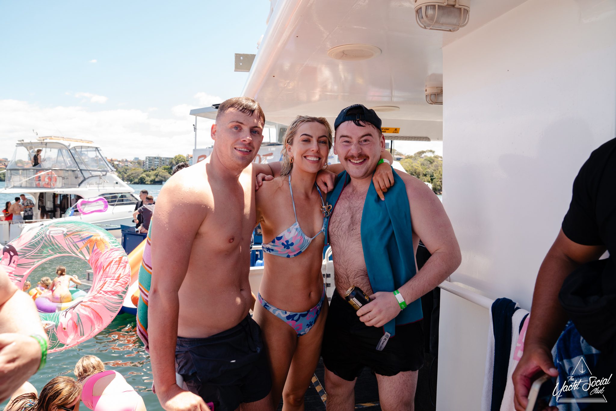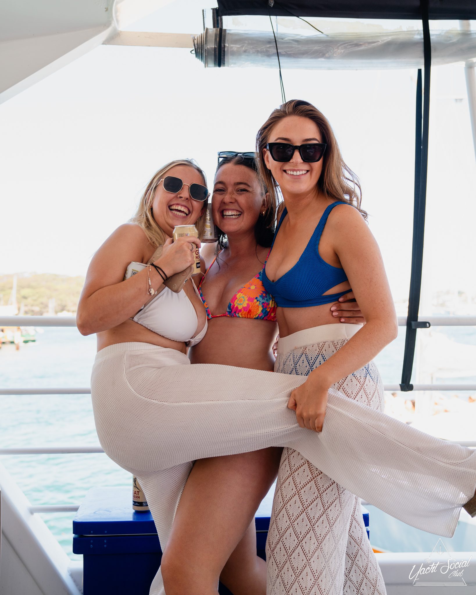 Three people pose together on a private yacht charter in Sydney Harbour, smiling for the camera. One is in a green bikini, another in a black swimsuit with a white wrap, and the third in an orange mesh cover-up.