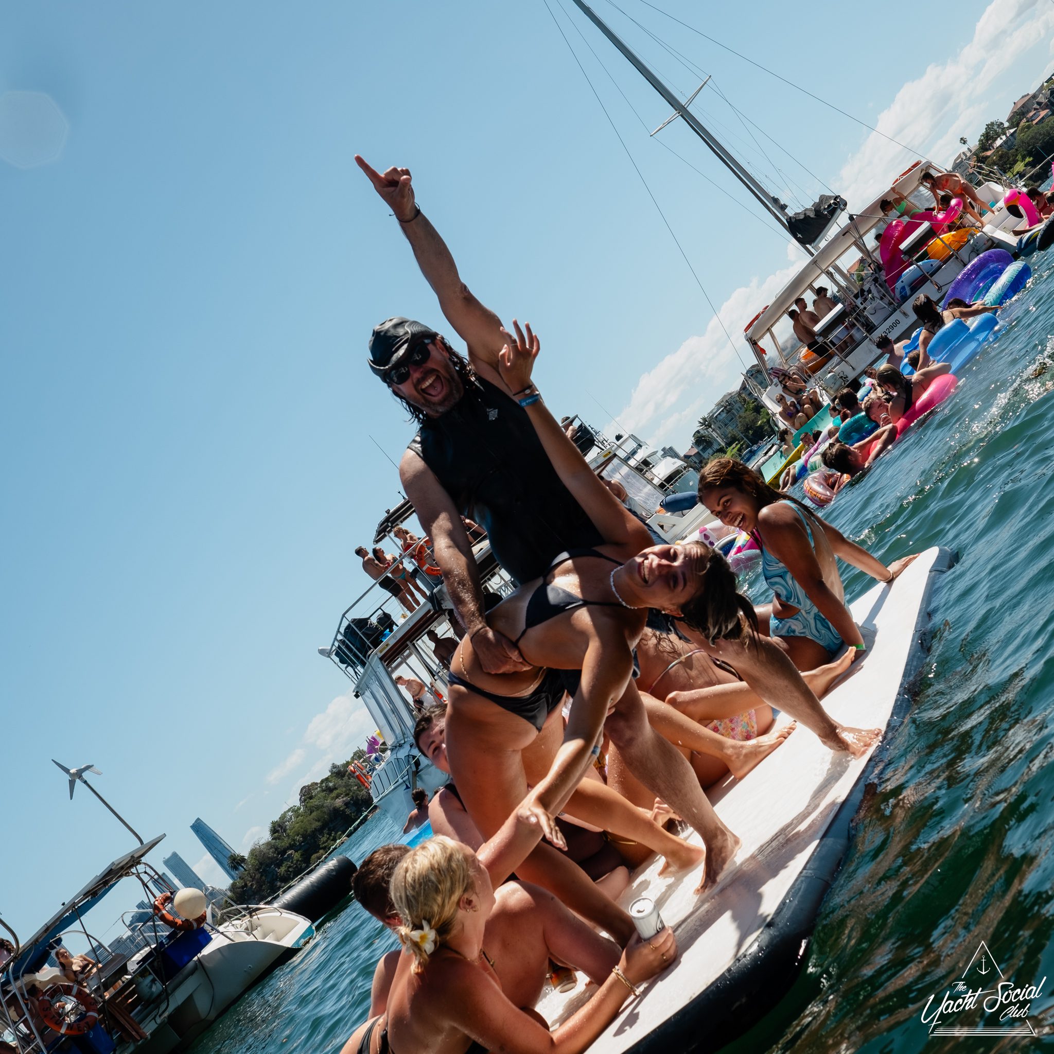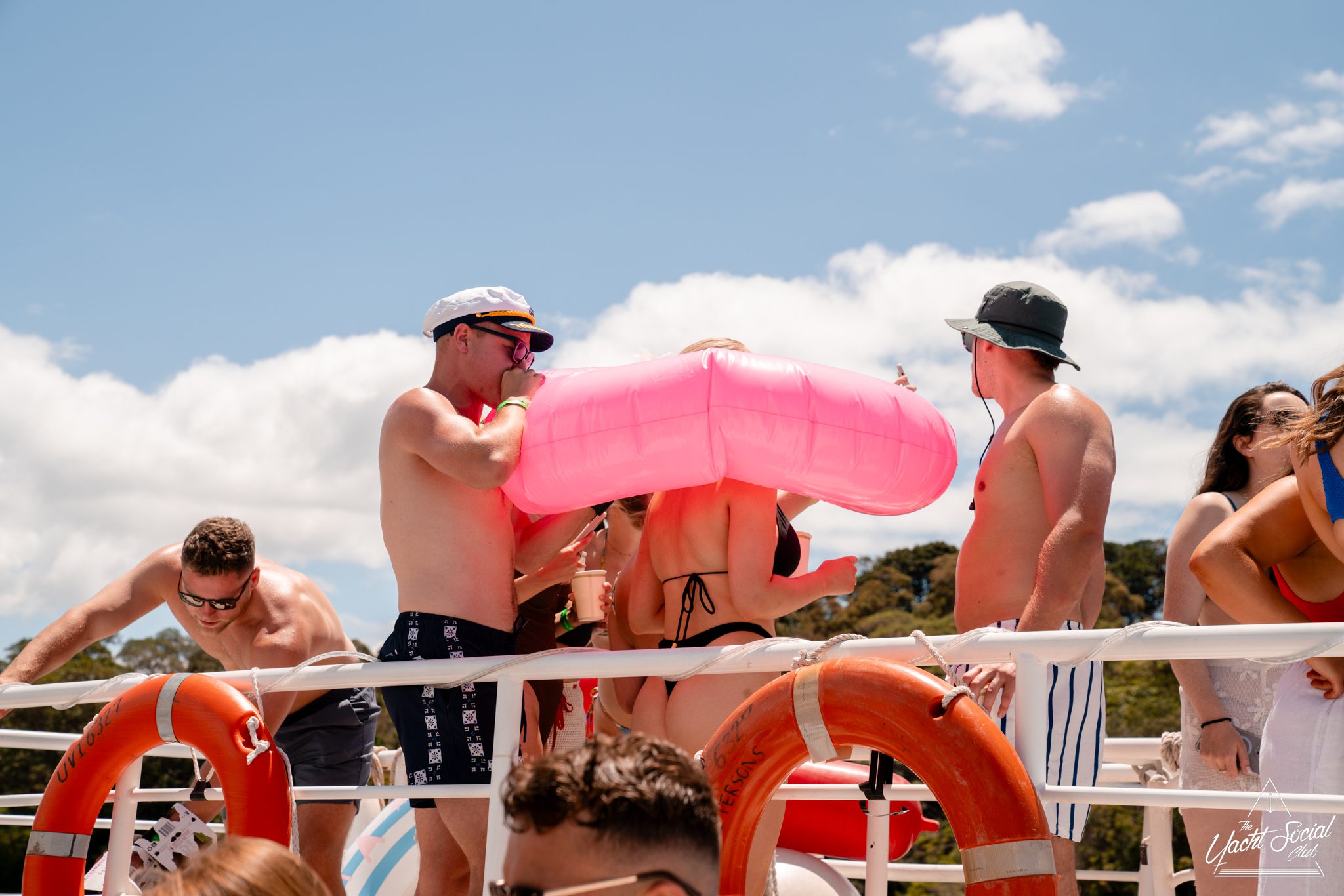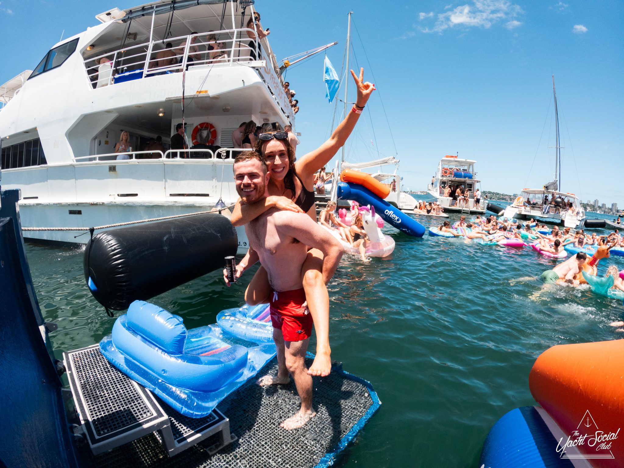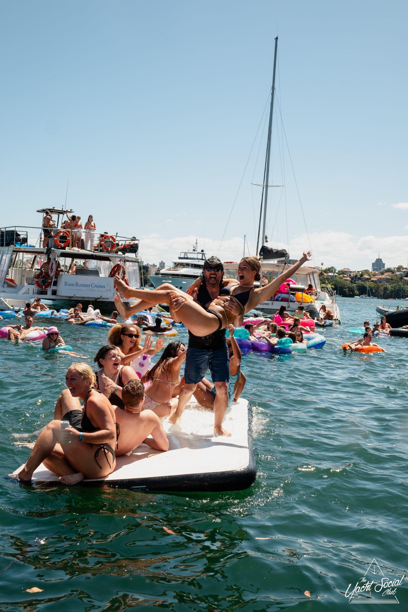 A group of people in swimwear having fun on floats and inflatables in a body of water on a sunny day; a woman is being lifted up playfully by a man while others look on and smile, enjoying their time during a lively catamaran party in Sydney.