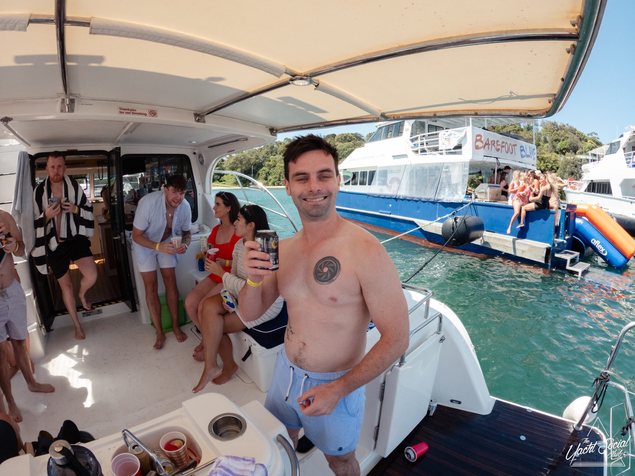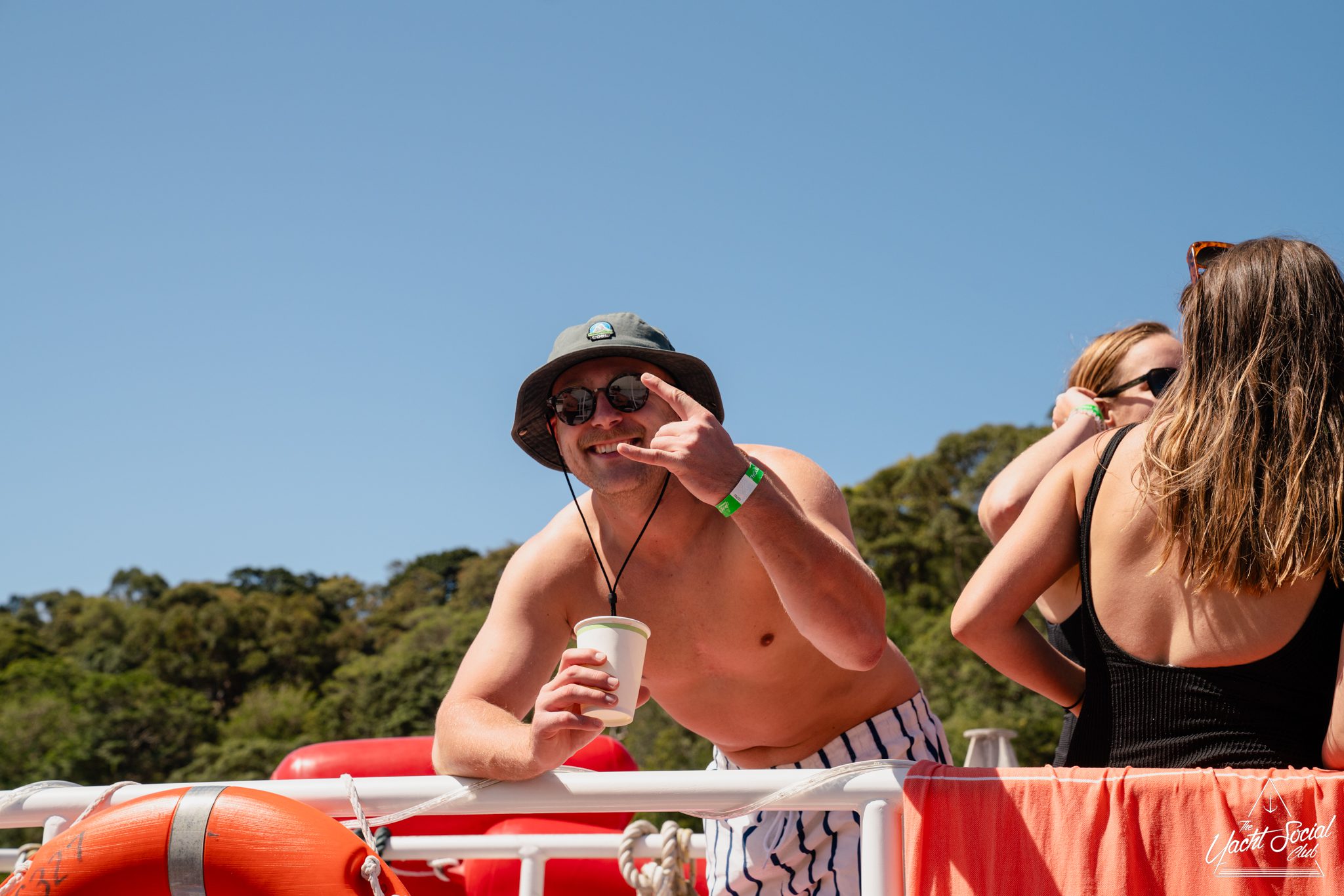 A shirtless man wearing a hat and sunglasses holds a cup while making a gesturing hand sign on a boat with several people. Trees and blue sky are in the background, capturing the fun of a Sydney boat party hire.