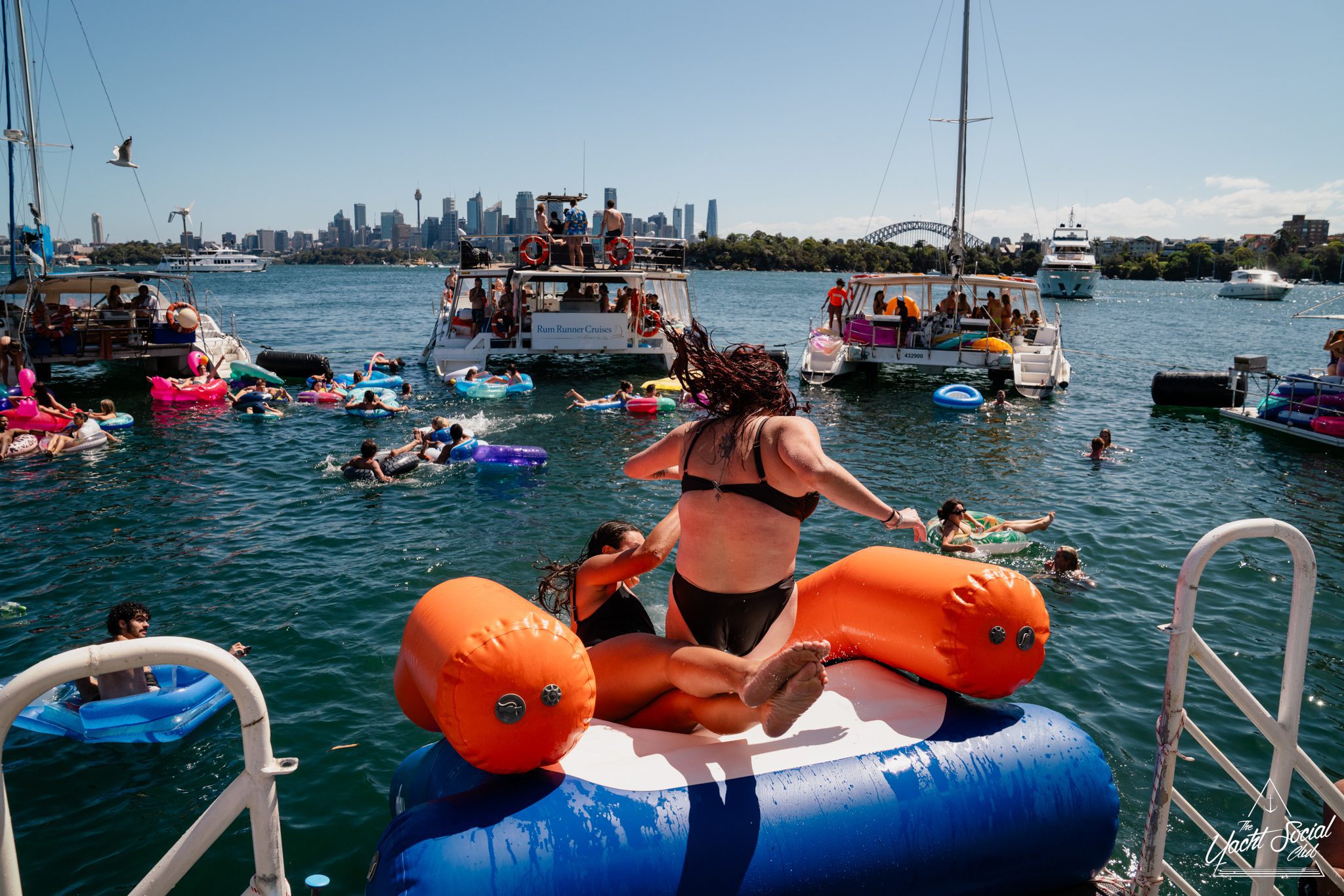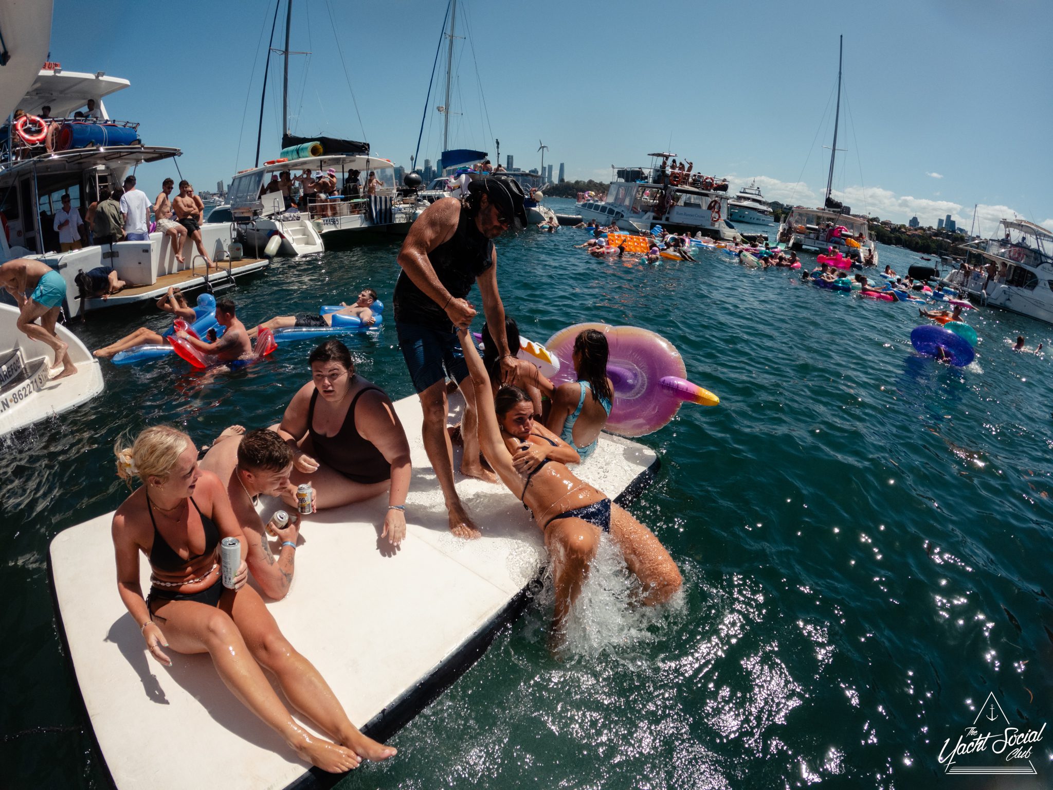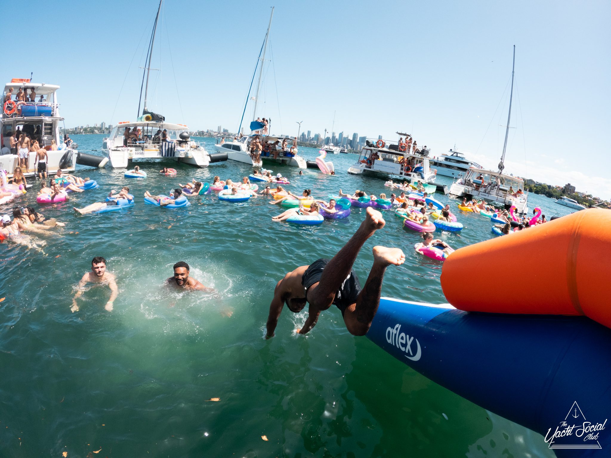 People on inflatables and swimming near yachts in a harbor on a sunny day, enjoying the vibrant atmosphere of a Sydney boat party hire, with some lounging on floating platforms.