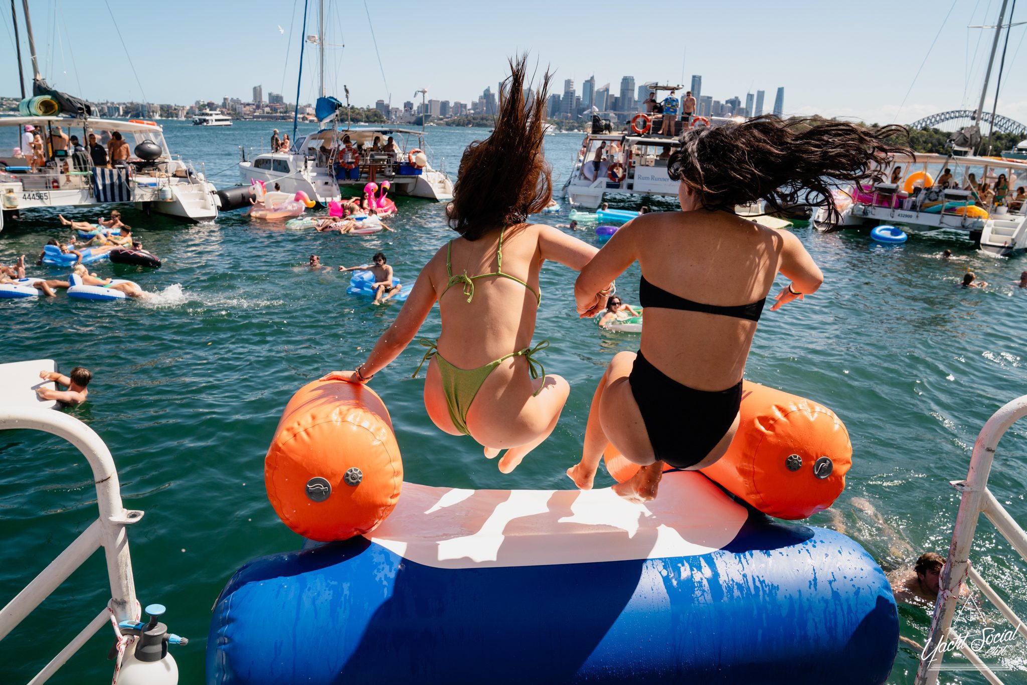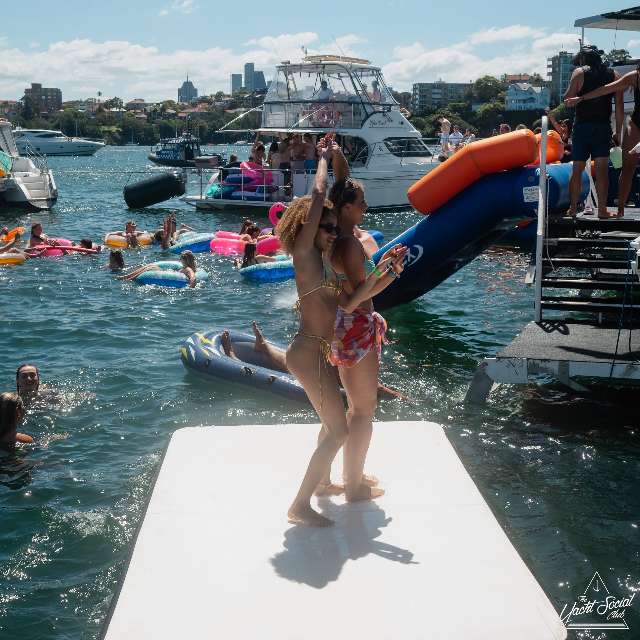 Two women dance on a dock next to a floating water slide, while people swim and lounge on inflatables in the water, with more guests enjoying themselves on boats in the background. It looks like an ideal setting for a Sydney boat party hire!