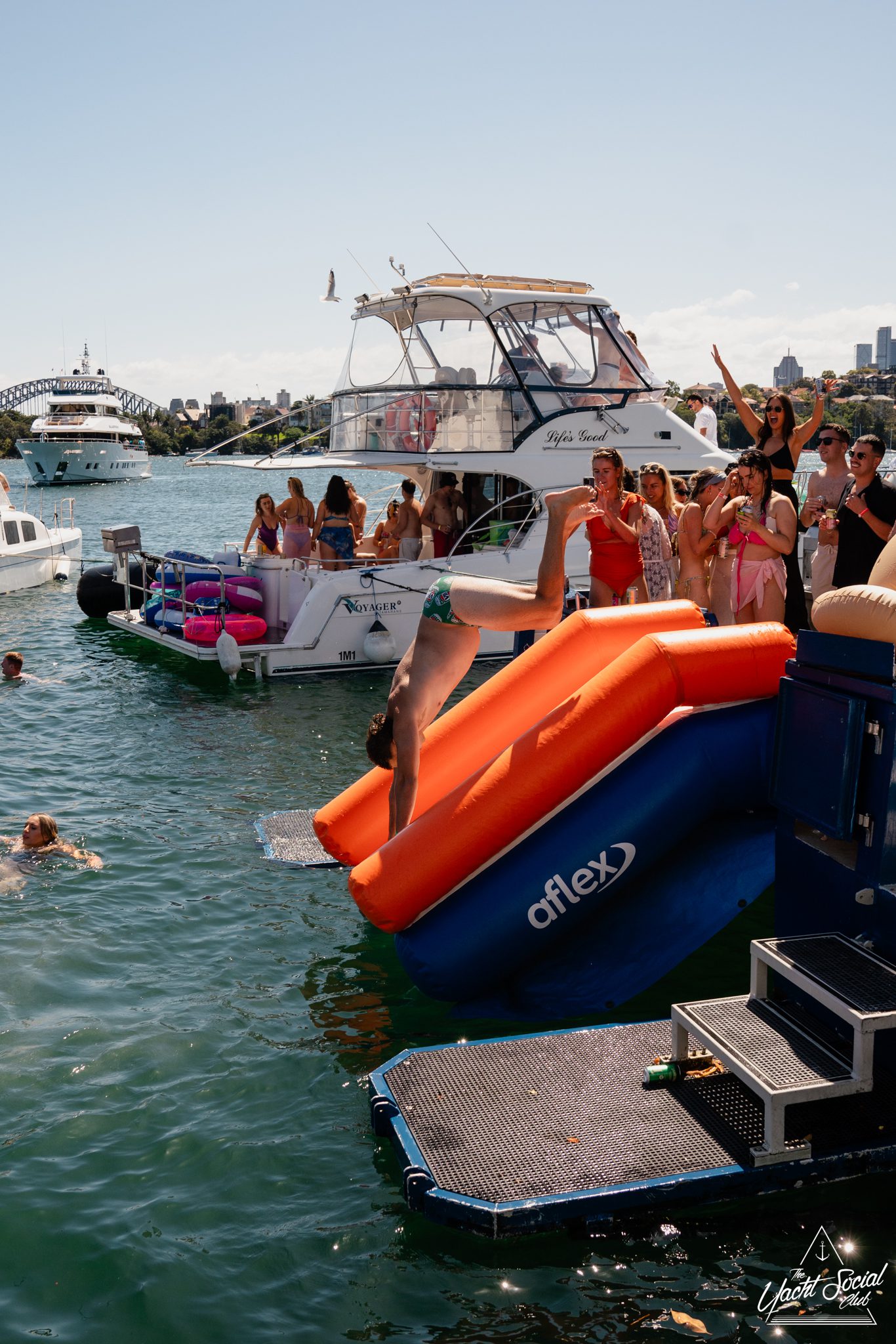 People on a boat watch as one person slides down an inflatable slide into the water, connected to the boat's deck. Clear blue sky and calm water provide a perfect backdrop for this corporate boat event in Sydney.