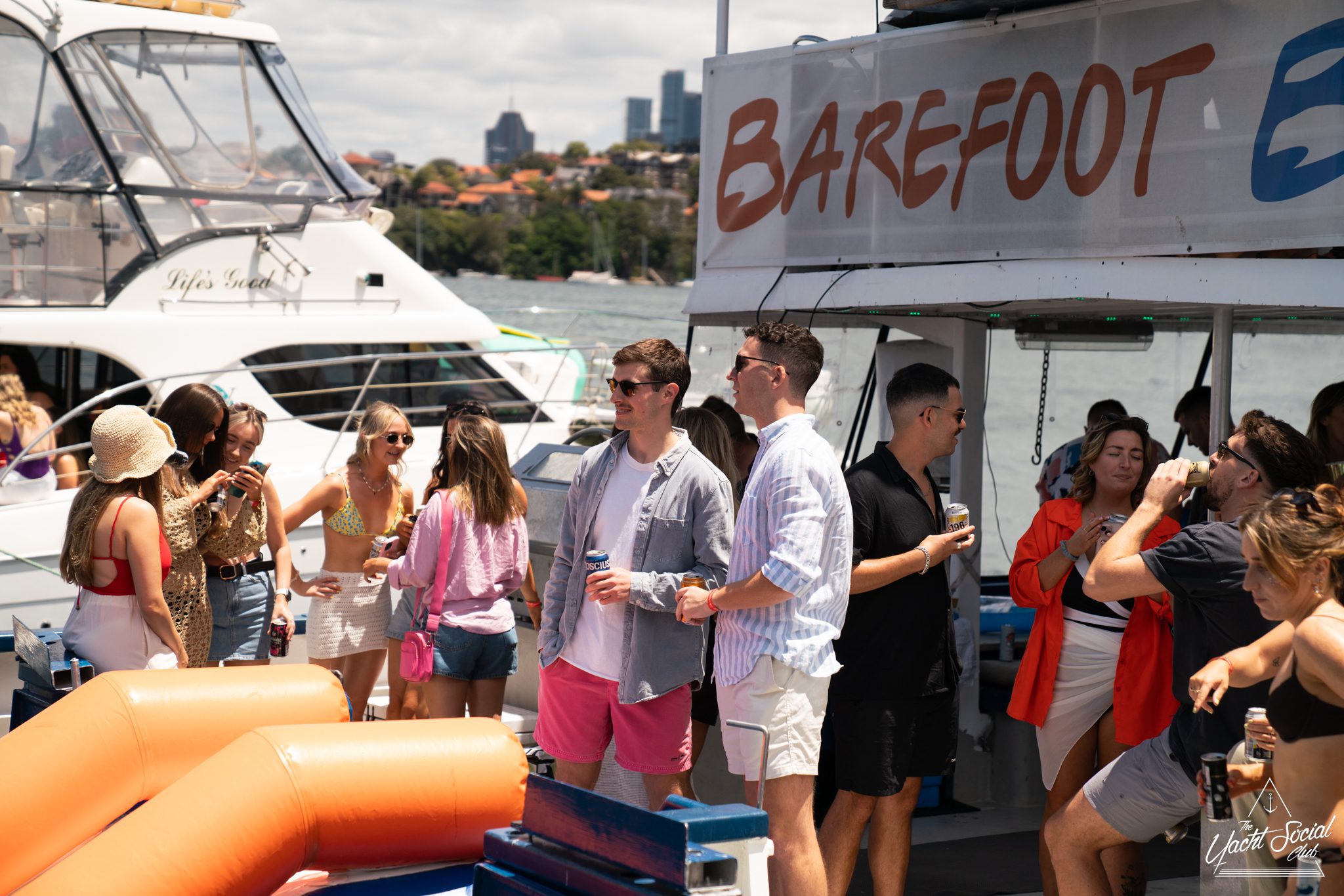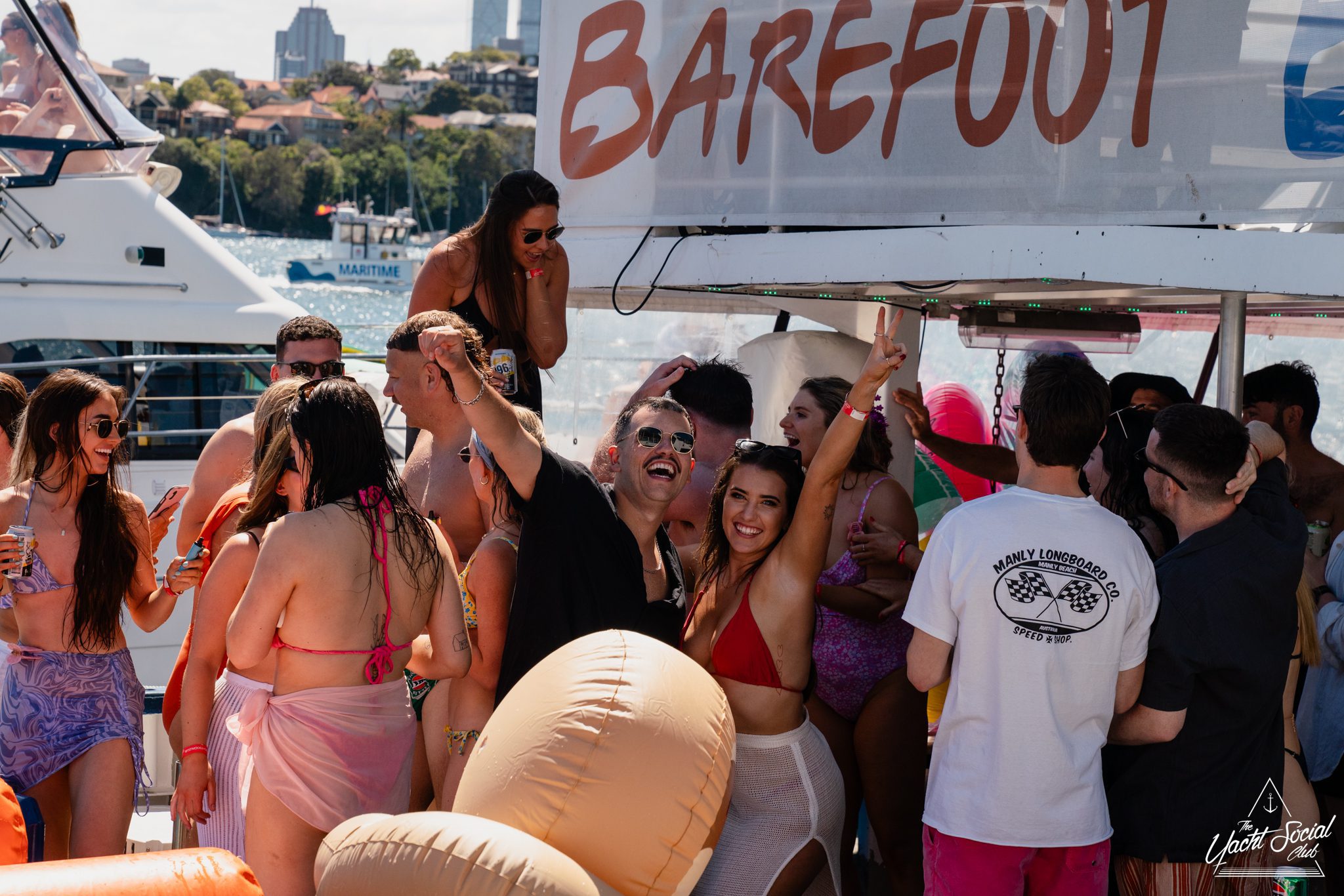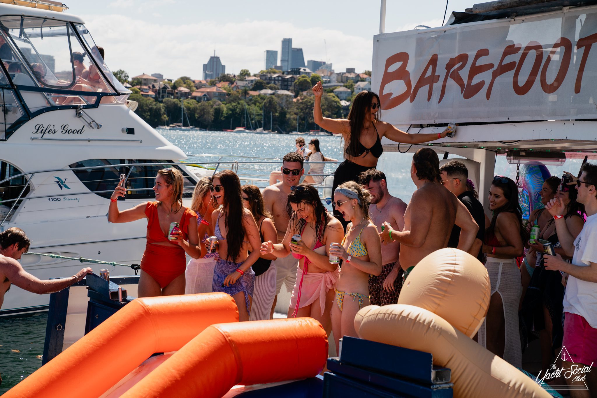 A group of people in swimsuits are partying on a luxury yacht named "Barefoot." Some are dancing, and others are holding drinks with another boat and a city skyline in the background. Ideal for private yacht charters or Sydney boat party hire, it promises an unforgettable experience on Sydney Harbour.