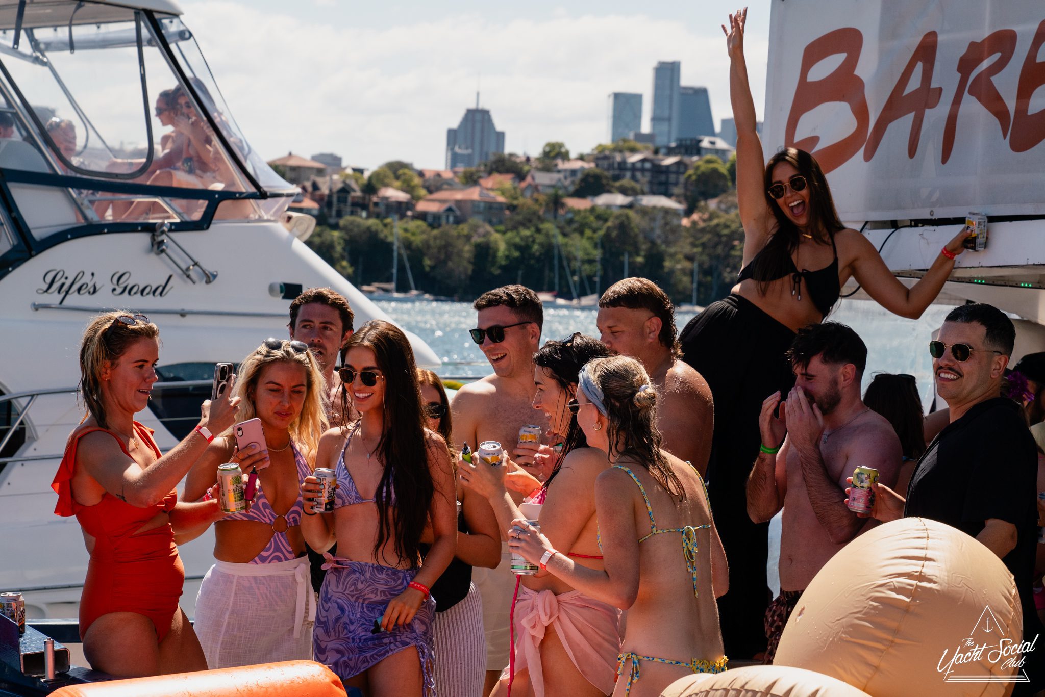 Three people in swimsuits pose with drinks on a crowded outdoor deck, with 'Barefoot' written above them. Other people in swimwear can be seen in the background. Enjoy the luxurious vibe similar to a DJ boat hire Sydney event or corporate boat events Sydney.