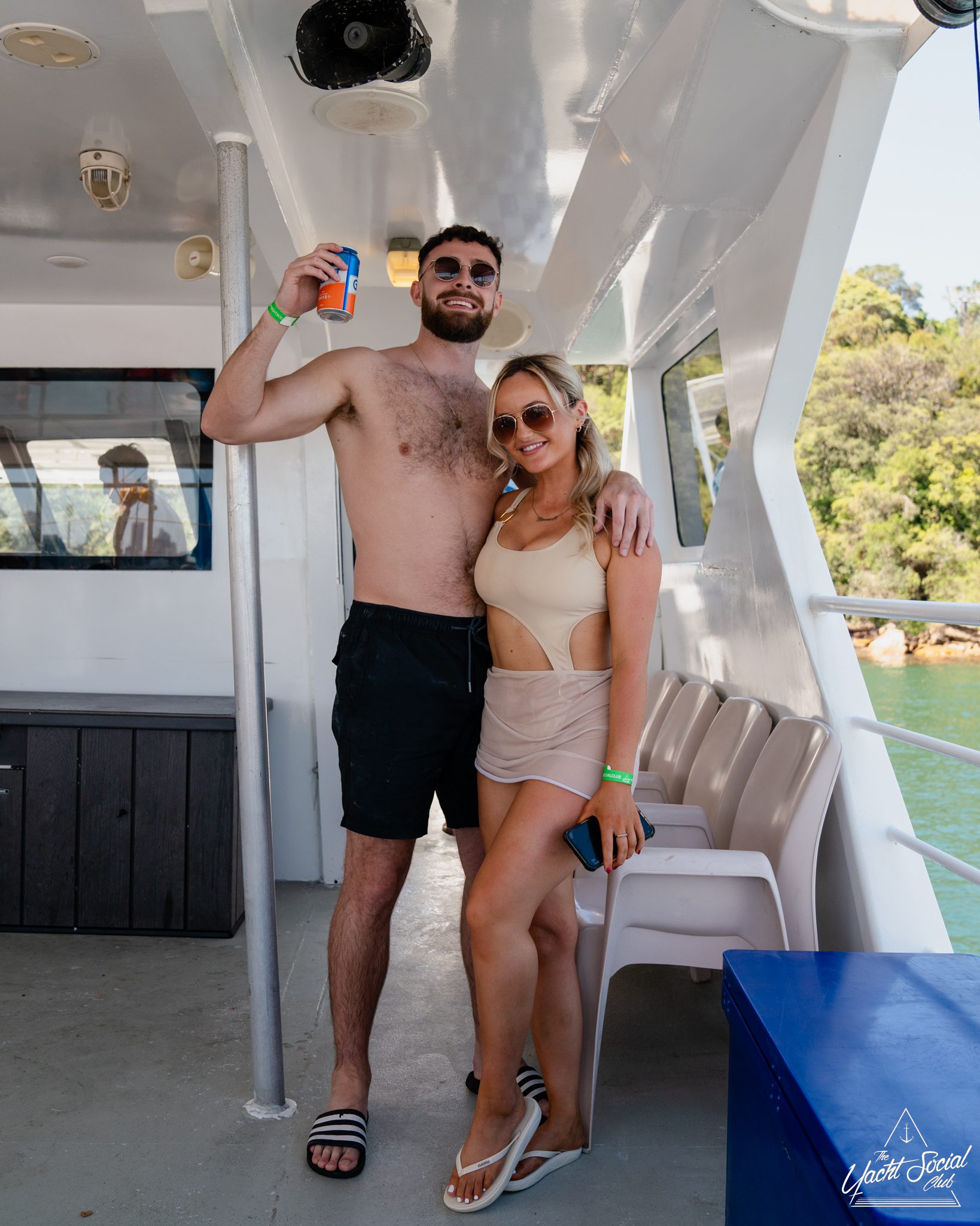 A man and woman pose on a private yacht charter in Sydney Harbour. The man is shirtless, holding a drink, and the woman is wearing a light-colored swimsuit. Trees and water are visible in the background.