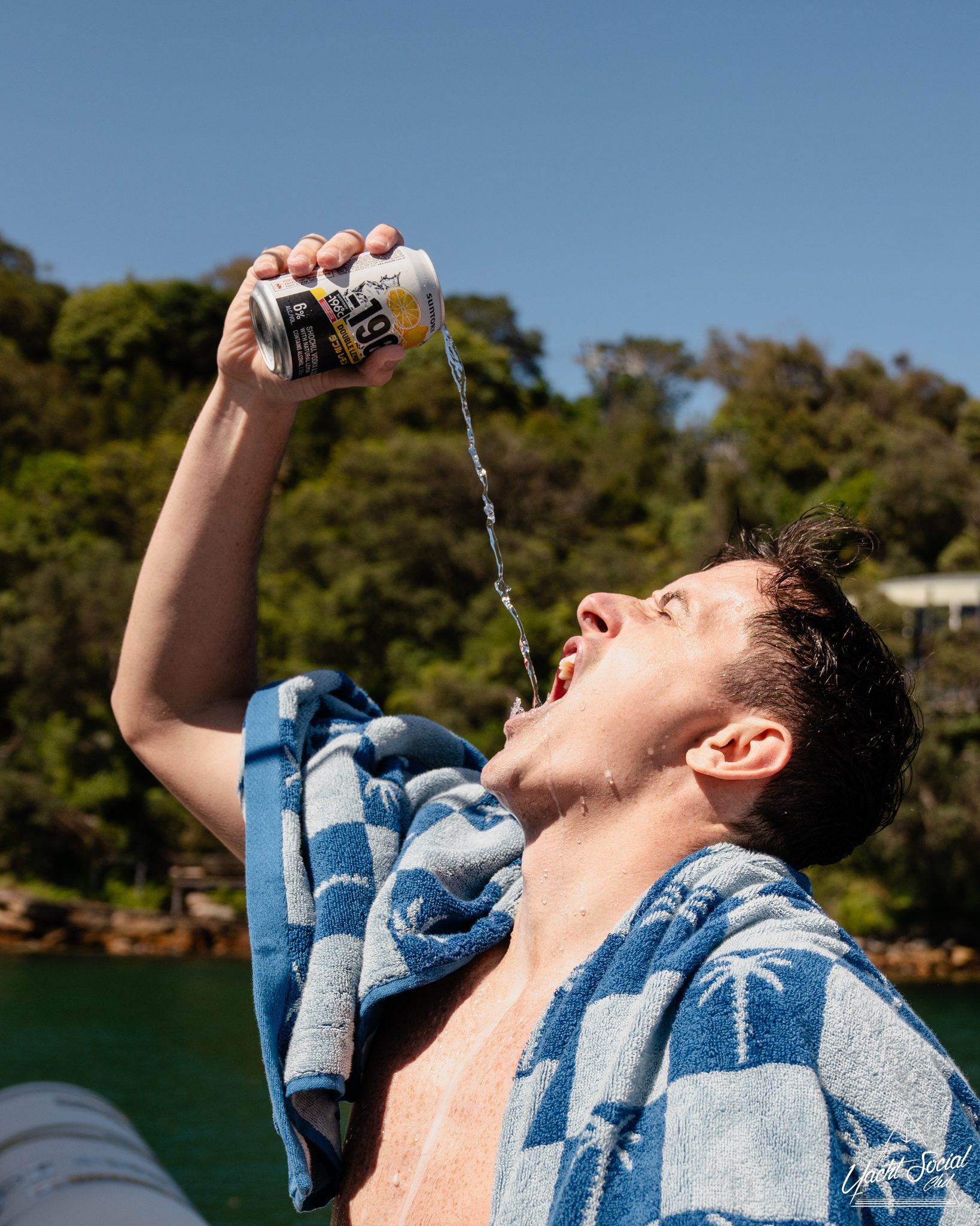 A person tilts a can to pour a drink into their mouth outdoors, with a blue towel draped over their shoulders. Trees and water are visible in the background on a sunny day, evoking the laid-back vibes of a luxury yacht hire Sydney adventure.