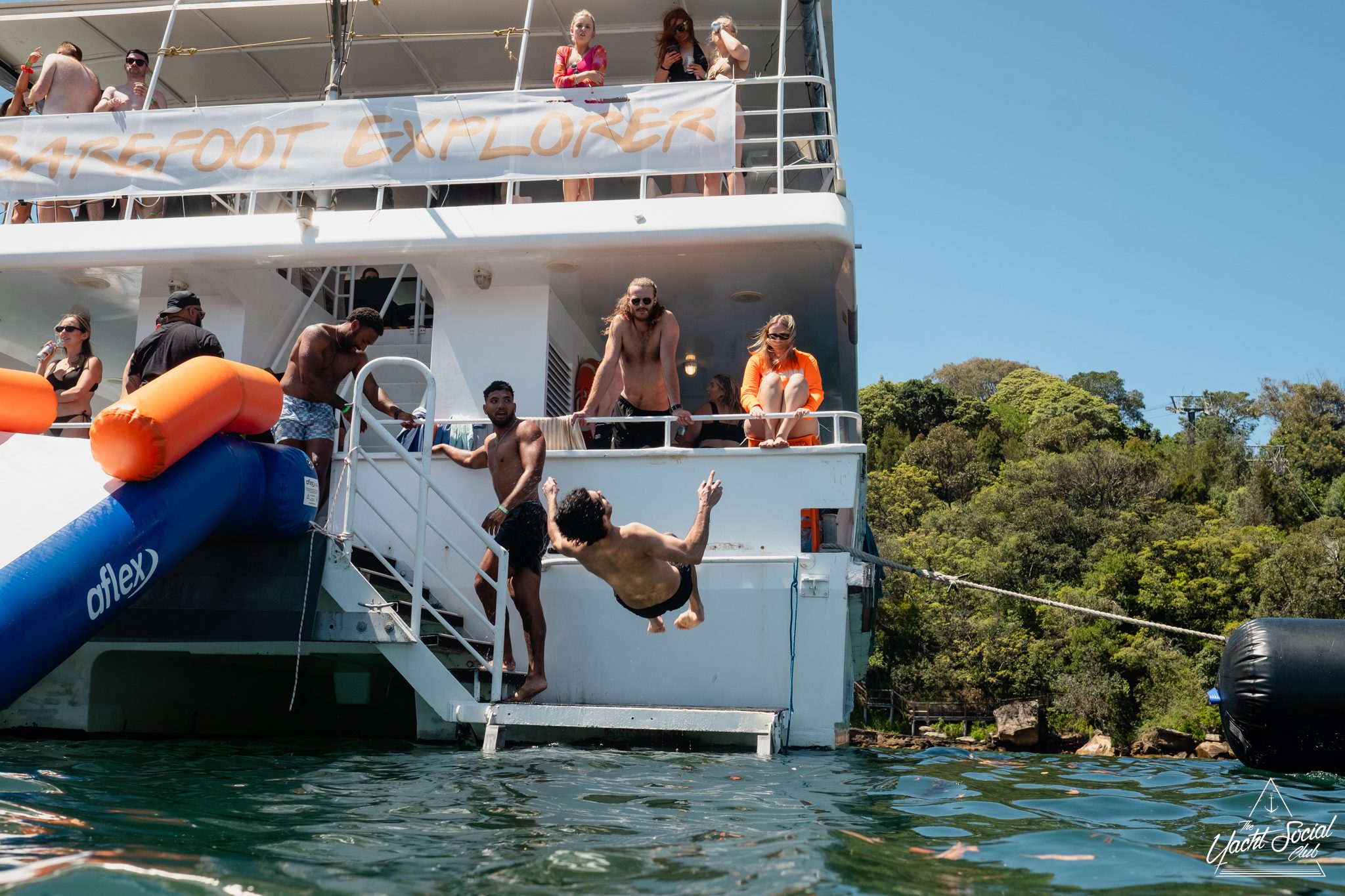 A group of people on a boat watch as a person dives backward into the water. The boat has an orange slide and "Barefoot Explorer" written on it. Trees and blue sky are in the background, perfect for your next corporate boat event in Sydney.