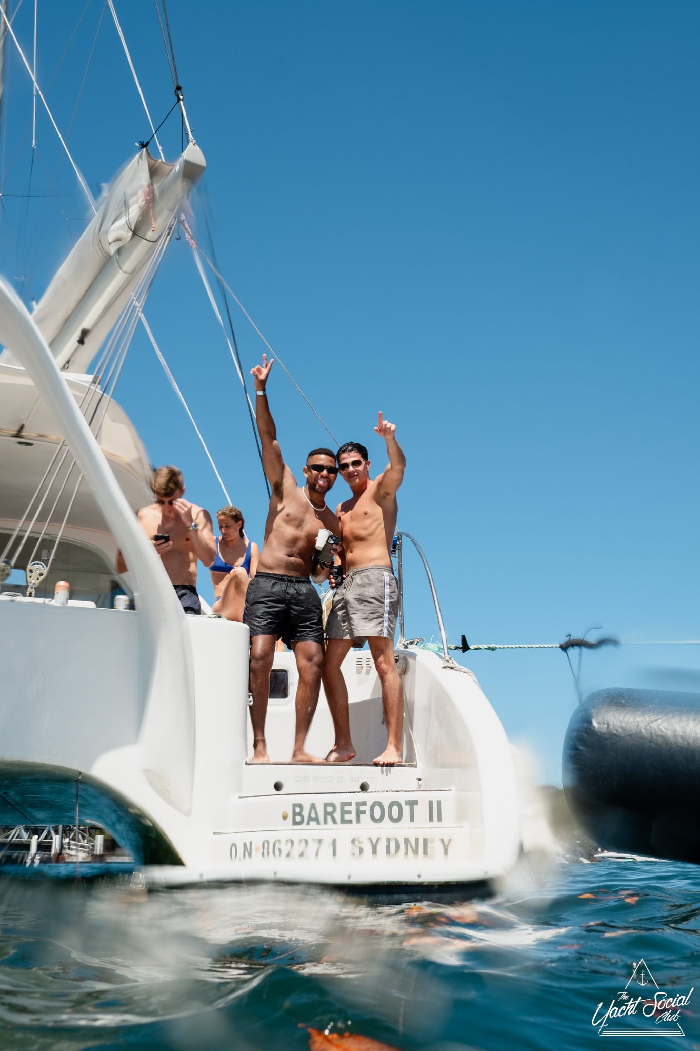 Two men in swim trunks stand on the back of a yacht named "Barefoot II" with arms raised in celebration. Other individuals are seen on the yacht, enjoying the sea in the foreground—a perfect scene for luxury yacht hire Sydney or catamaran party Sydney.