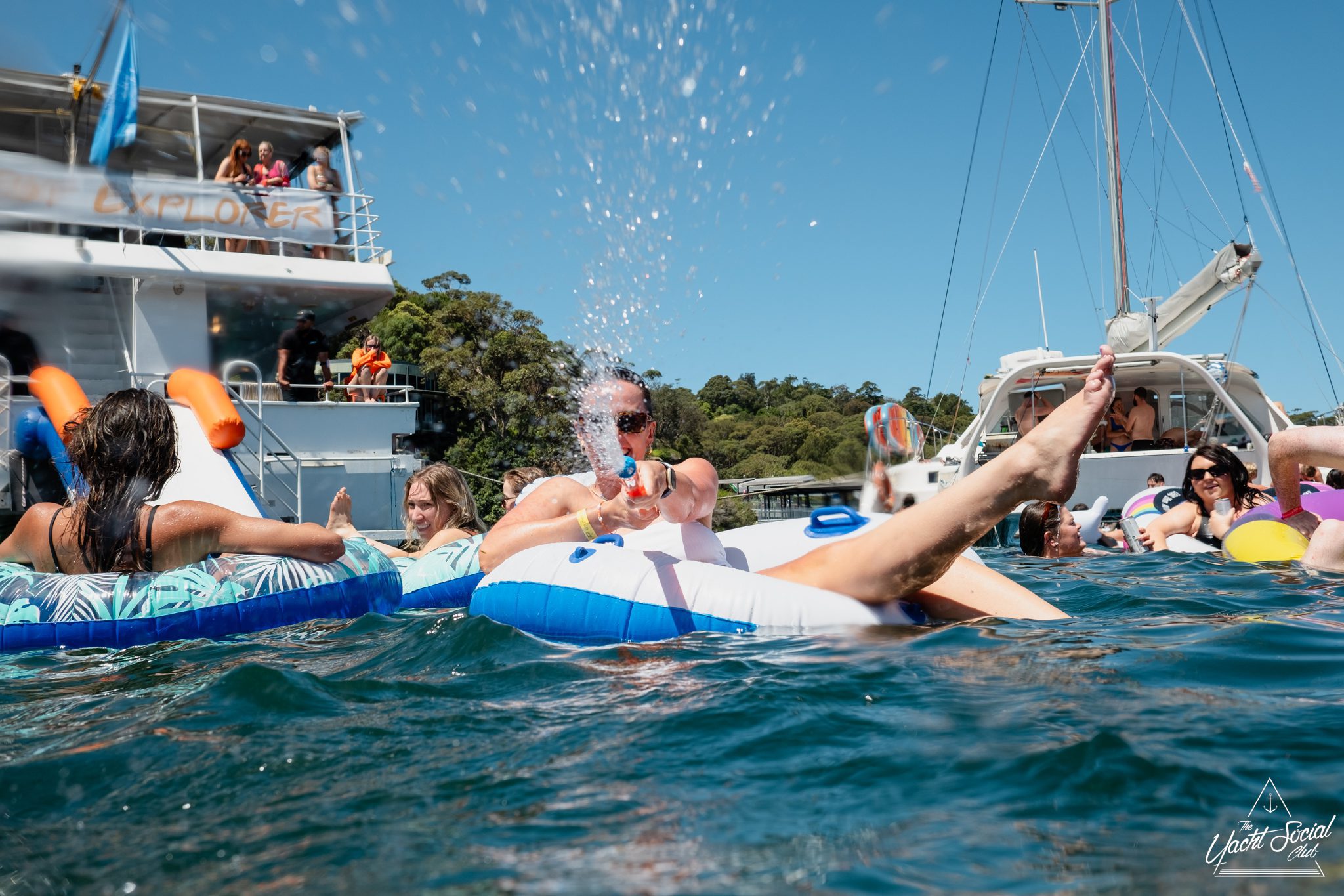 People are enjoying a sunny day on the water, floating on inflatable tubes, with boats in the background. One person is using a water gun, splashing water at what looks like a captivating Catamaran party in Sydney.