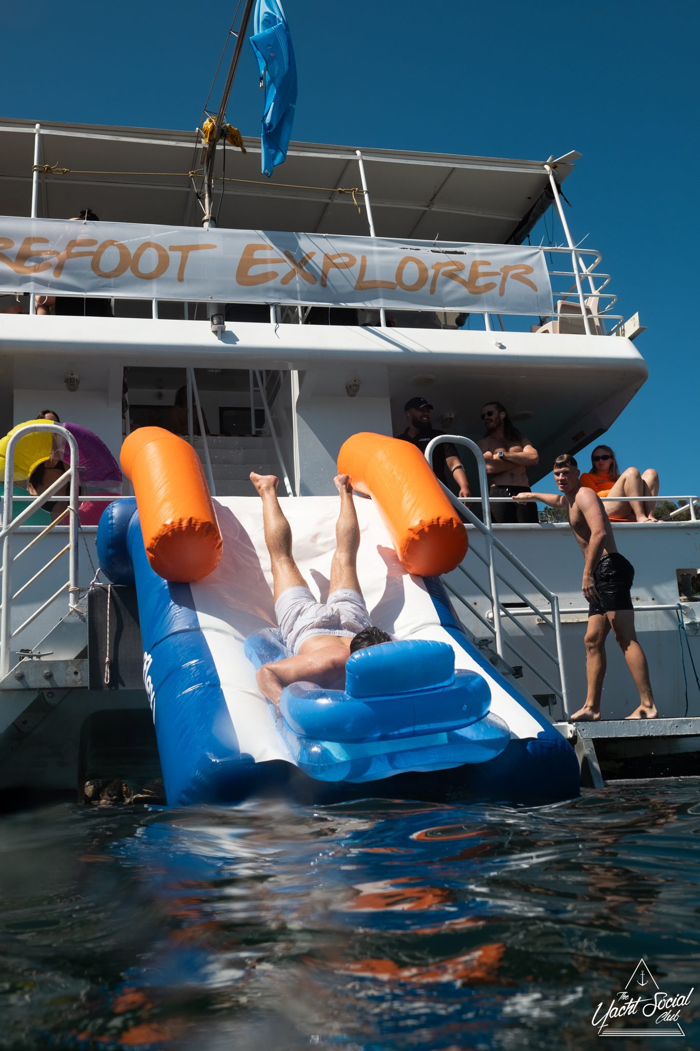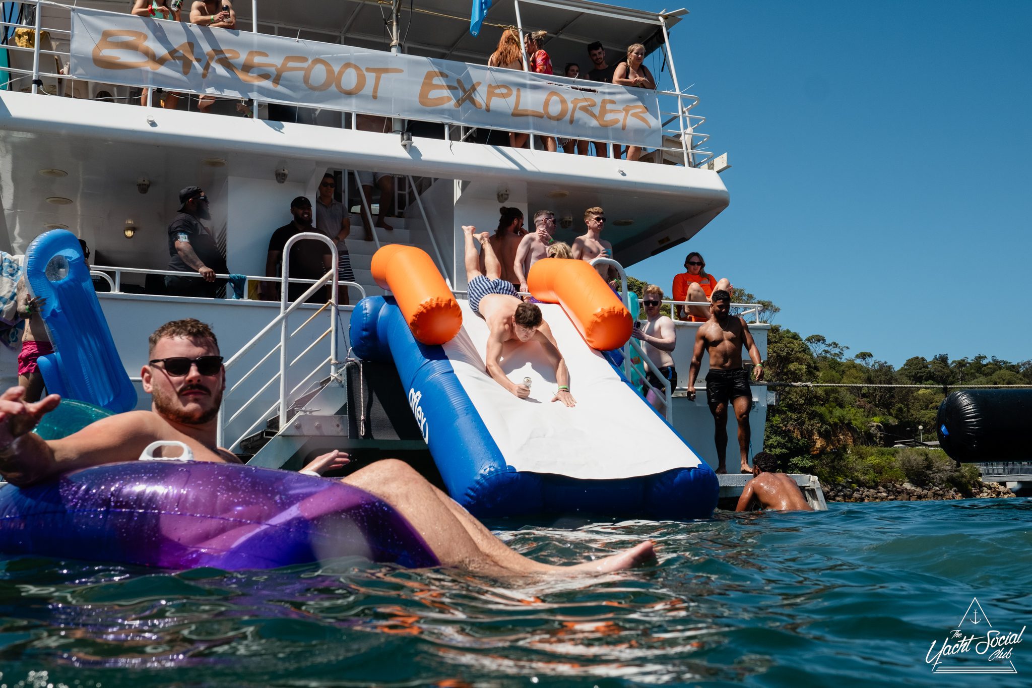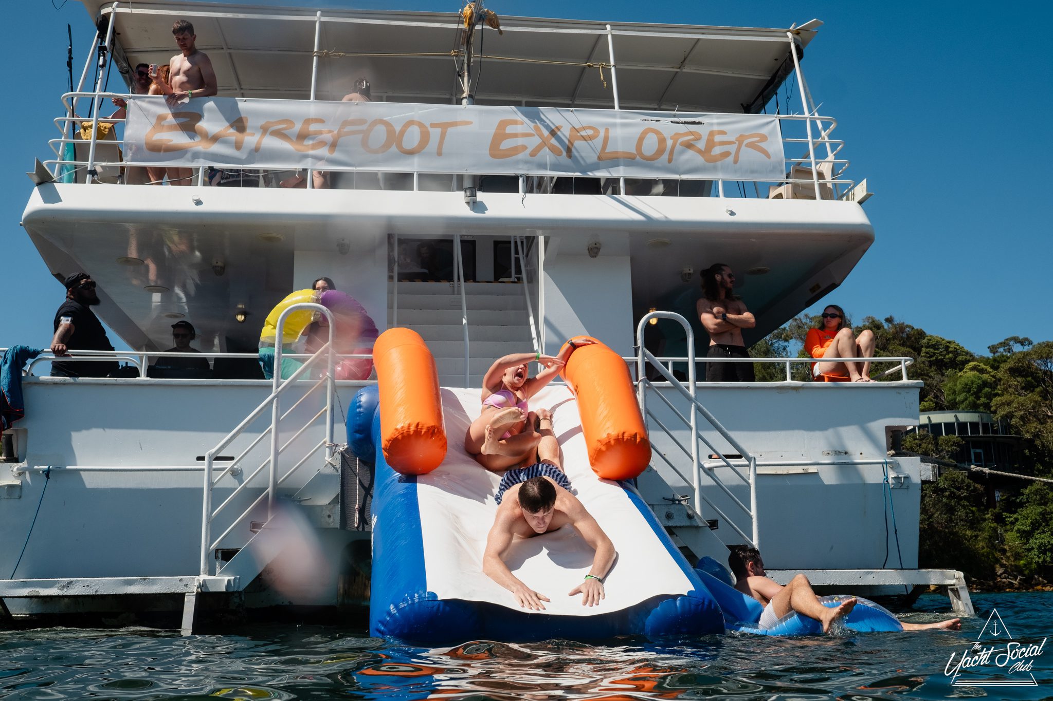 Partygoers slide down an inflatable slide off the back of a boat named "Barefoot Explorer" with others watching from different levels and the water, enjoying a fantastic Sydney boat party hire.