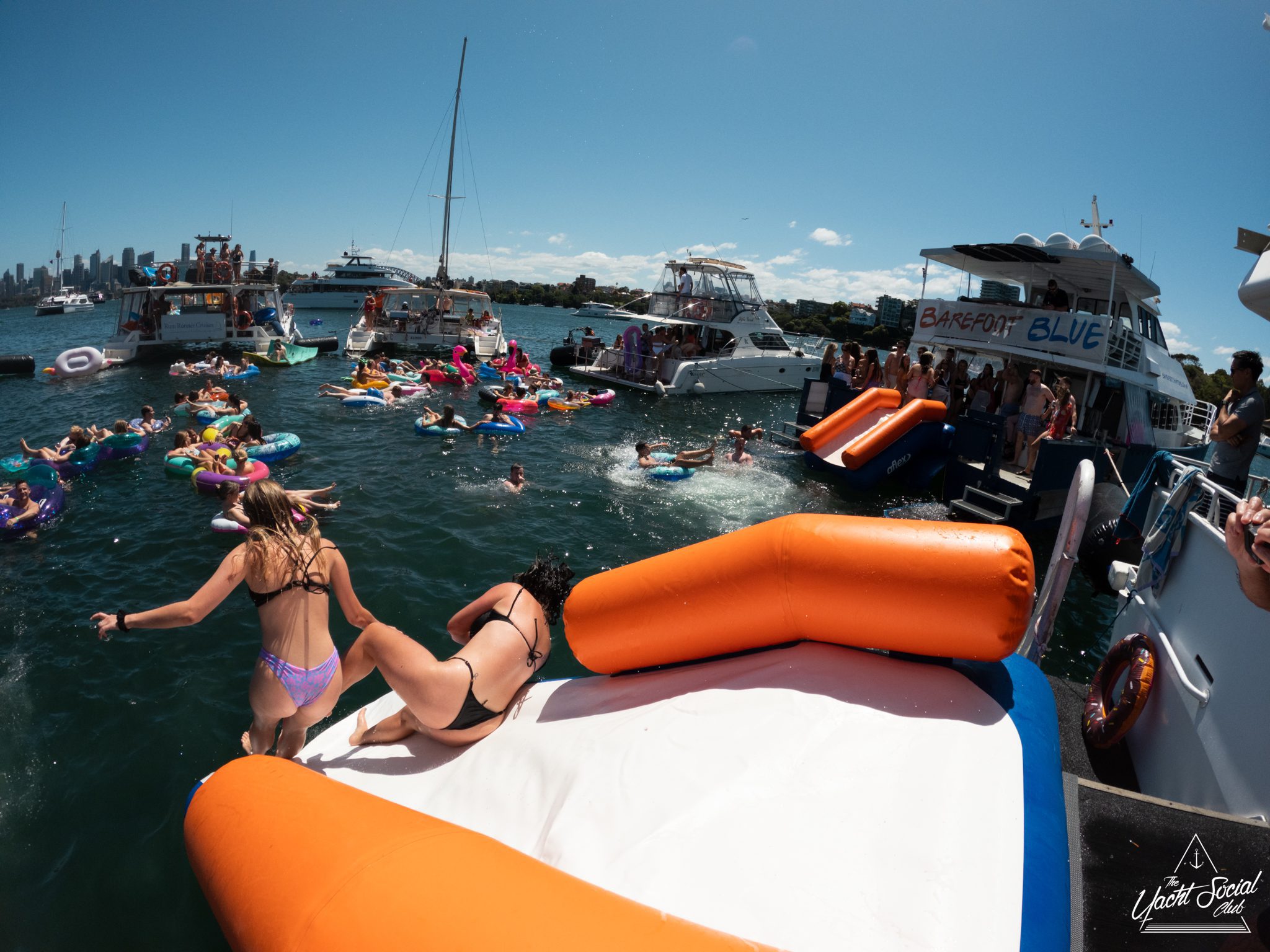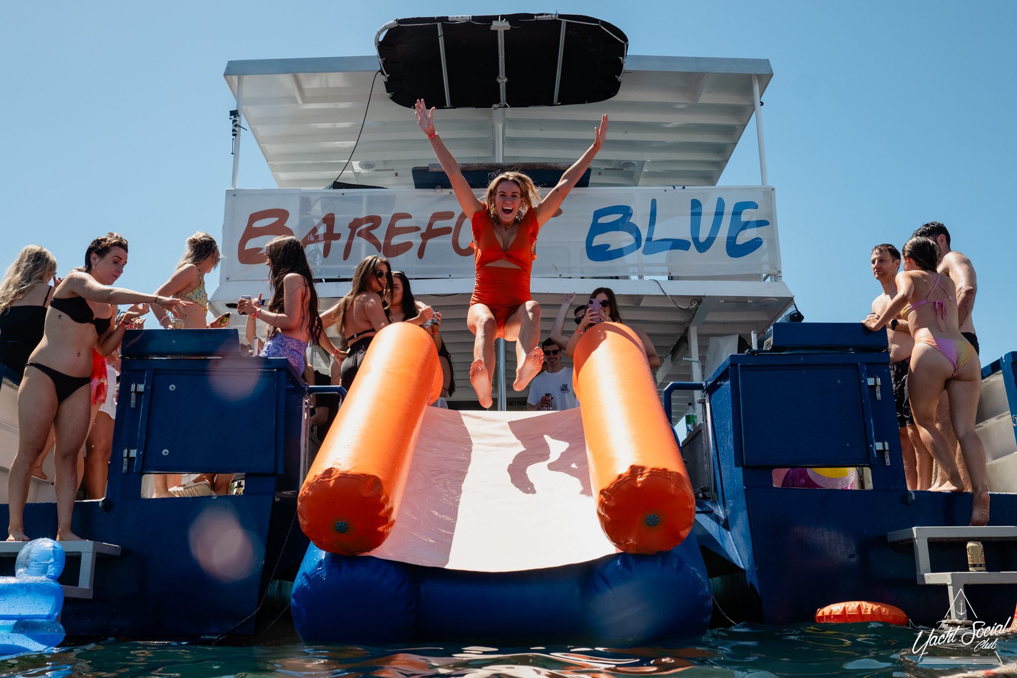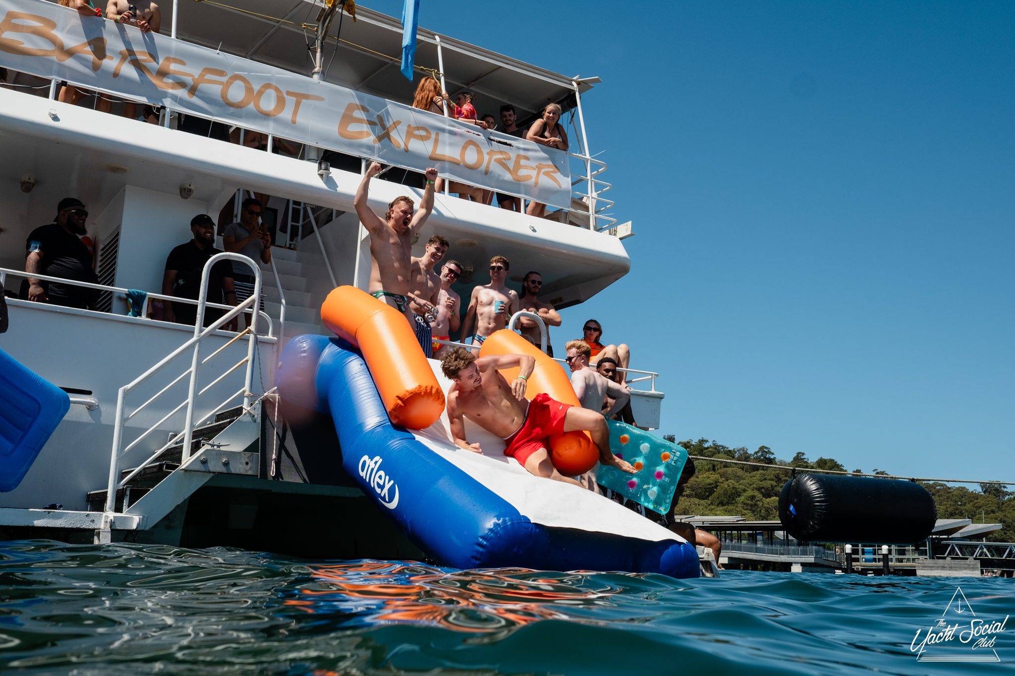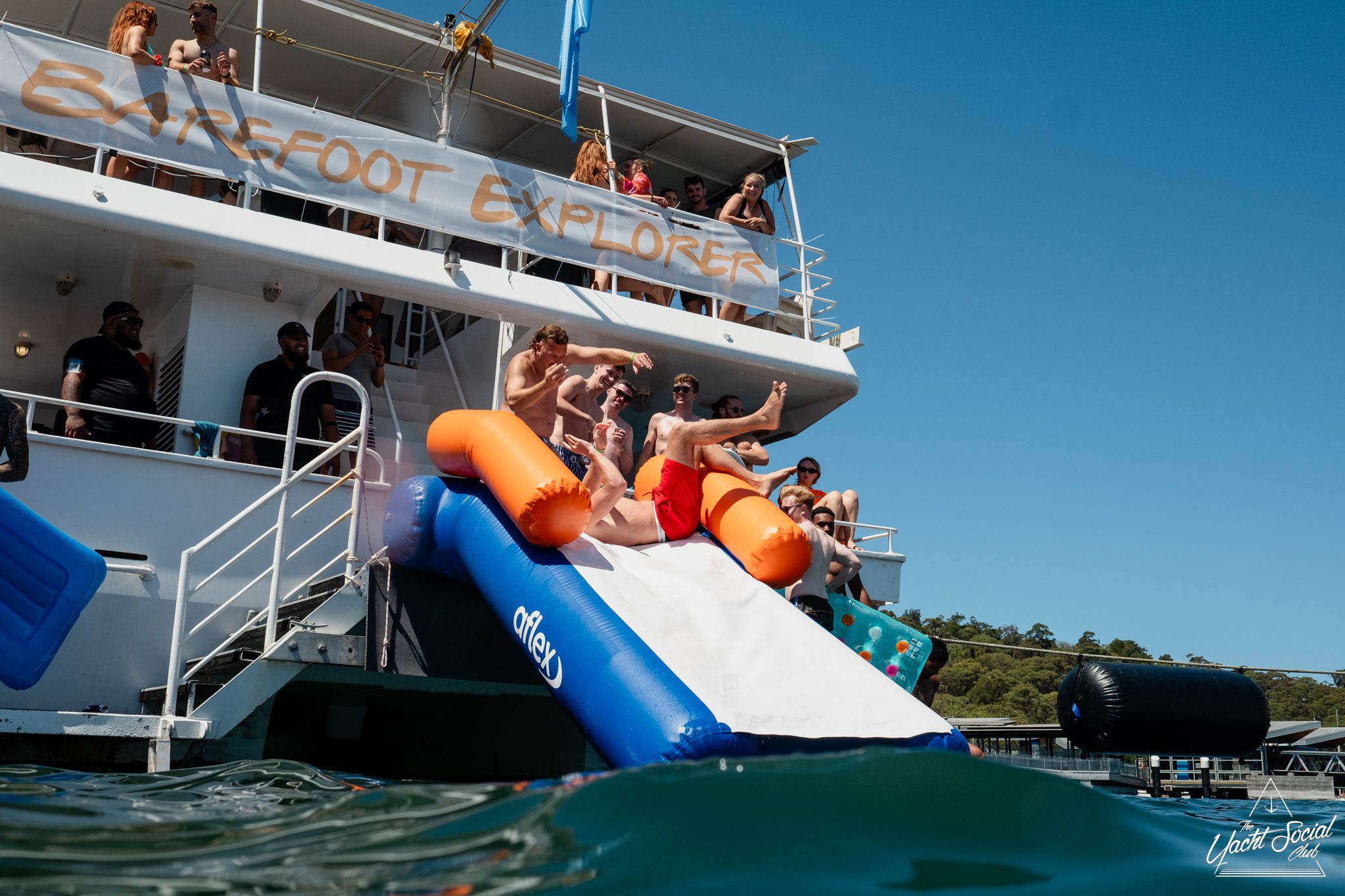 Partygoers slide down an inflatable slide off the back of a boat named "Barefoot Explorer" with others watching from different levels and the water, enjoying a fantastic Sydney boat party hire.