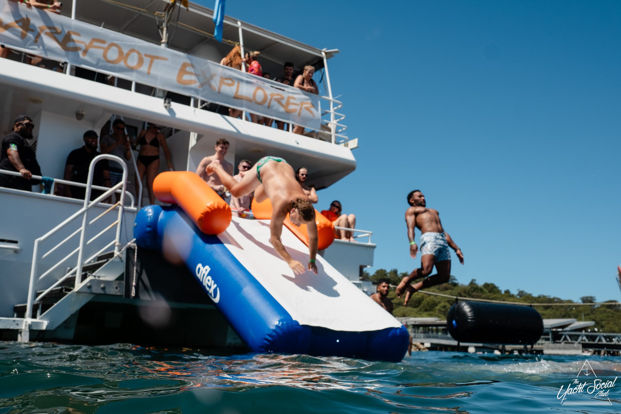 Several people are on the deck of a boat named "Feet Explorer" as some slide off an inflatable slide and others jump into the water, enjoying a corporate boat event in Sydney.