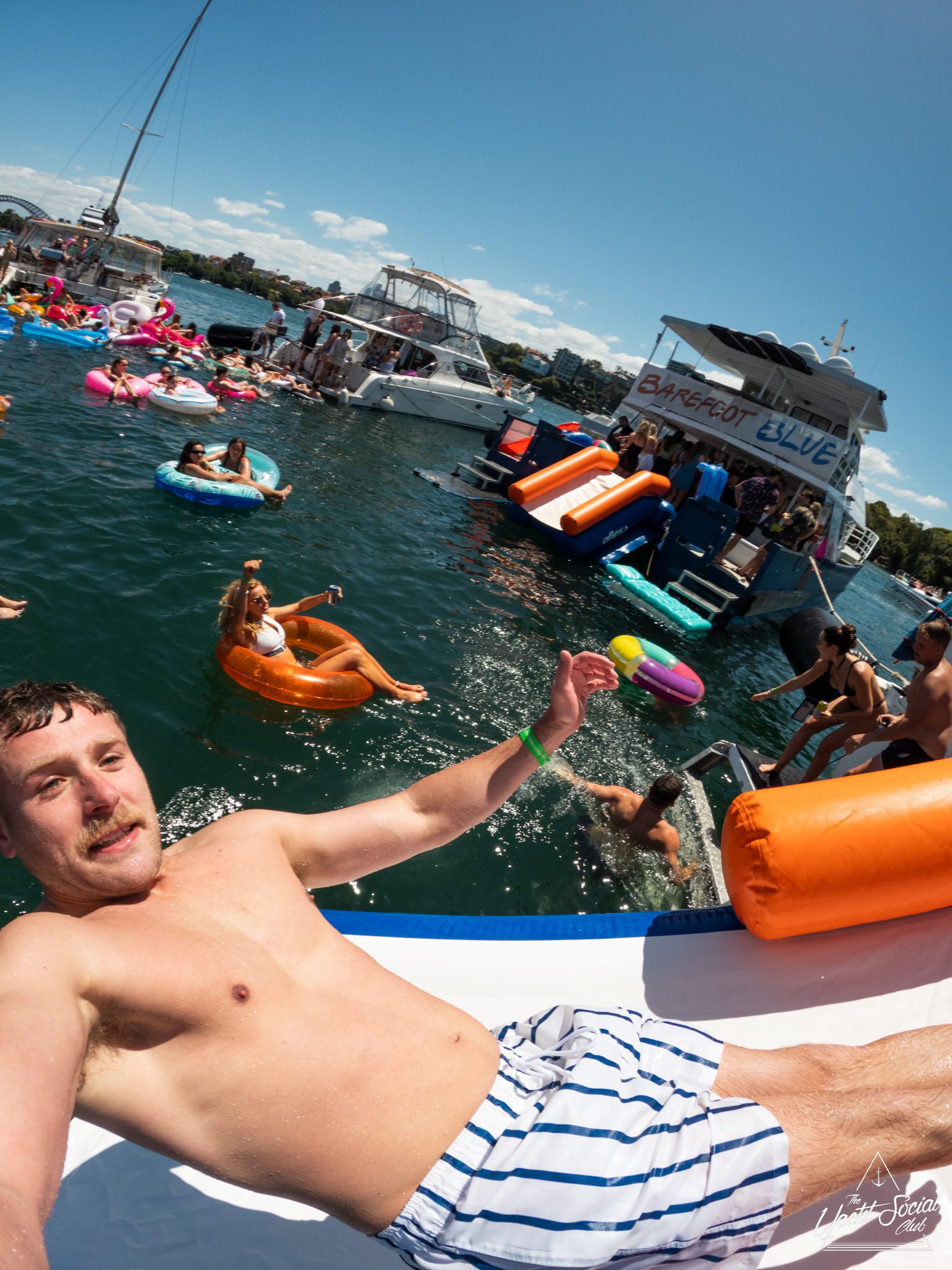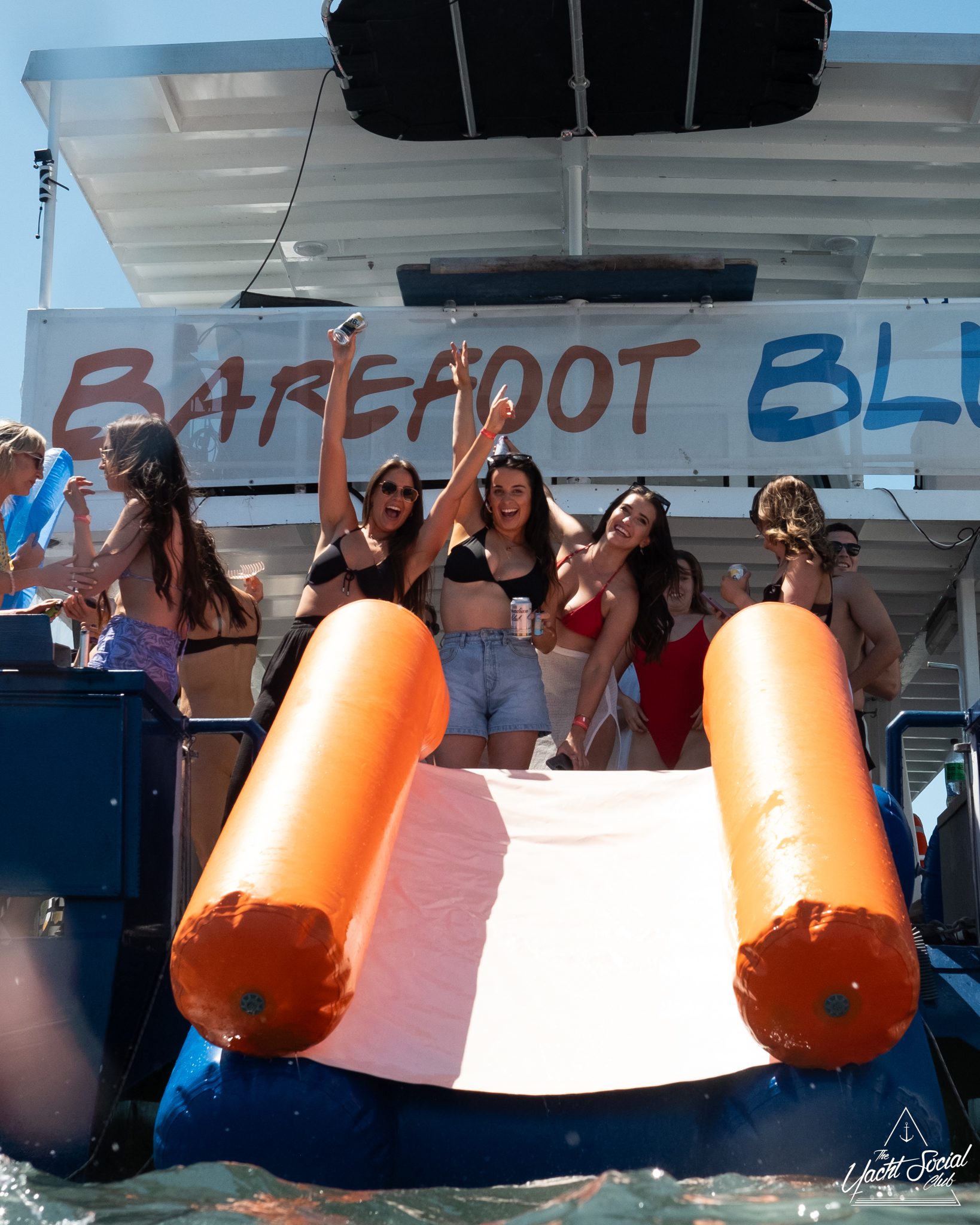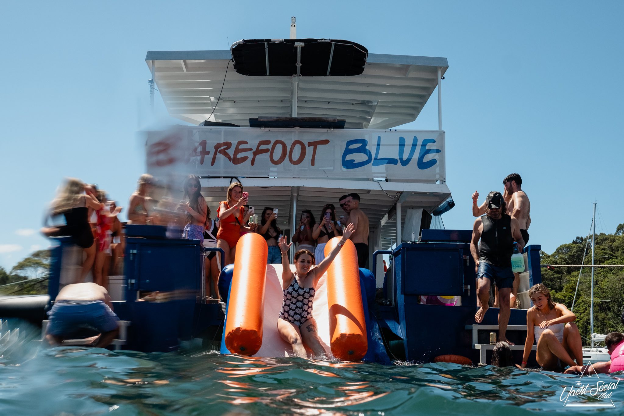 People enjoying a sunny day on a boat named "Barefoot Blue." Some passengers are using the slides to enter the water while others are lounging and socializing on the boat. Experience an unforgettable time with Sydney boat party hire, combining fun and relaxation in one amazing outing.