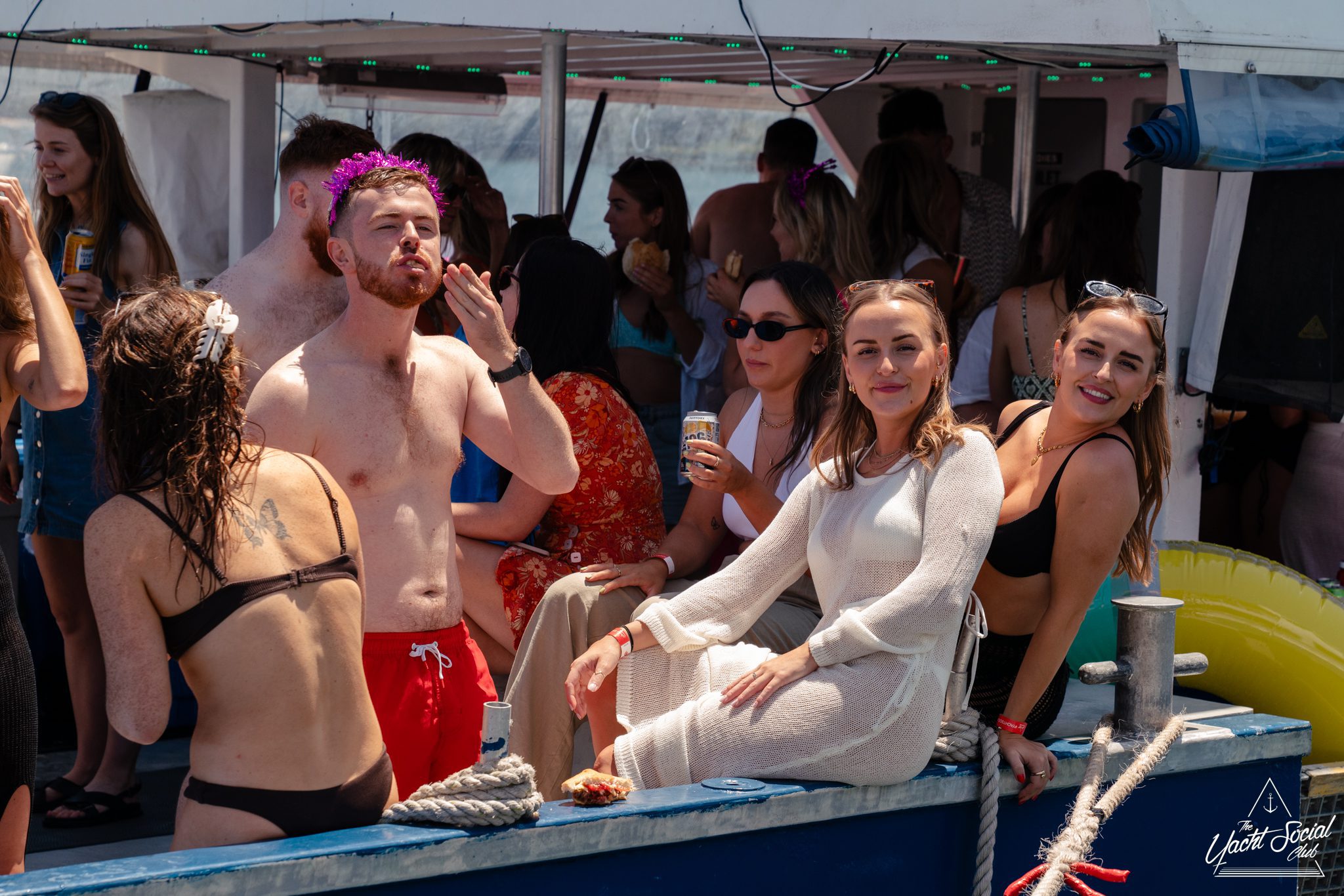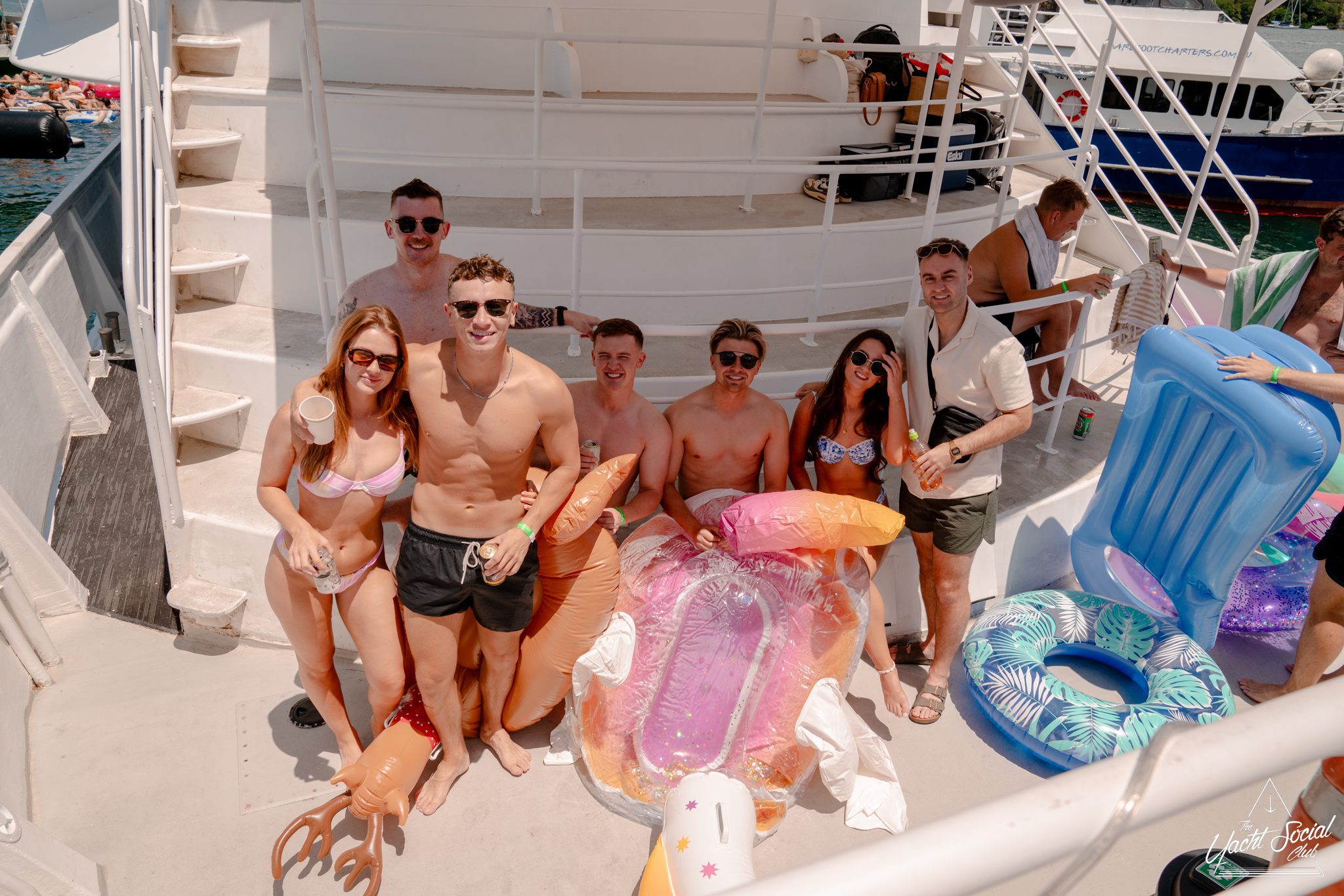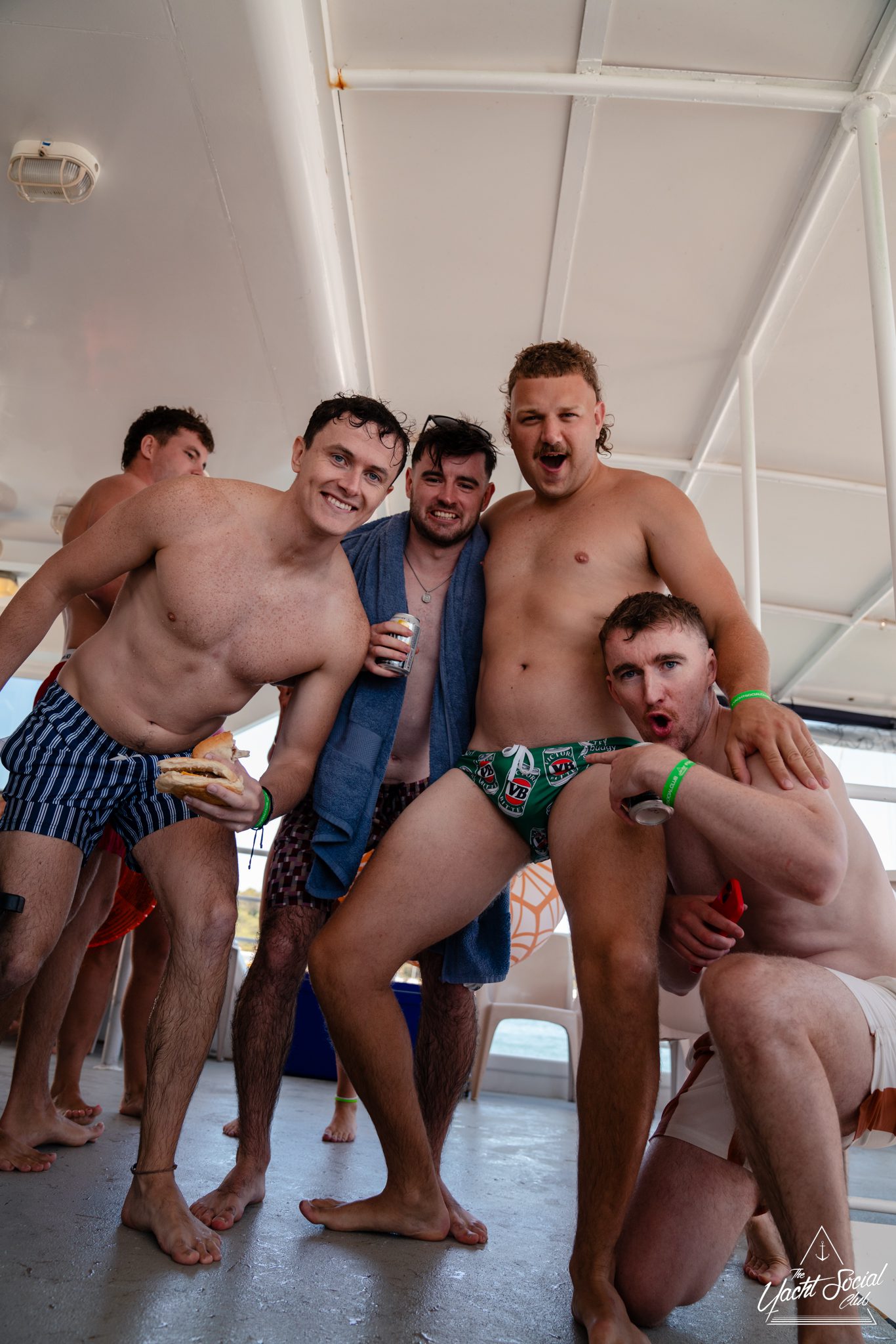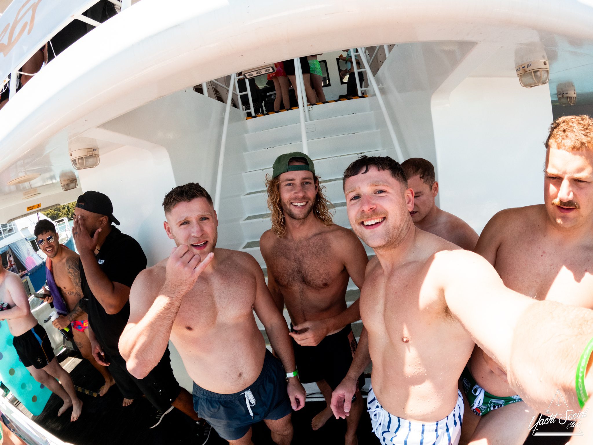 A lively group of people enjoy a boat party on a sunny day. In the foreground, three shirtless men wearing shorts, sunglasses, and hats pose with drinks. The deck is vibrant with others relaxing and mingling under the clear blue sky and calm waters in the background.
