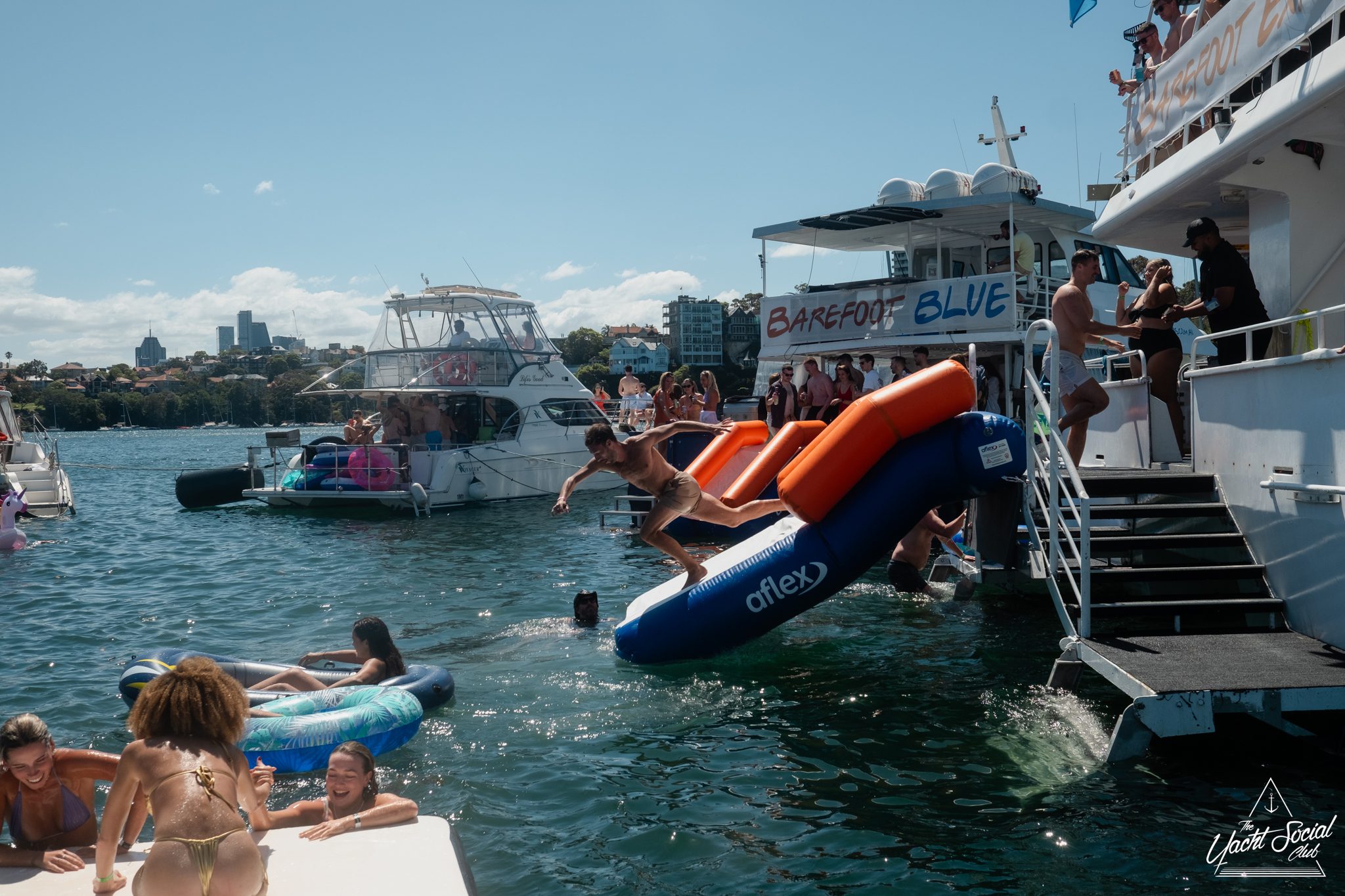 A woman in a red swimsuit is sliding down an inflatable slide into the water from a boat with a "Barefoot Blue" banner. Other people in swimsuits are on the private yacht charter in Sydney Harbour, watching and enjoying the scene.