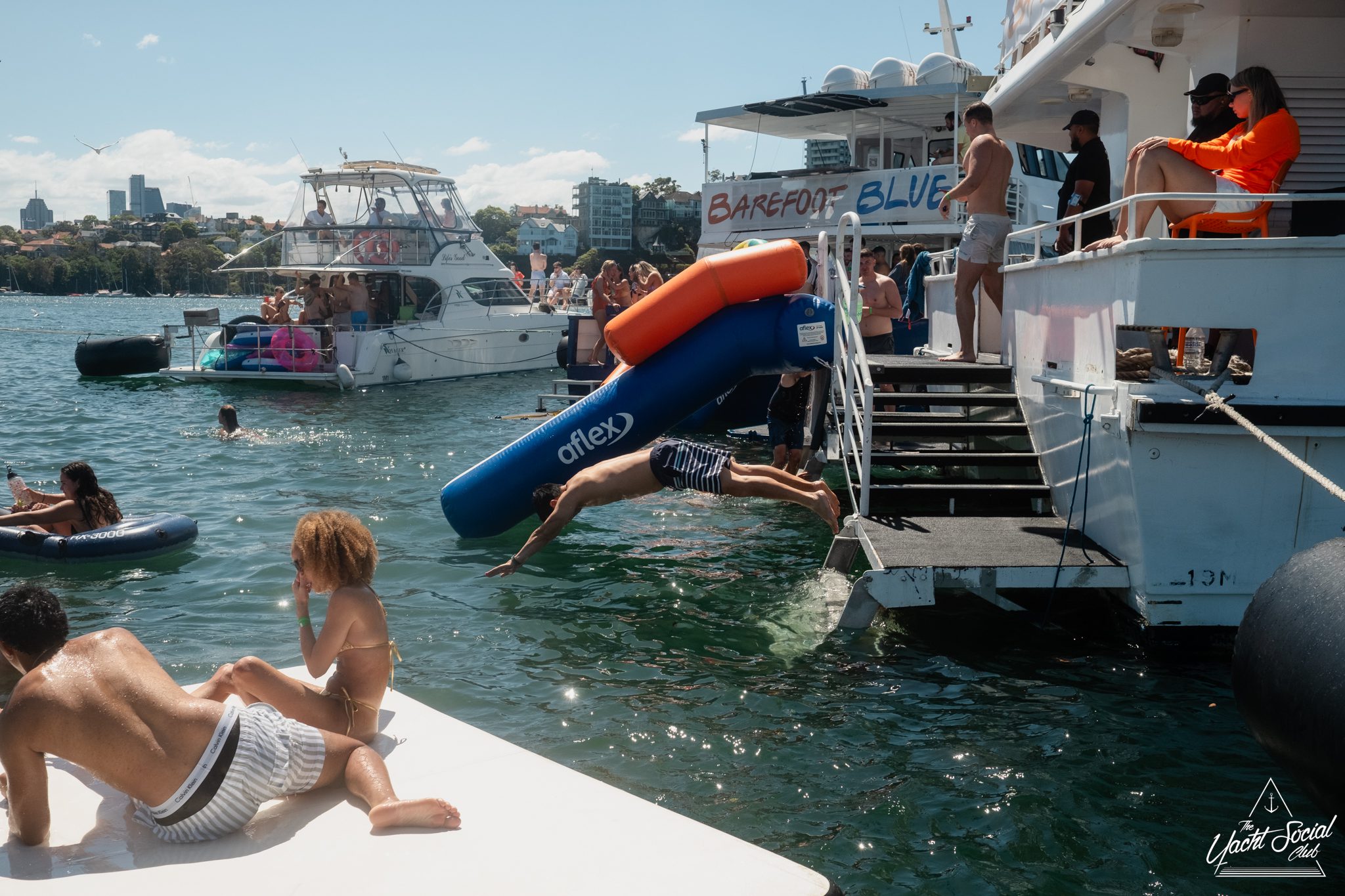 A man slides into the water from a boat with "Barefoot Explorer" written on a banner. Others are using inflatables and socializing on the boat and in the water on a sunny day, enjoying a luxury yacht hire Sydney experience.