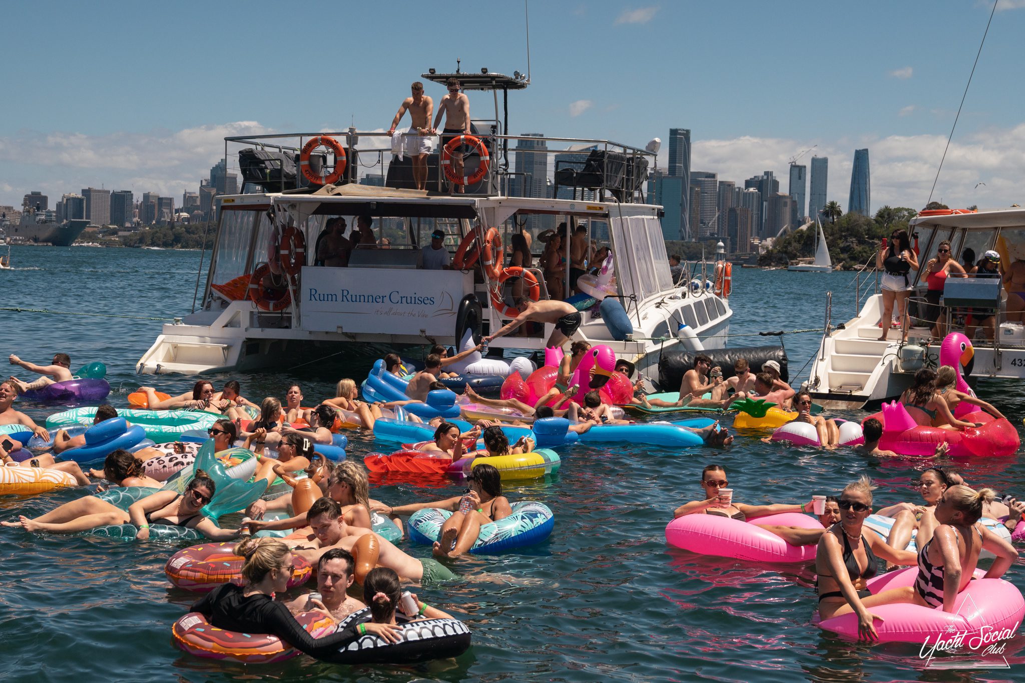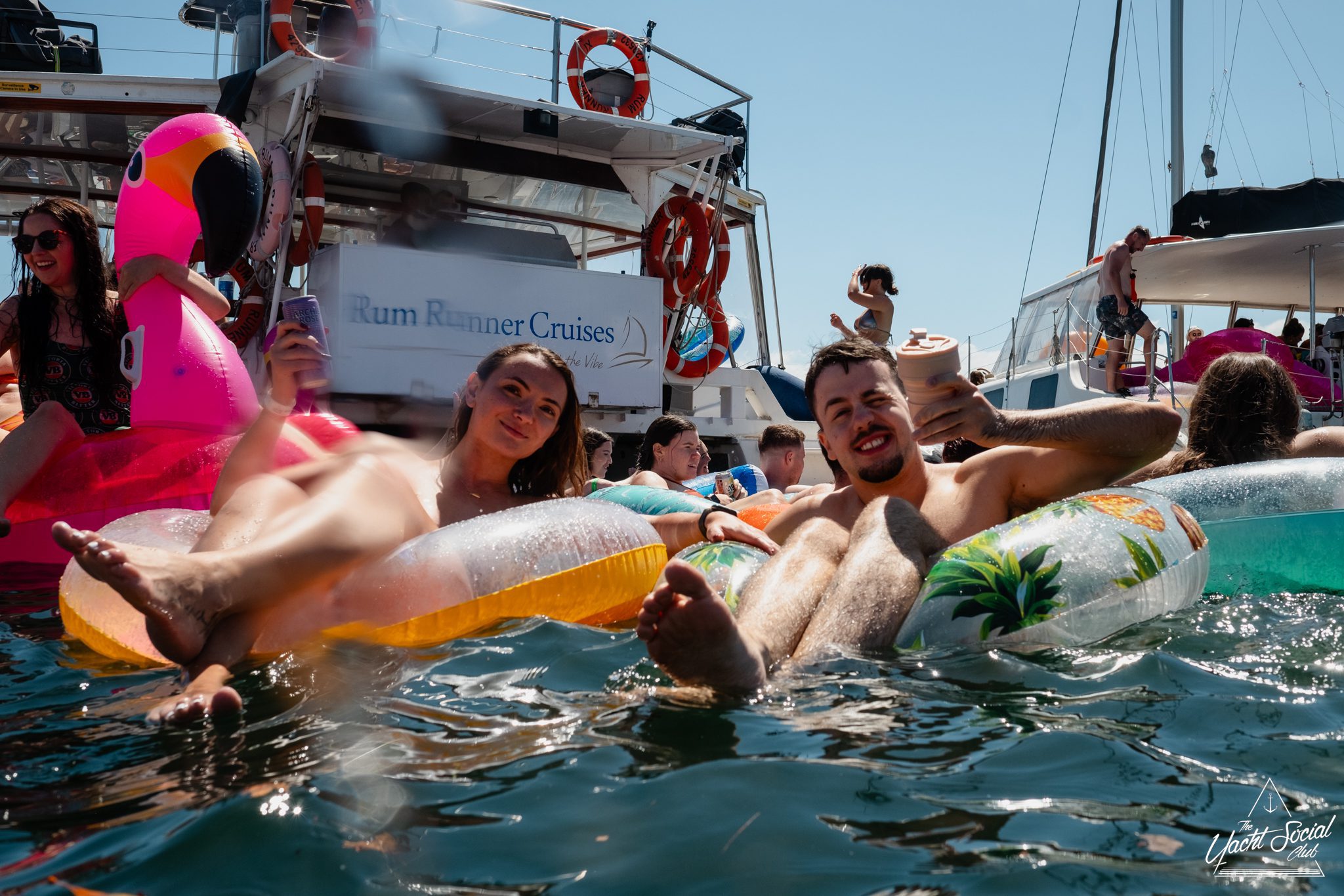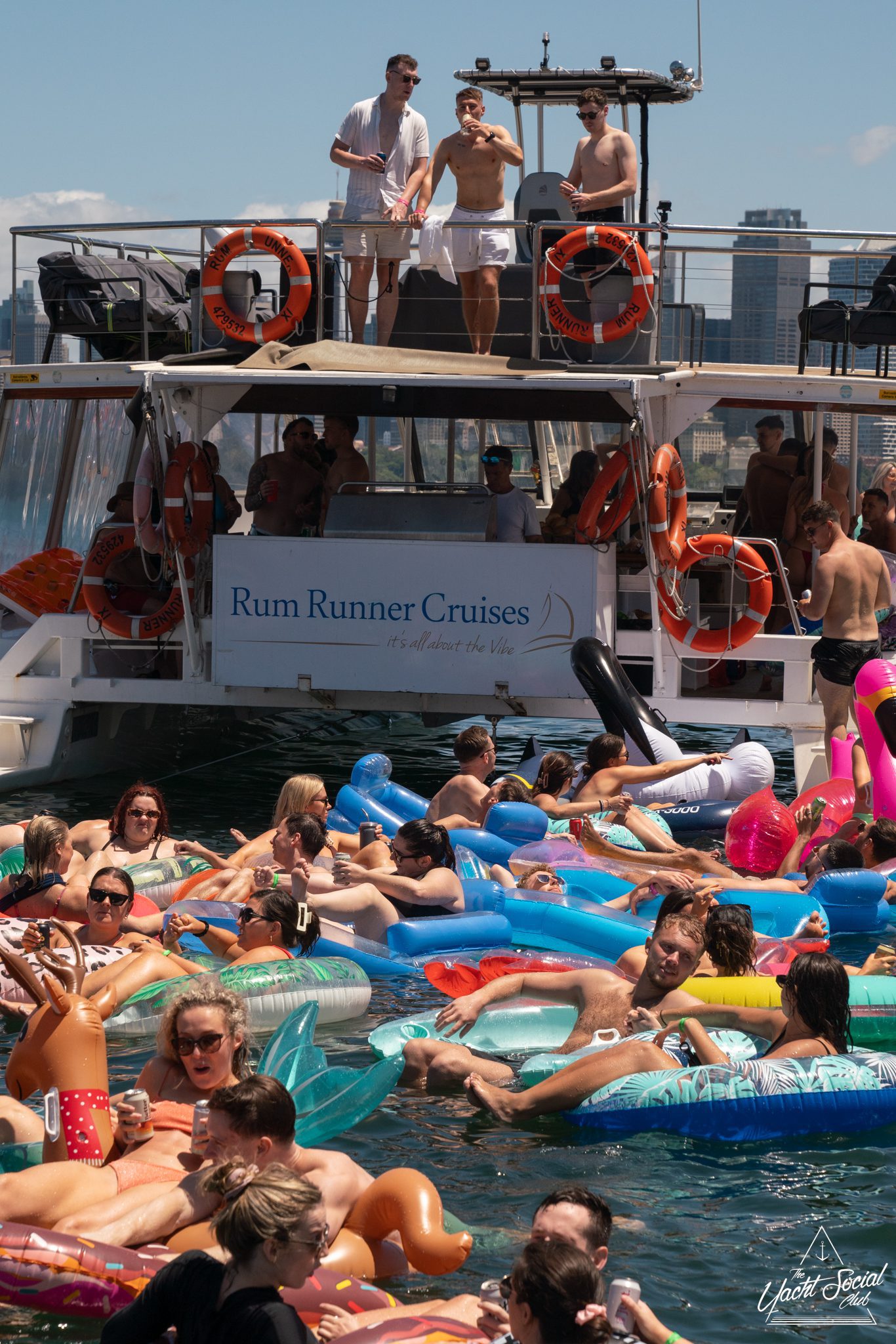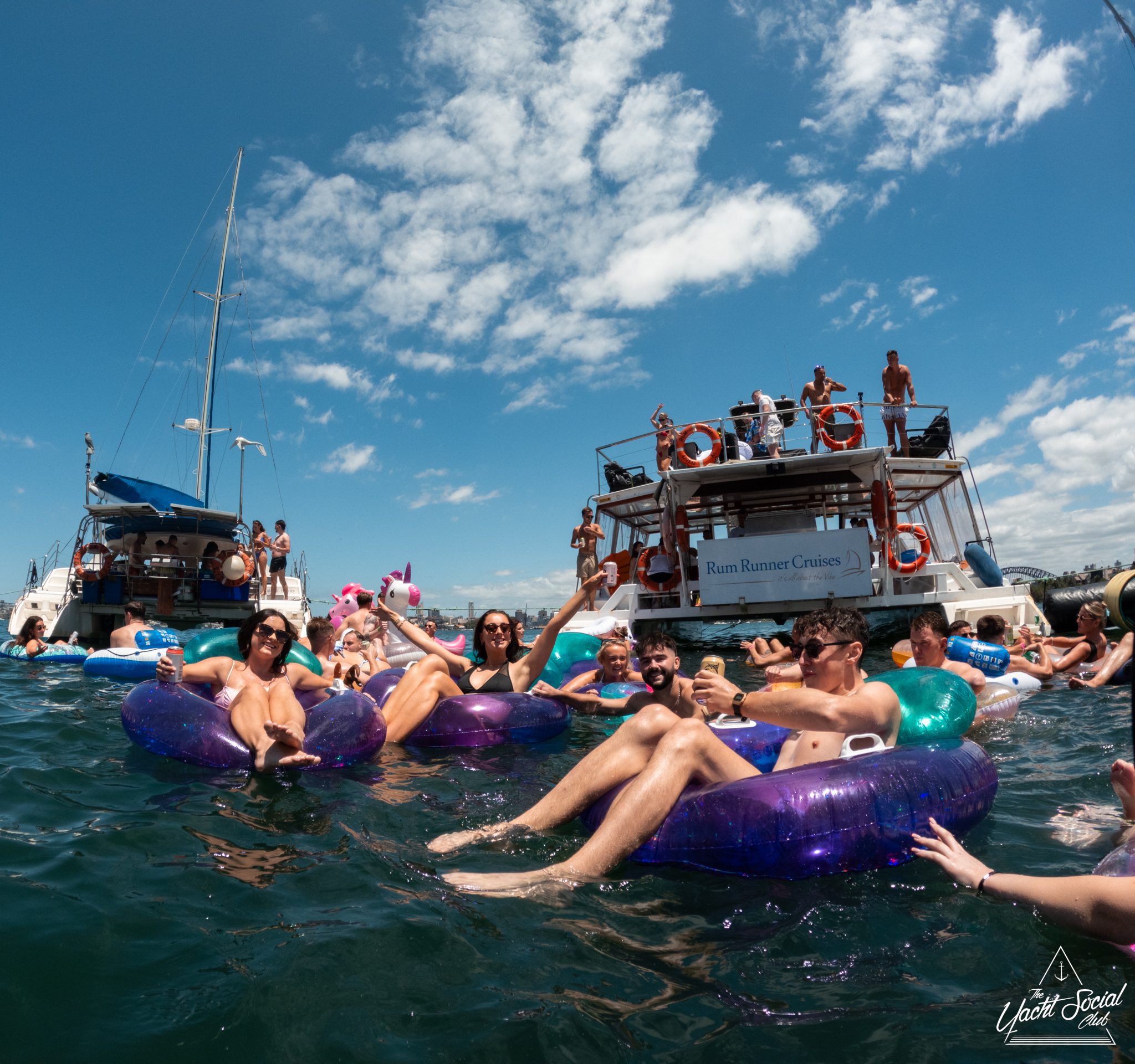 People relaxing on inflatable floats in the water near a boat with a "Rum Runner Cruises" sign on a sunny day. Consider adding some excitement to your outing with DJ boat hire Sydney or opt for luxury yacht hire Sydney.