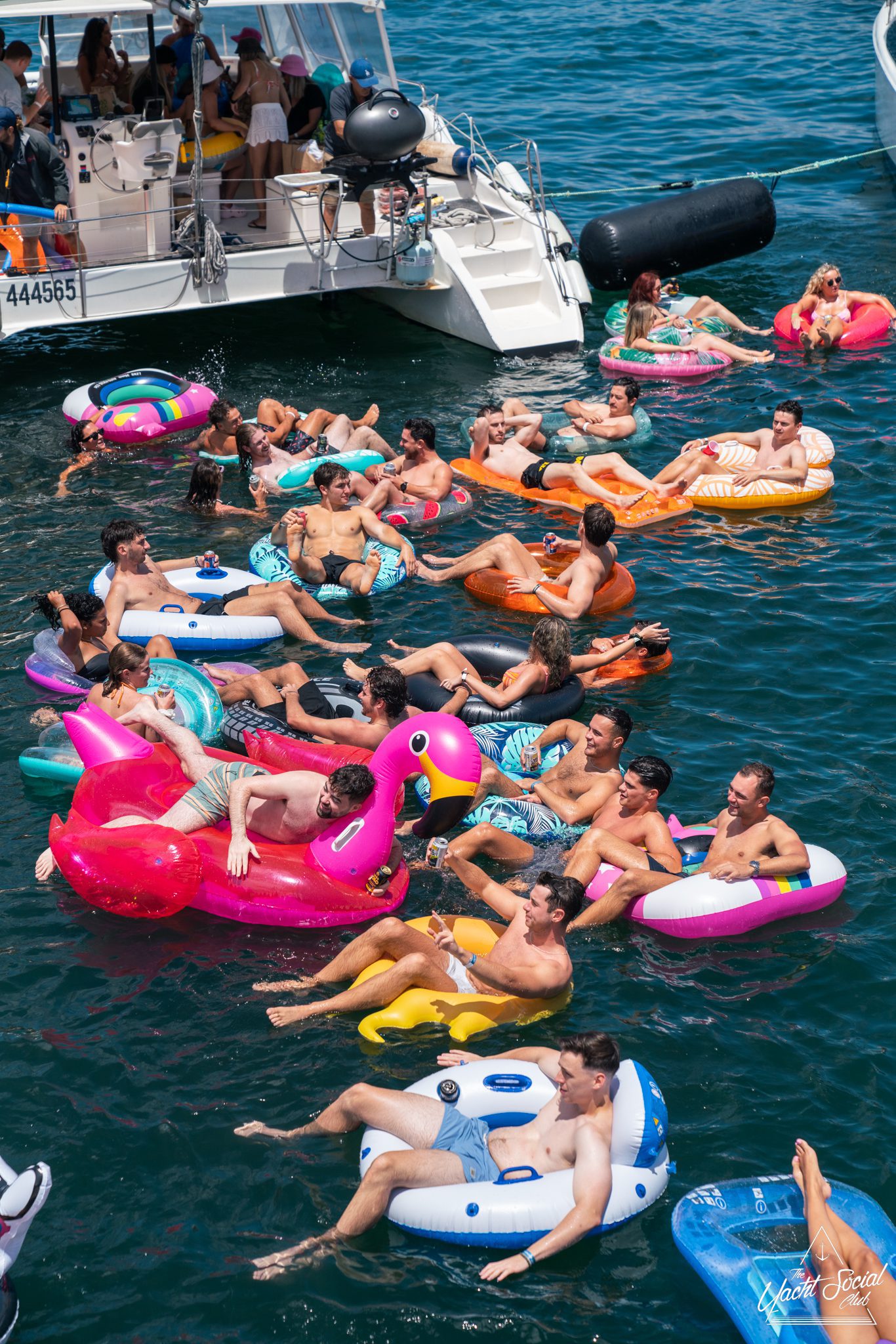 People relaxing and socializing on colorful floaties in the water with sailboats and yachts in the background on a sunny day. The scene is lively with clear blue skies and vibrant water, featuring individuals enjoying drinks and floating near an anchored catamaran.
