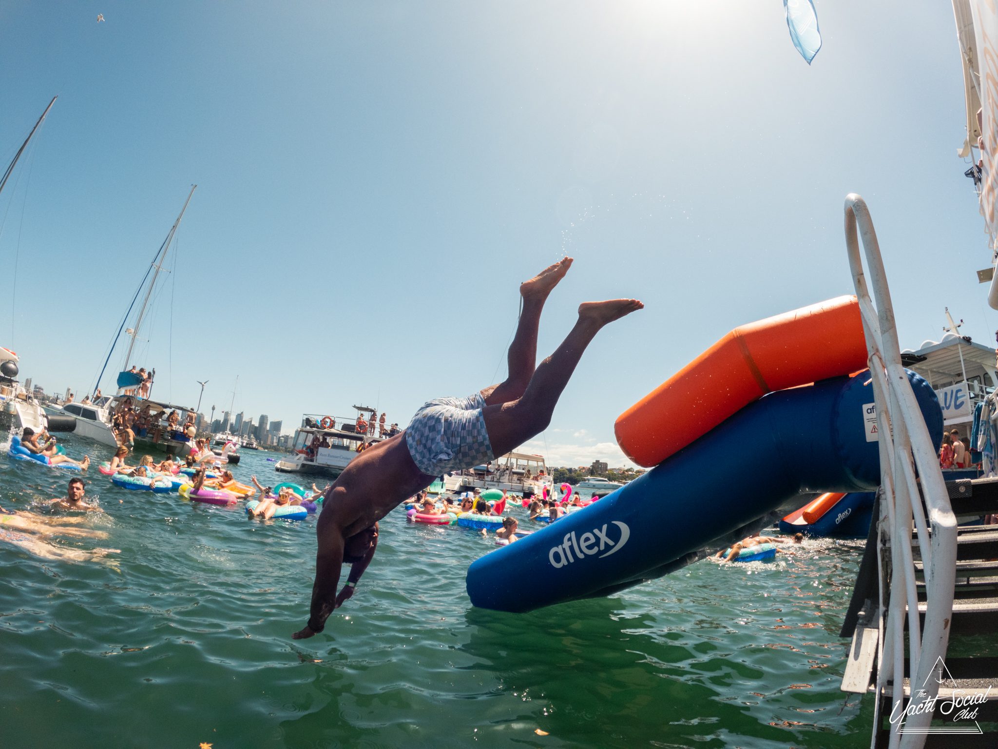 A person is diving off an inflatable water slide into a body of water surrounded by luxurious yachts. Several people are on the boats, some standing and others sitting, with a stunning cityscape visible in the background, showcasing the allure of private yacht charters in Sydney Harbour.