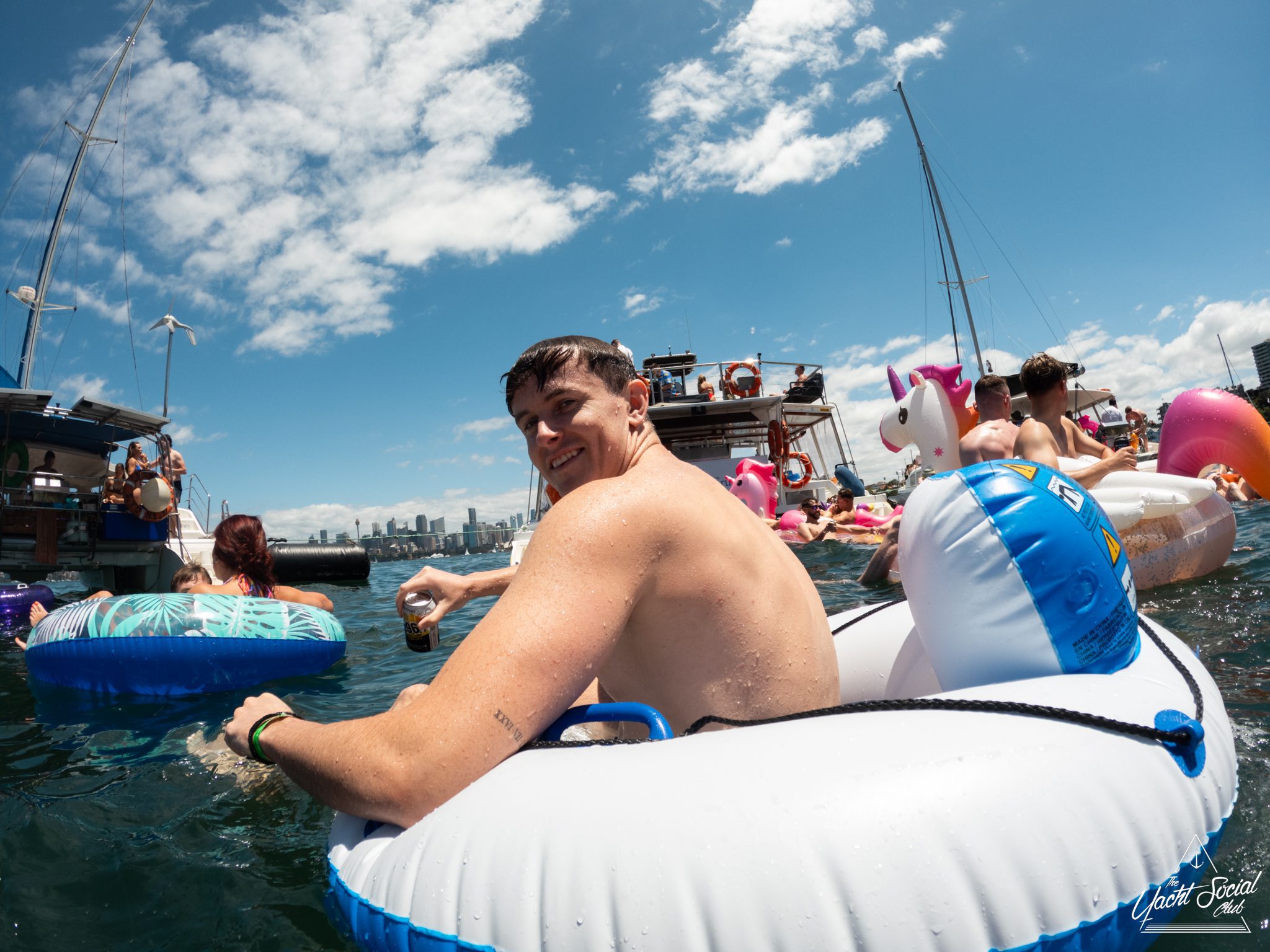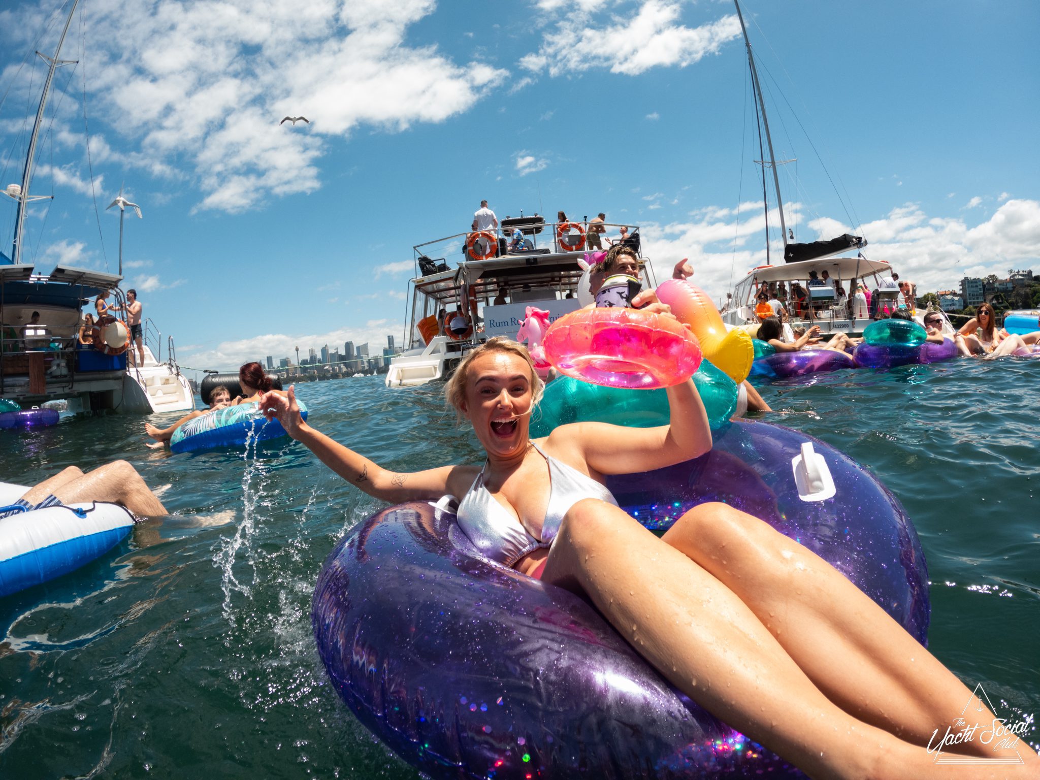 People are floating on inflatable pool toys in the water next to several boats on a sunny day in a coastal city, enjoying the vibrant atmosphere with DJ boat hire Sydney setting the perfect party mood.