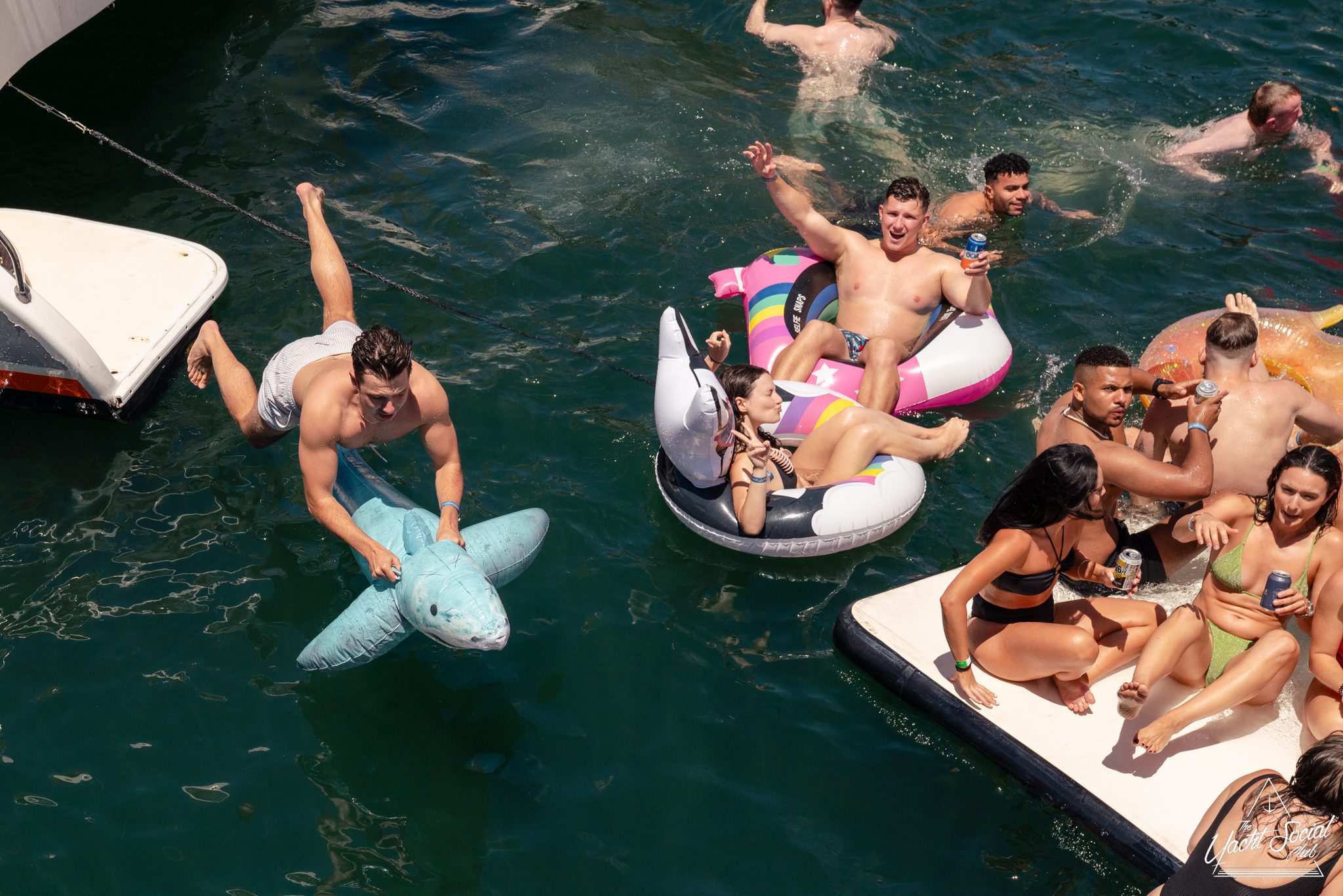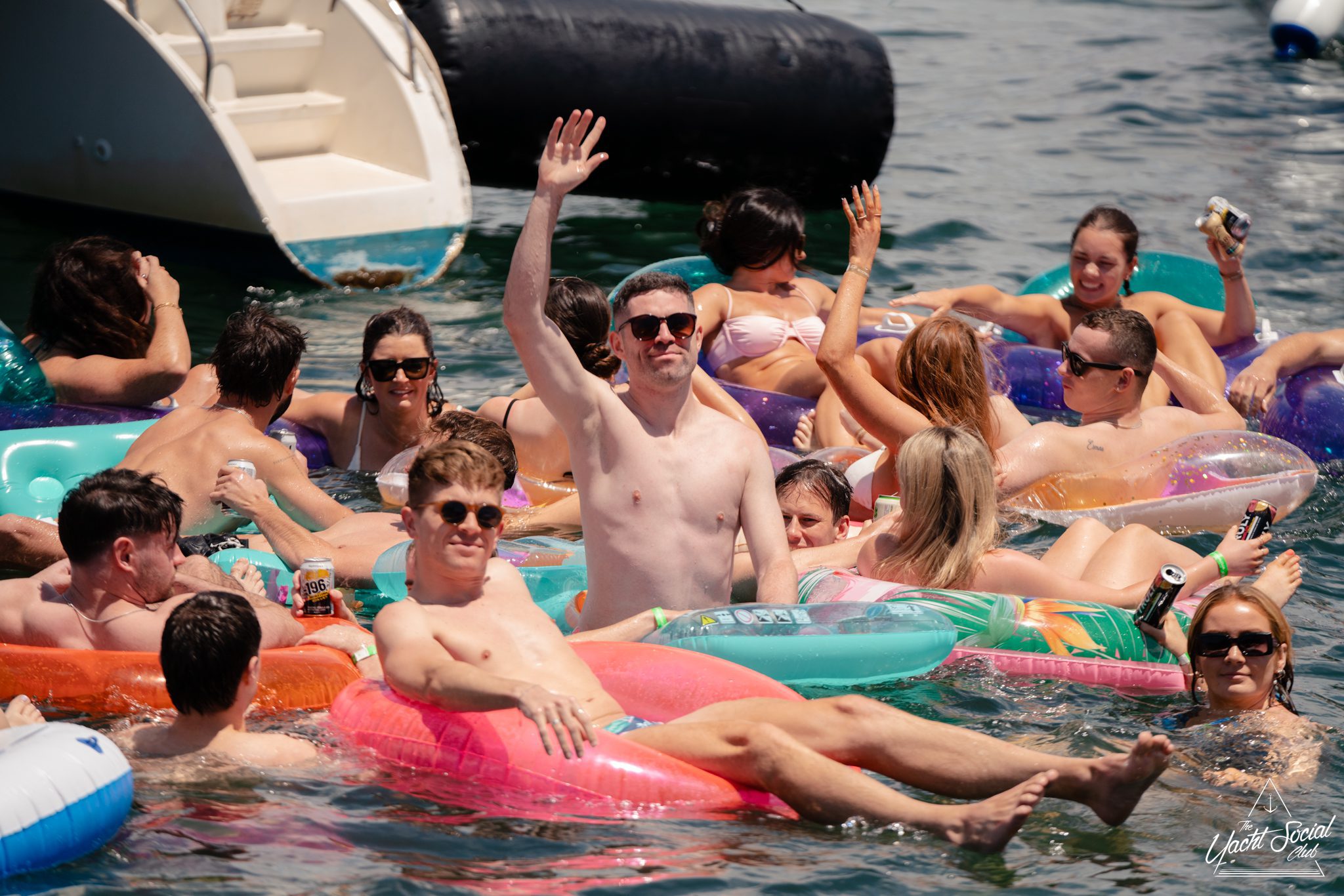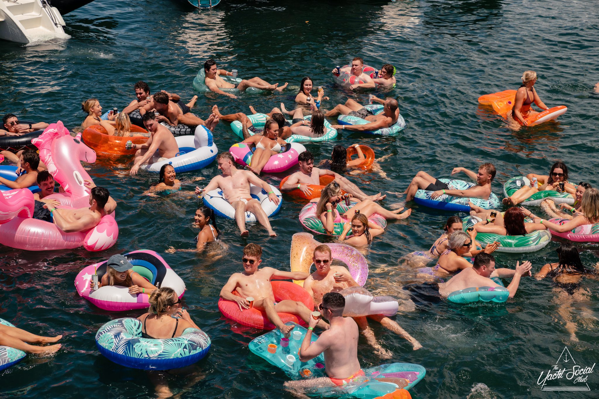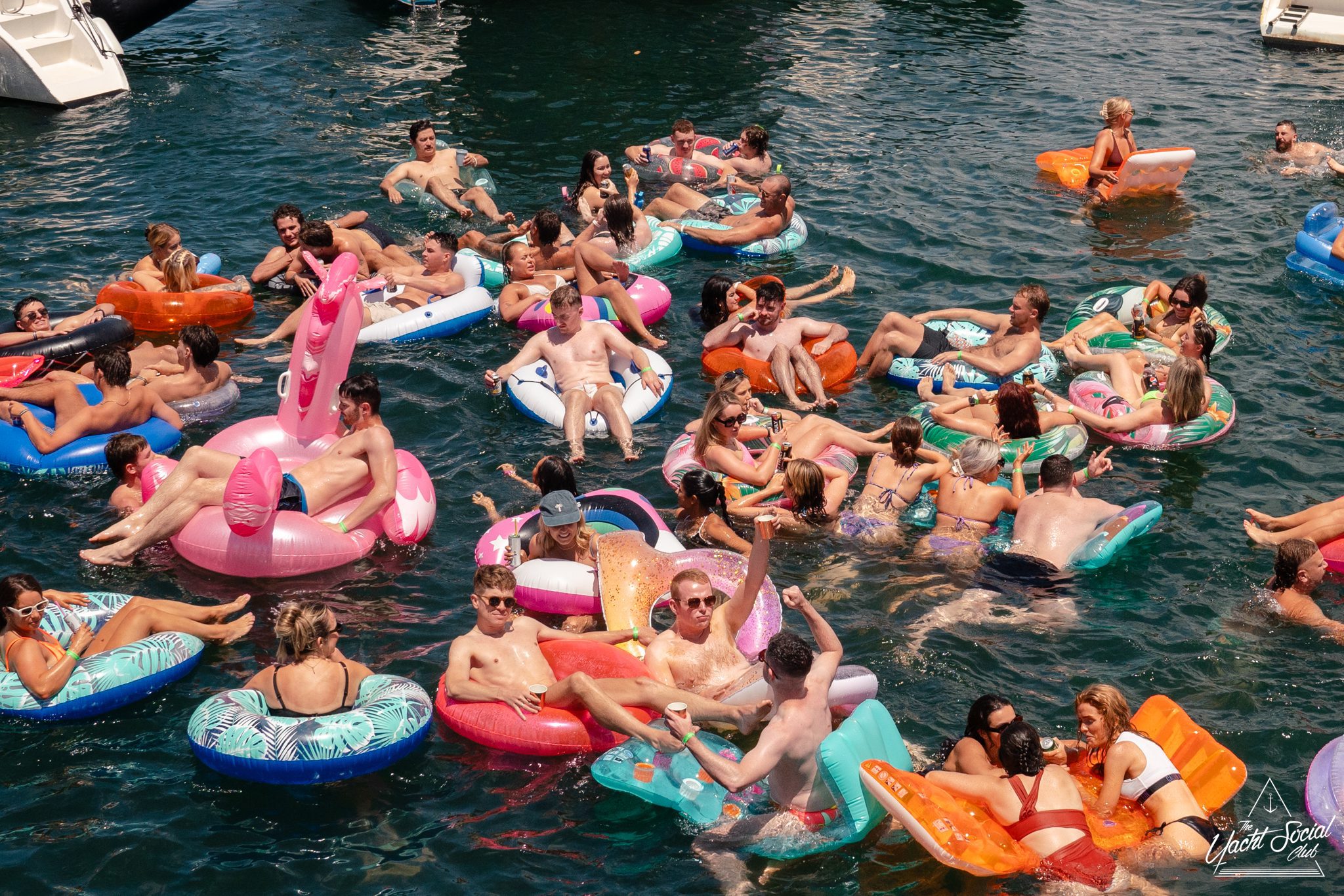 A group of people in swimsuits enjoying a sunny day on various inflatable floats in the water, with luxury yachts and boats in the background.