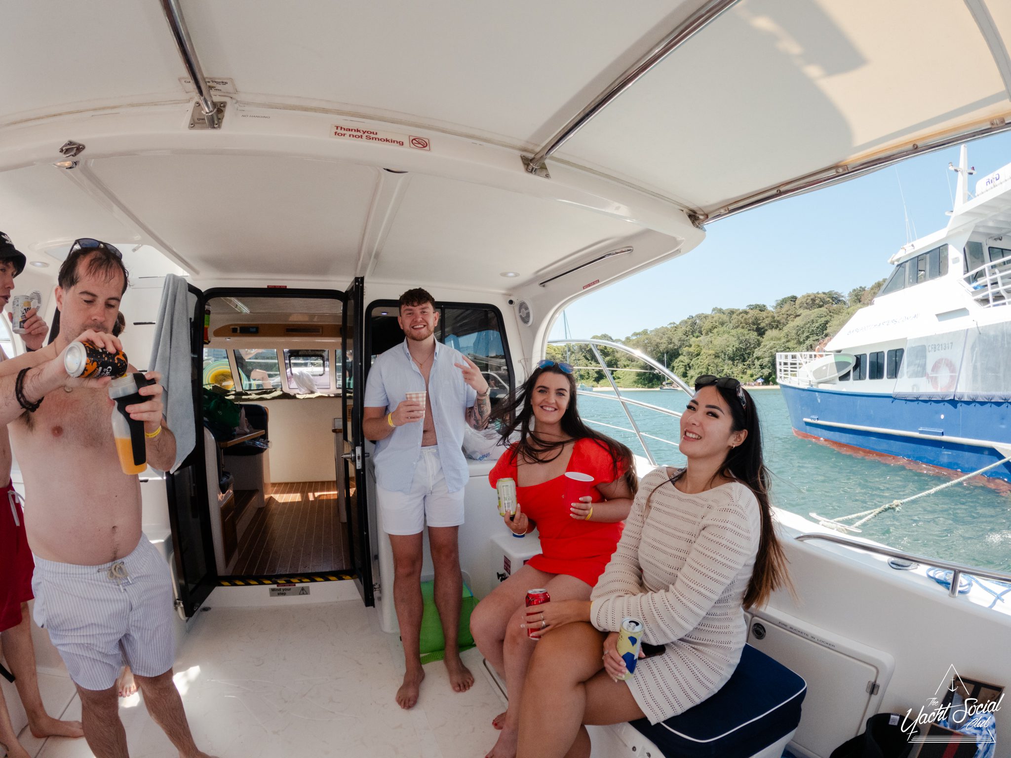 Group of people in swimwear on a boat under sunny skies, enjoying drinks and celebrating. Some are posing and smiling for the camera with buildings visible in the background, highlighting the joy of a private yacht charter Sydney Harbour experience.