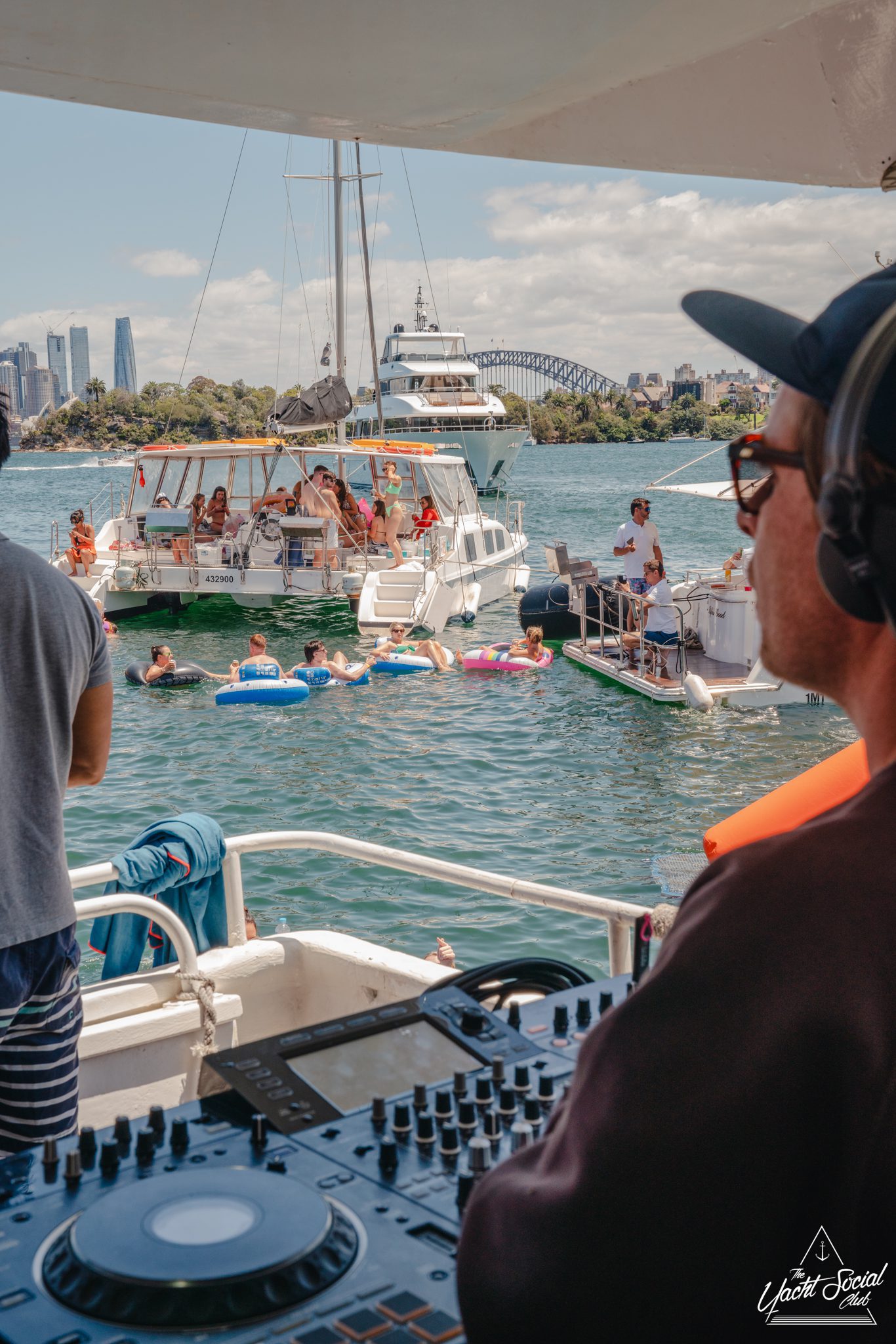 A group of people floating on colorful inflatables in the water, surrounded by boats, and enjoying a sunny day, with a lively DJ boat hire Sydney adding to the fun atmosphere.