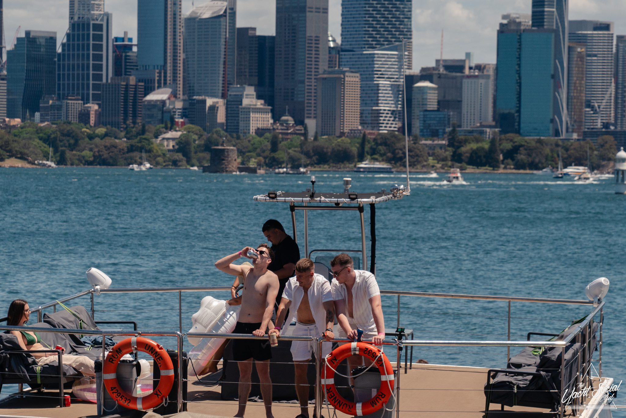 A group of people in swimwear relax and pose on the back deck of a catamaran during a sunny day around Sydney Harbour, with some sitting and others standing.