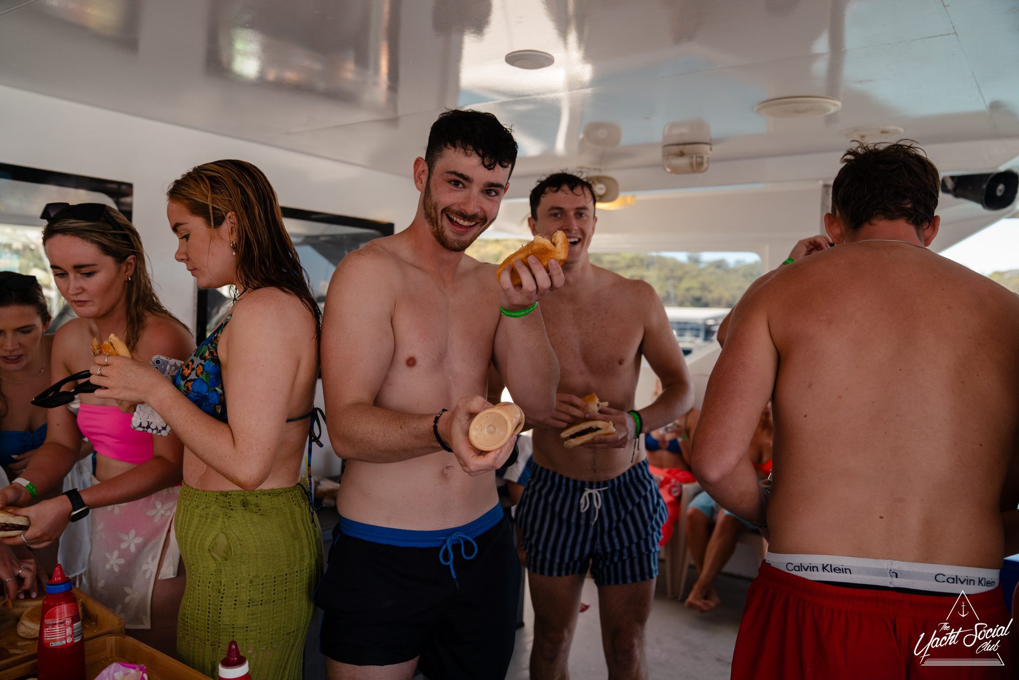 A group of people in swimwear sit and lounge on a boat deck under sunny weather, holding drinks and smiling, enjoying a lively catamaran party in Sydney.
