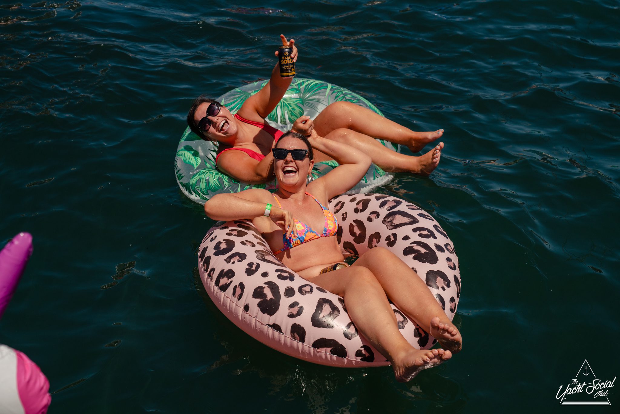 Two women are floating on an inflatable raft in the water, smiling at the camera. Both are holding cans of beverages and wearing sunglasses, enjoying a day of luxury yacht hire Sydney.