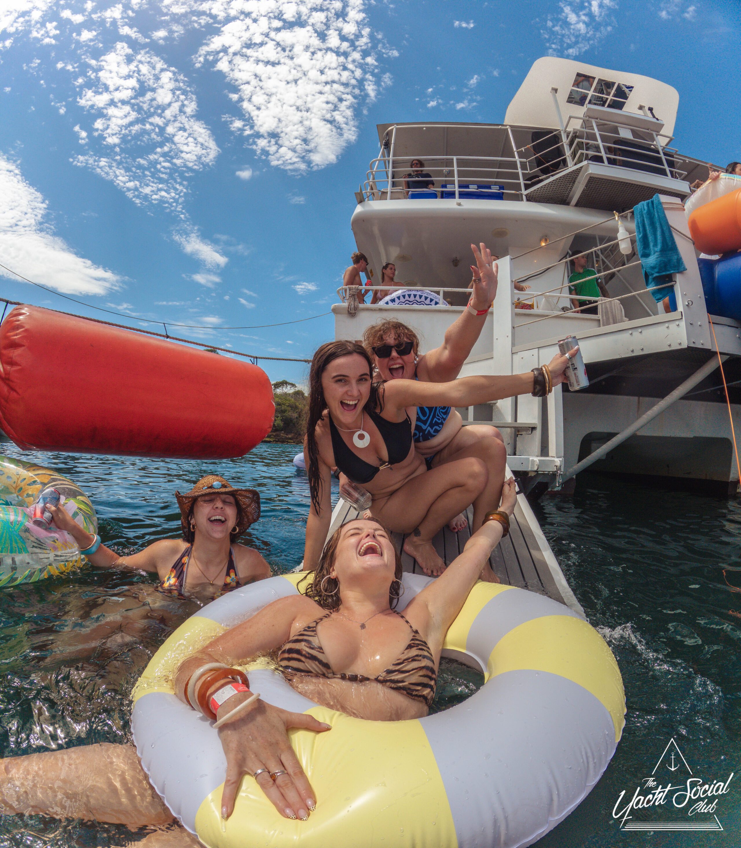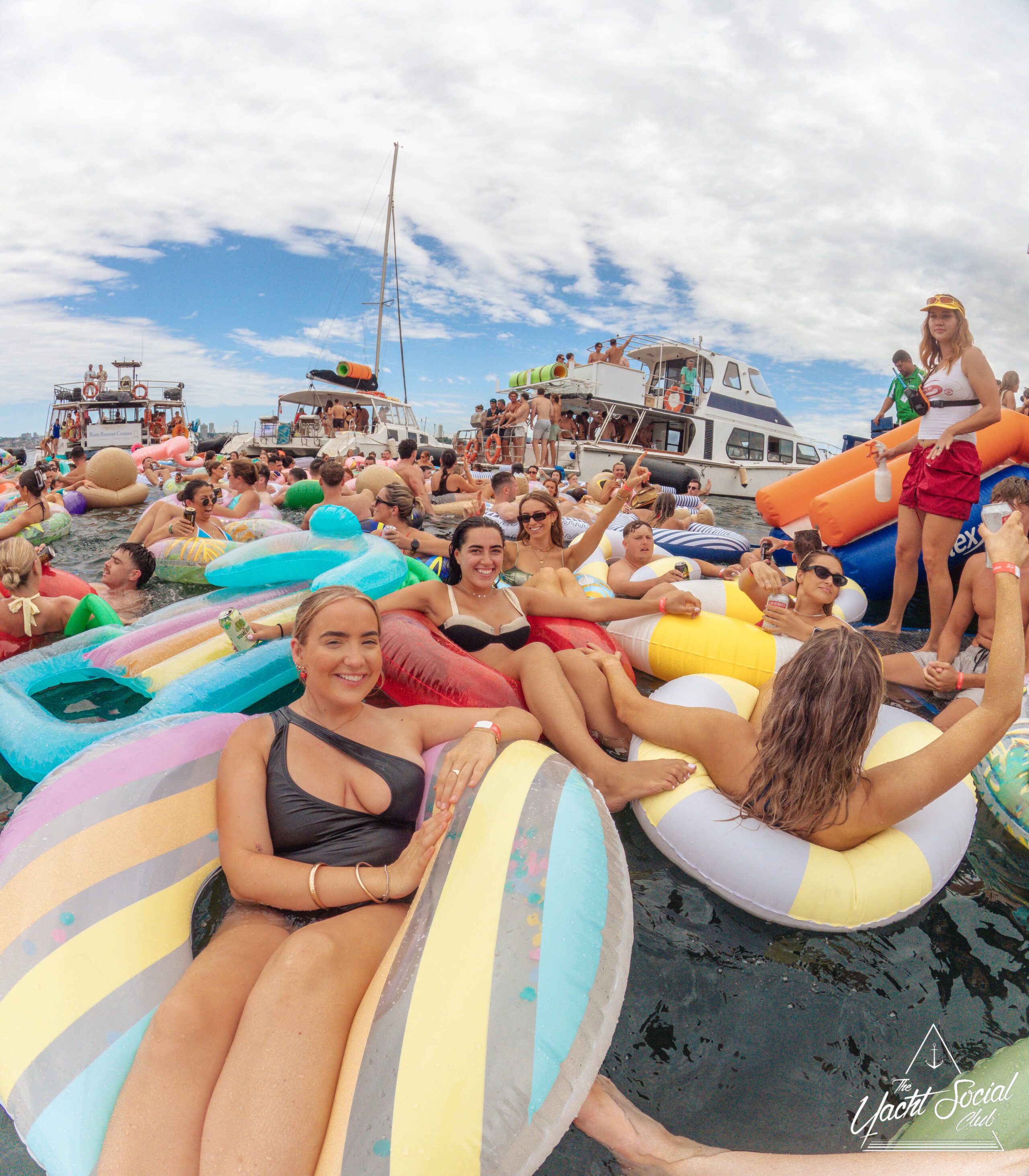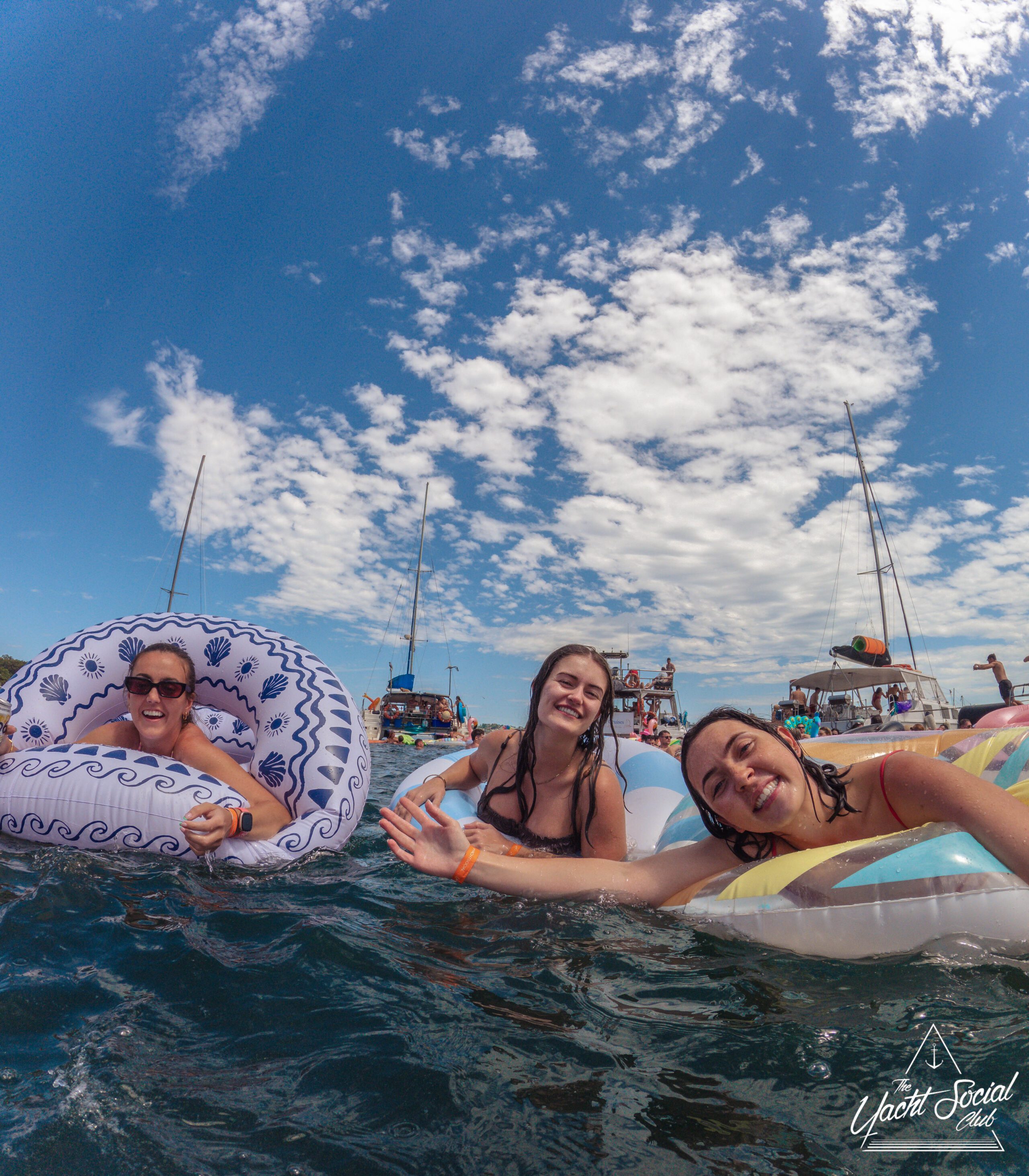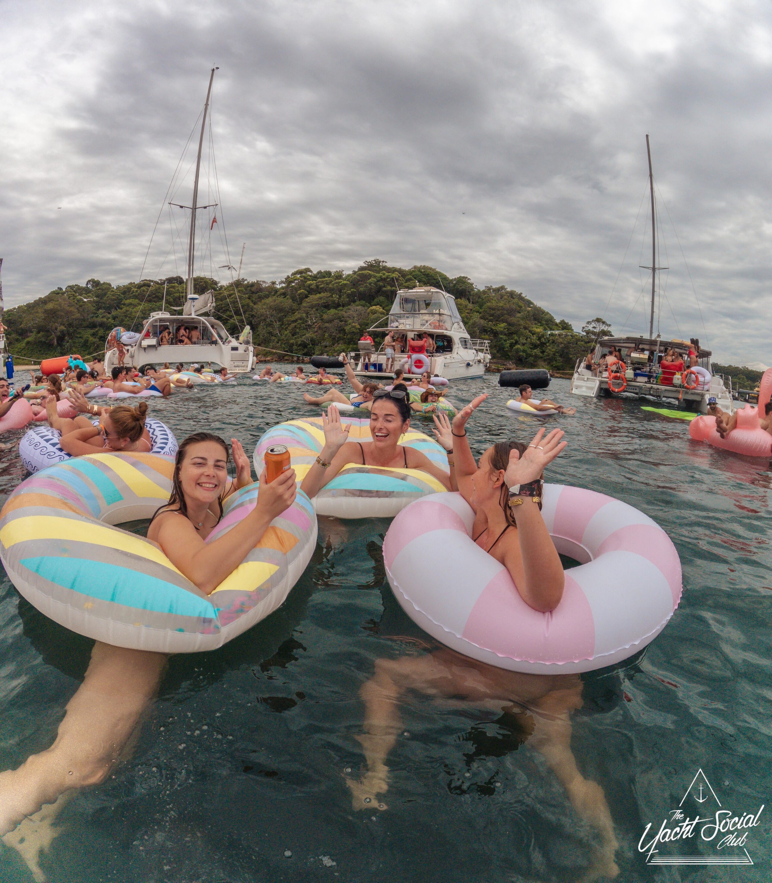 Three women smiling and waving while floating on colorful inflatable rings in the water, surrounded by other people and boats under a cloudy sky. A "Yacht Social Club" logo is visible in the corner.
