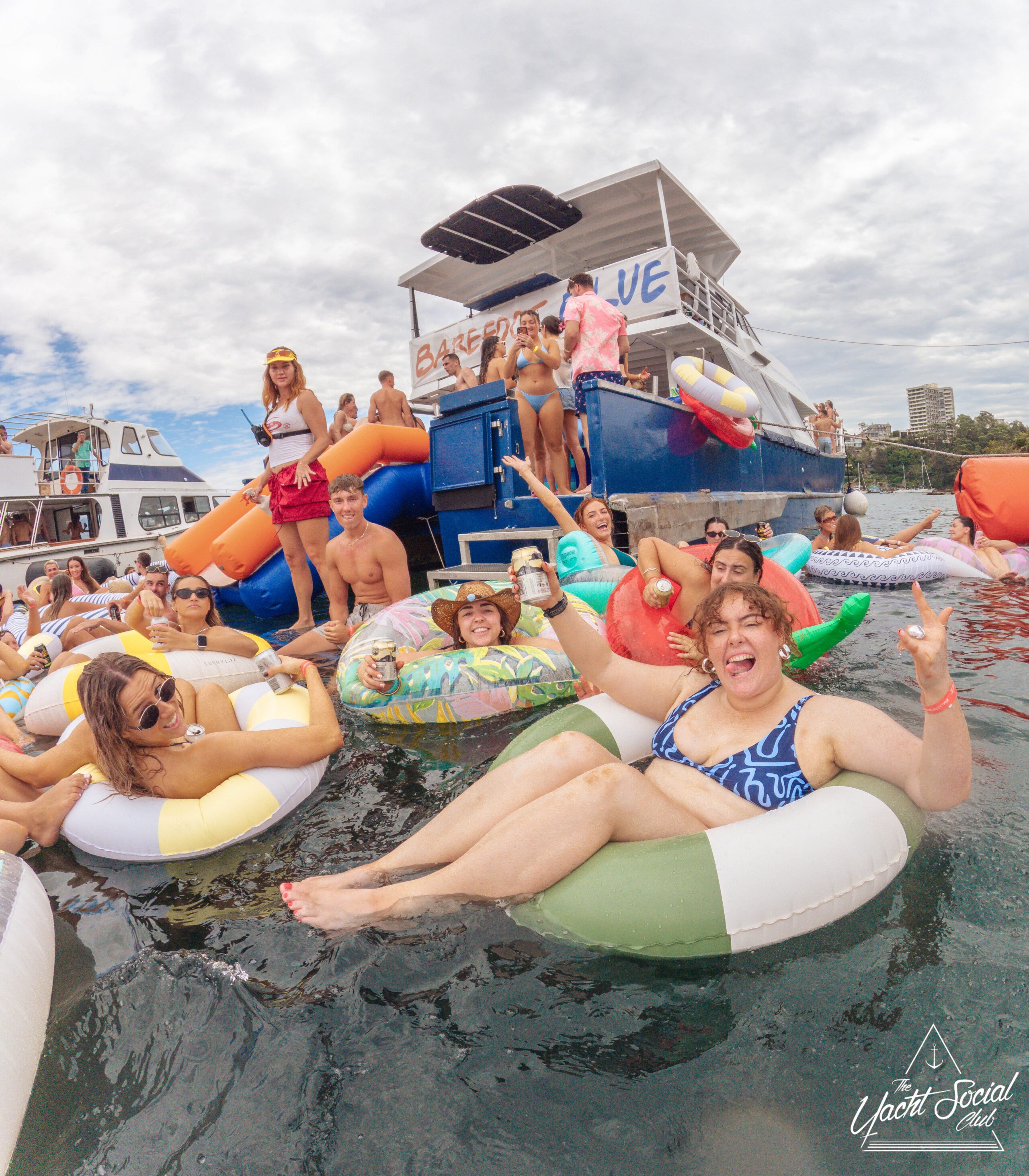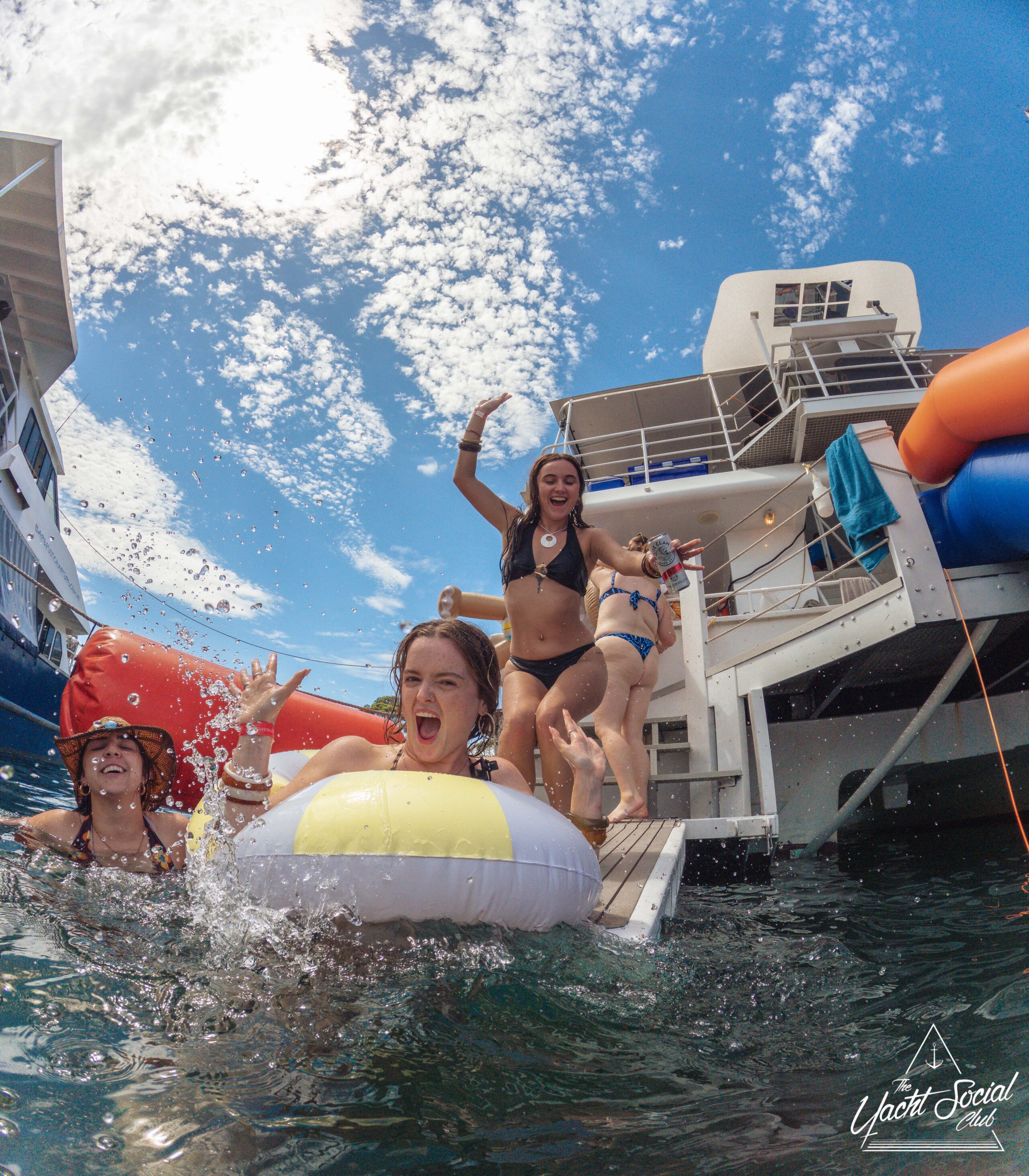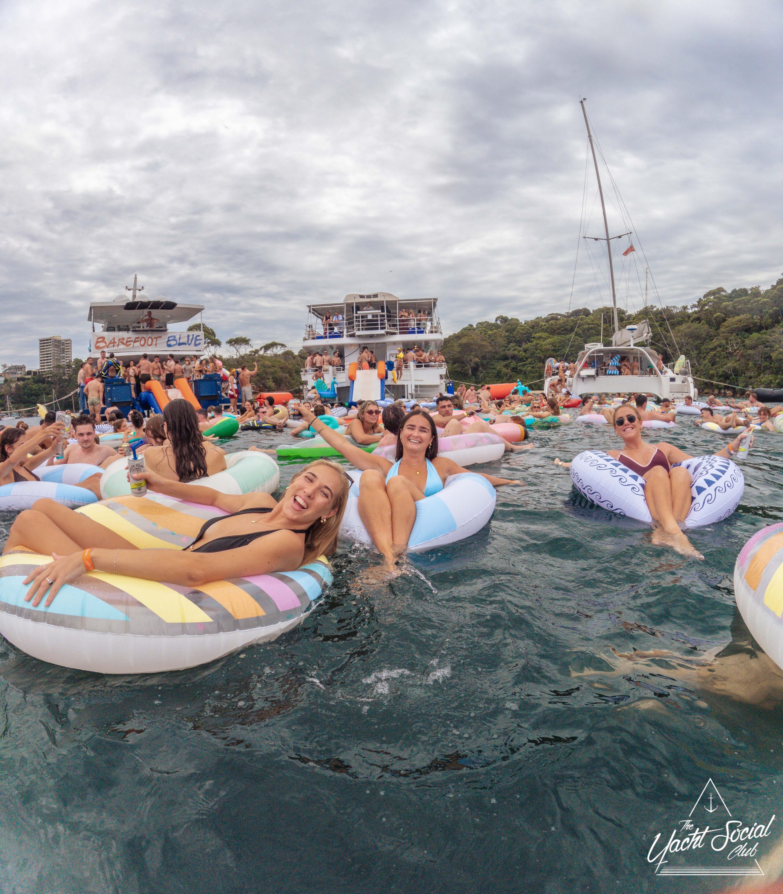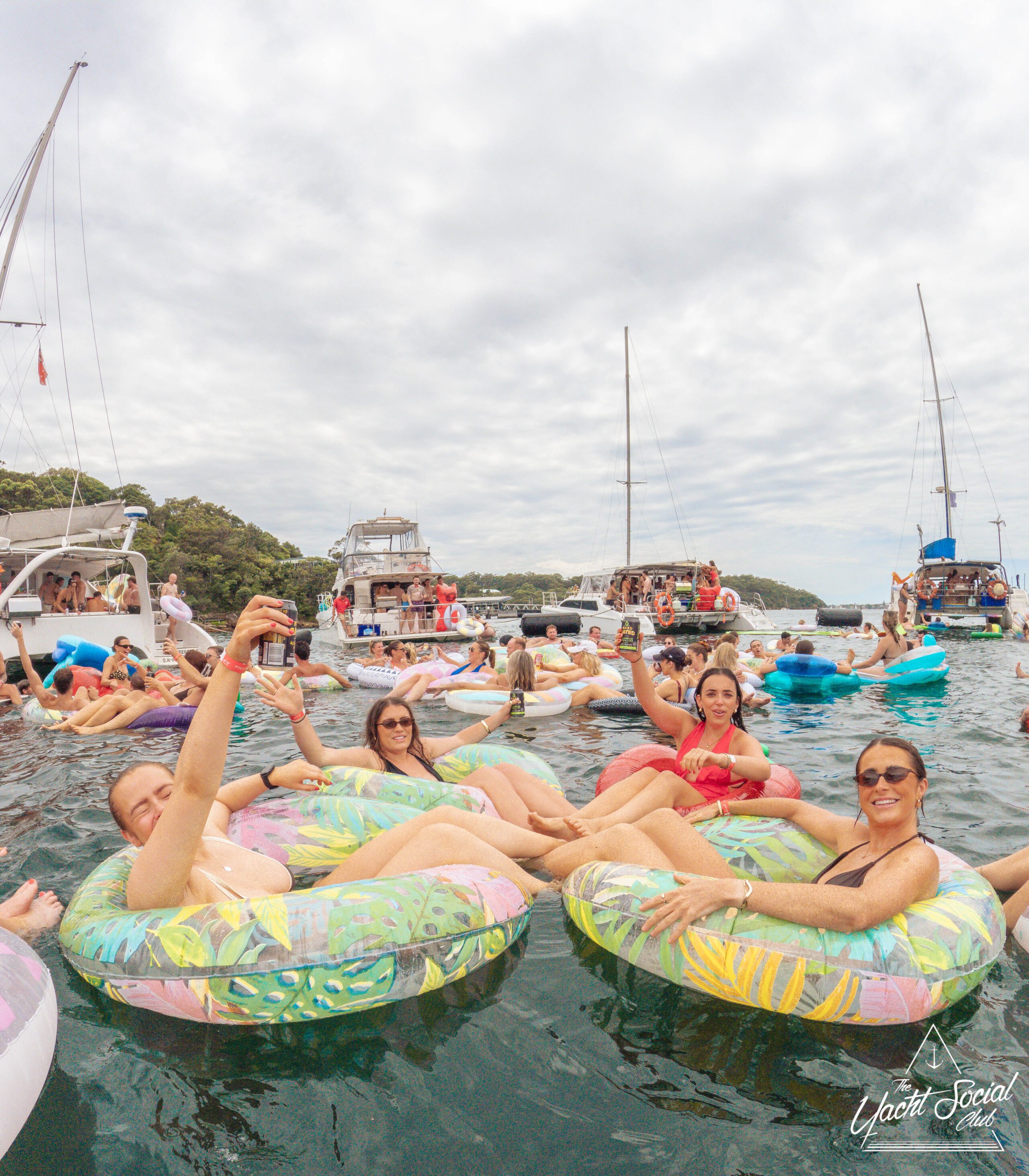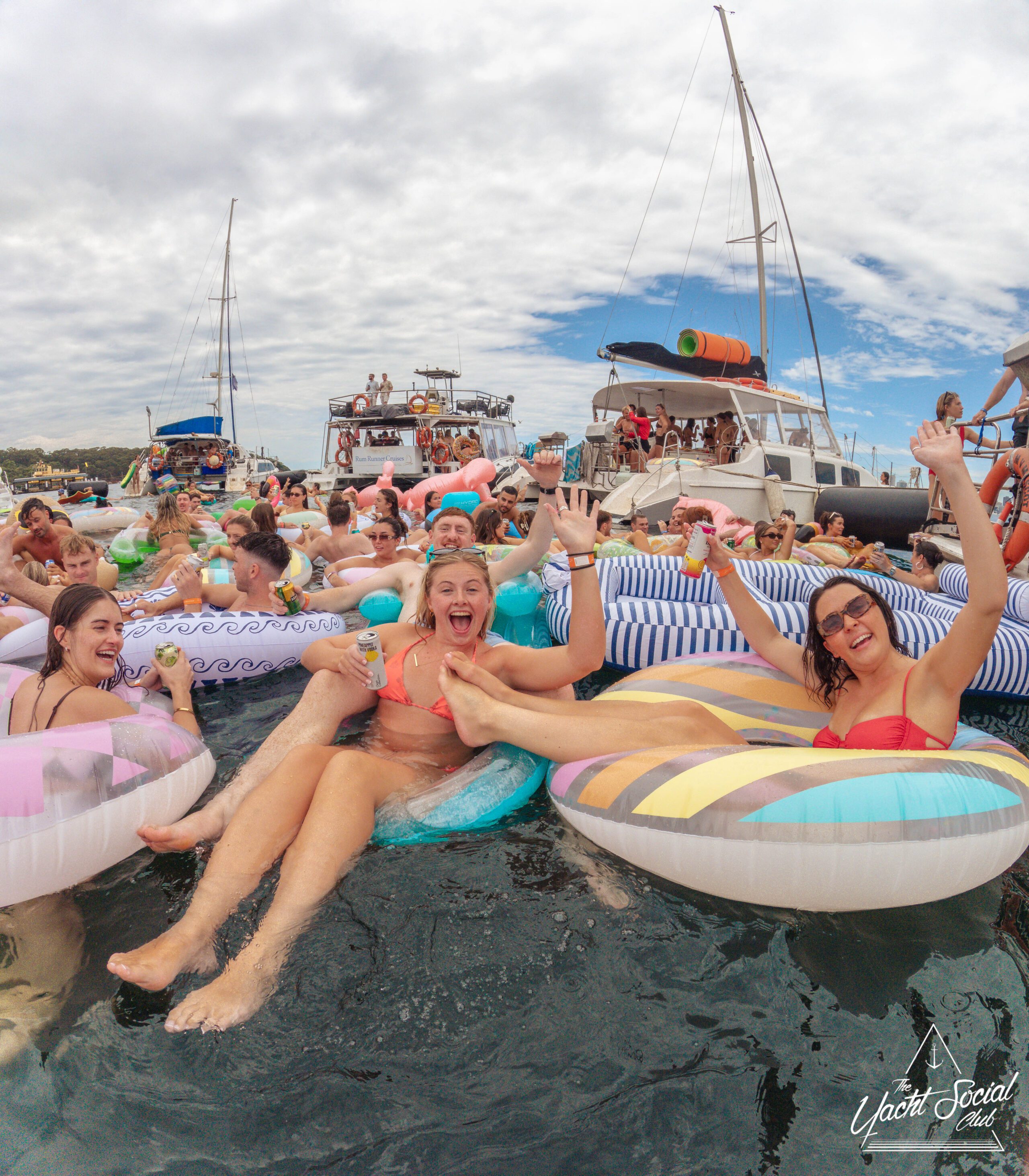 Three women smiling and waving while floating on colorful inflatable rings in the water, surrounded by other people and boats under a cloudy sky. A "Yacht Social Club" logo is visible in the corner.