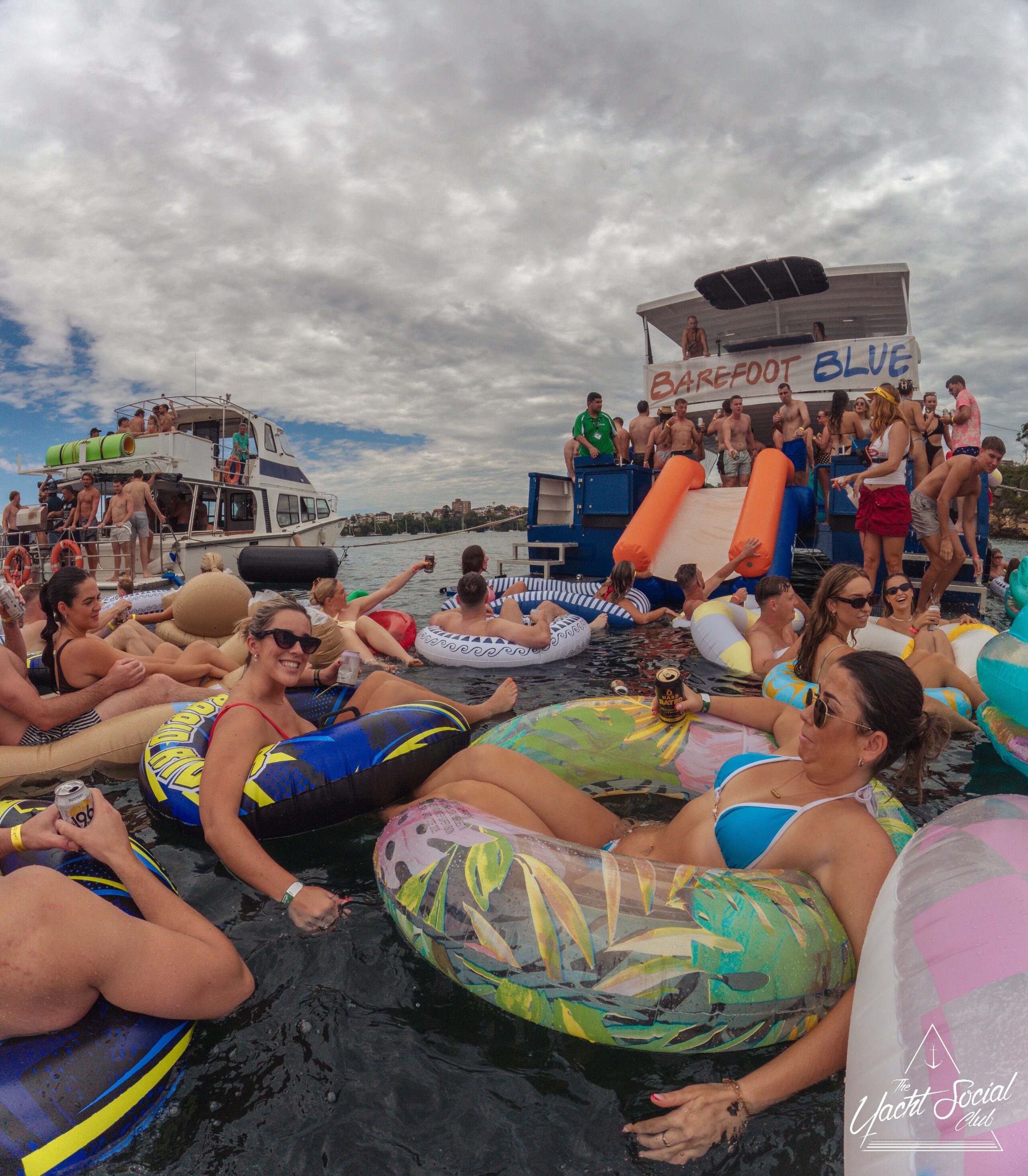 People in swimwear relax on colorful inflatables in the water near a party boat named "Barefoot Blue," with others socializing on the boat and another vessel in the background under a cloudy sky.