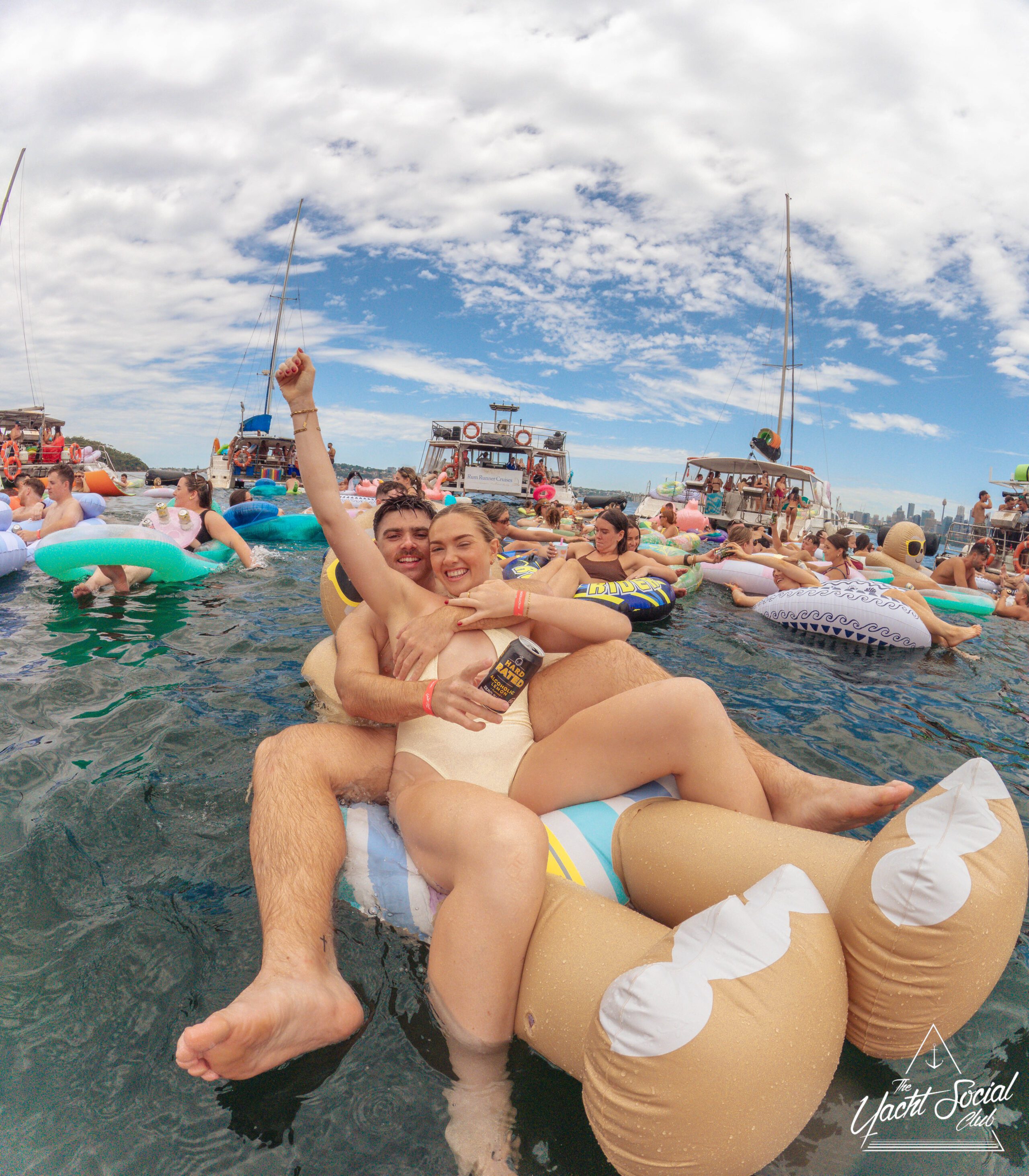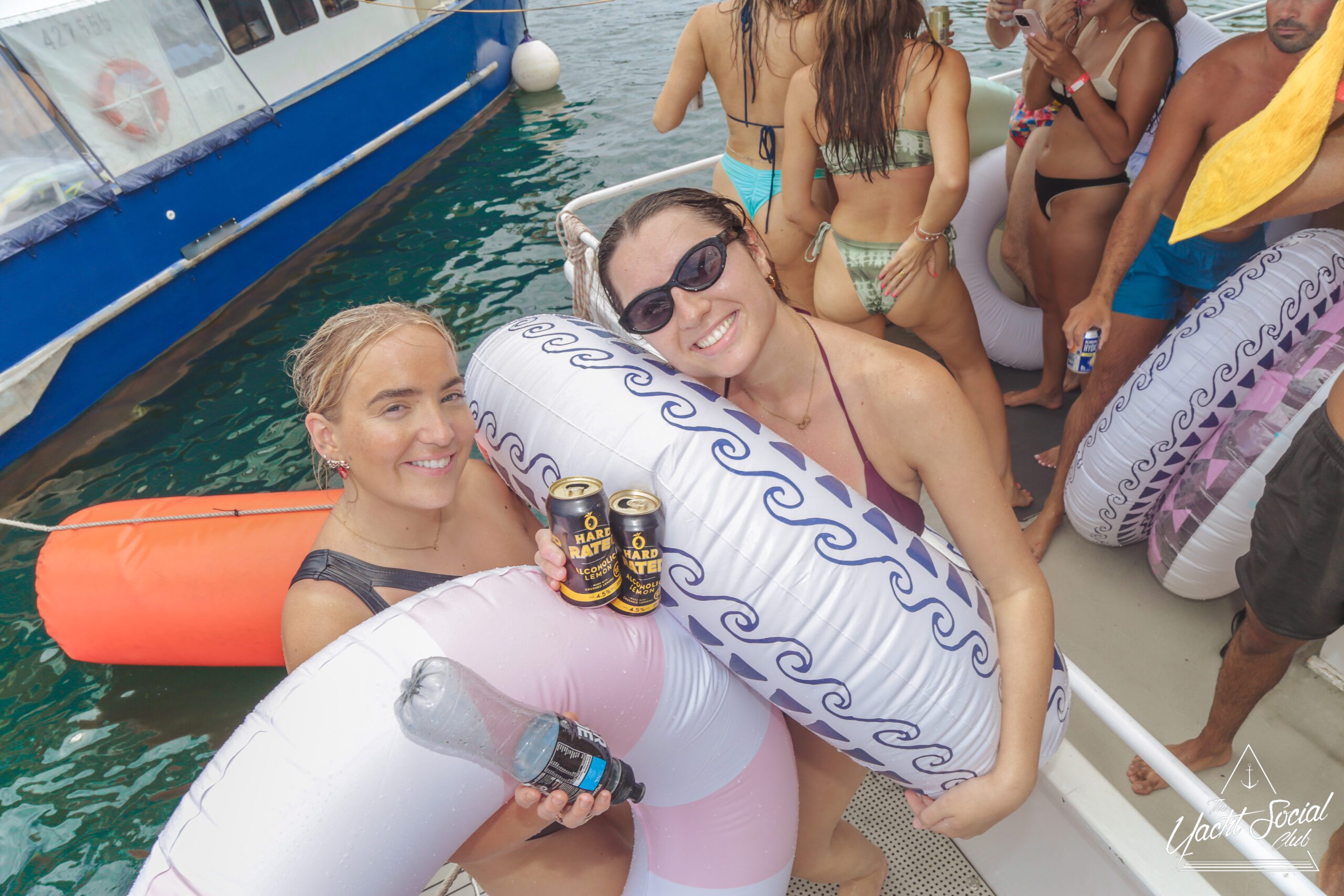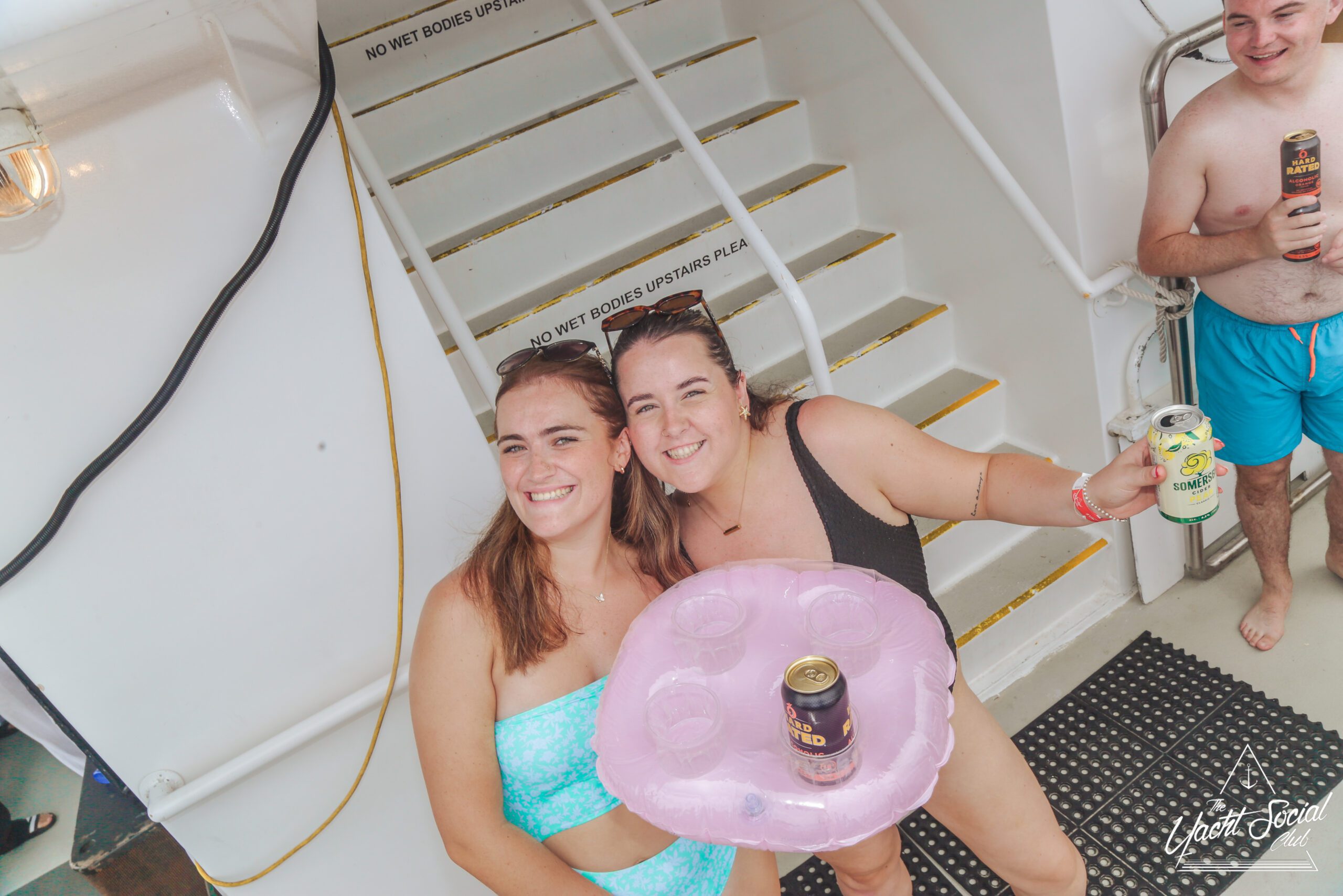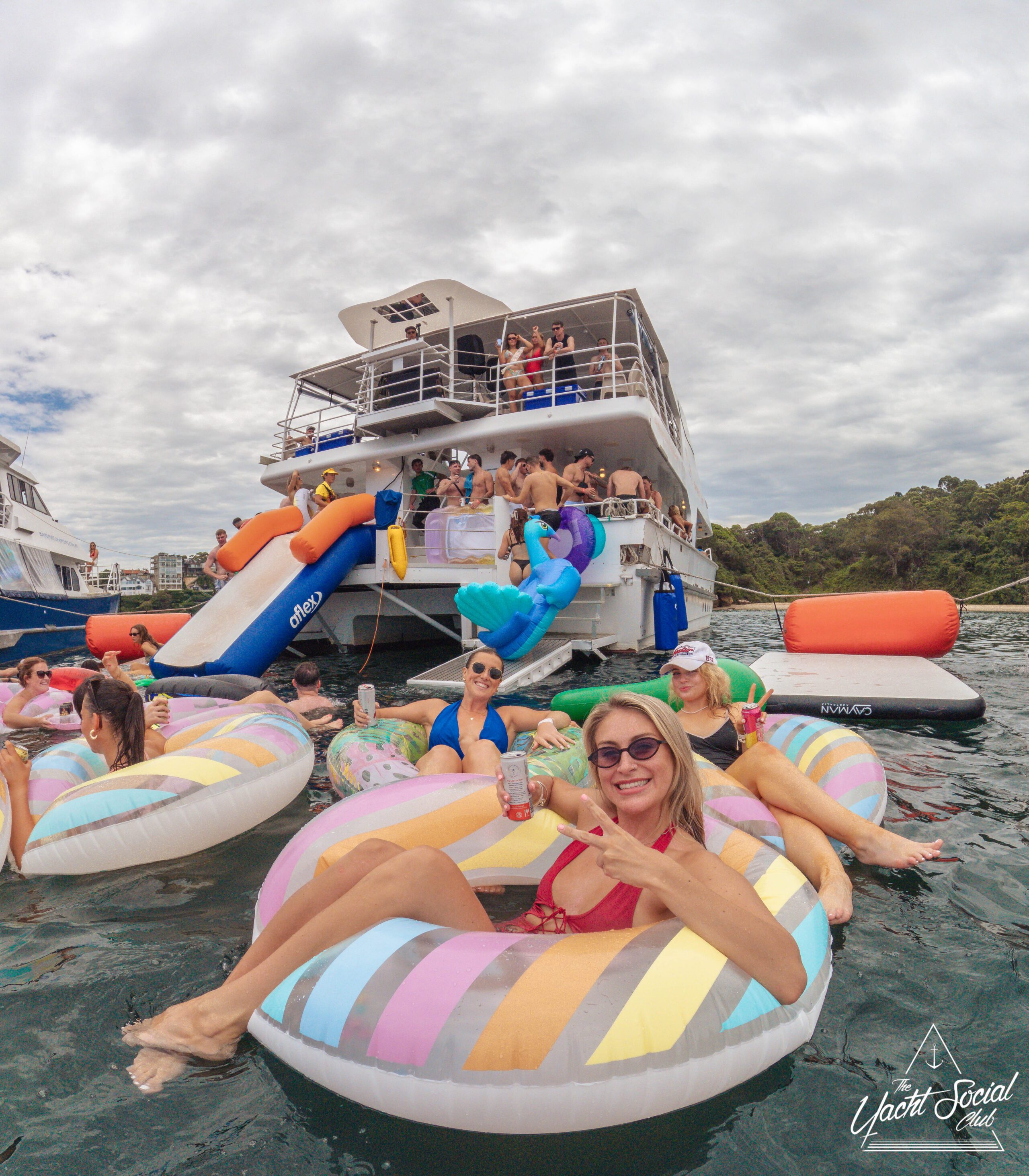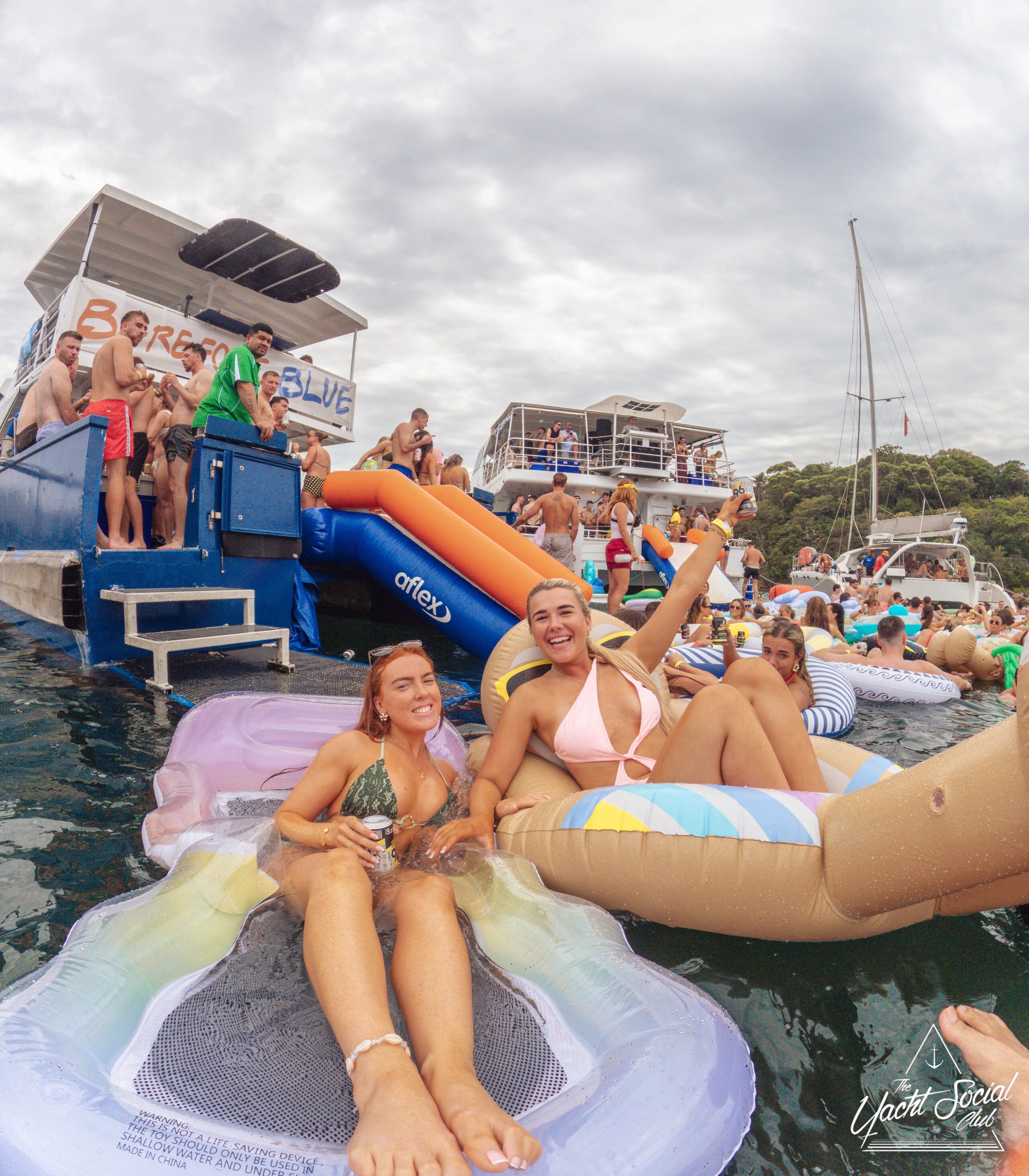 Two women in bikinis smile and hold drinks while lounging on inflatable rafts in the water. Behind them, people socialize on a yacht and other floaties. It's a lively, festive atmosphere under cloudy skies.