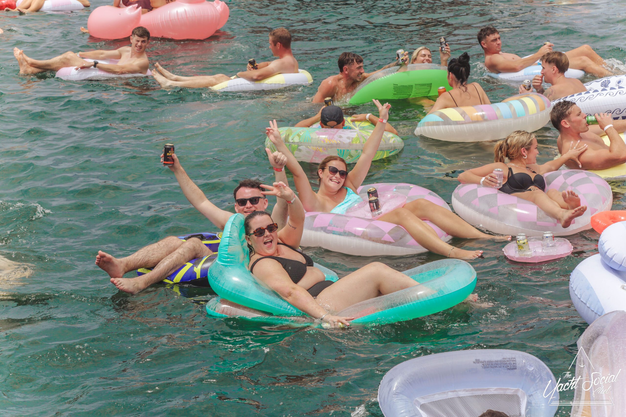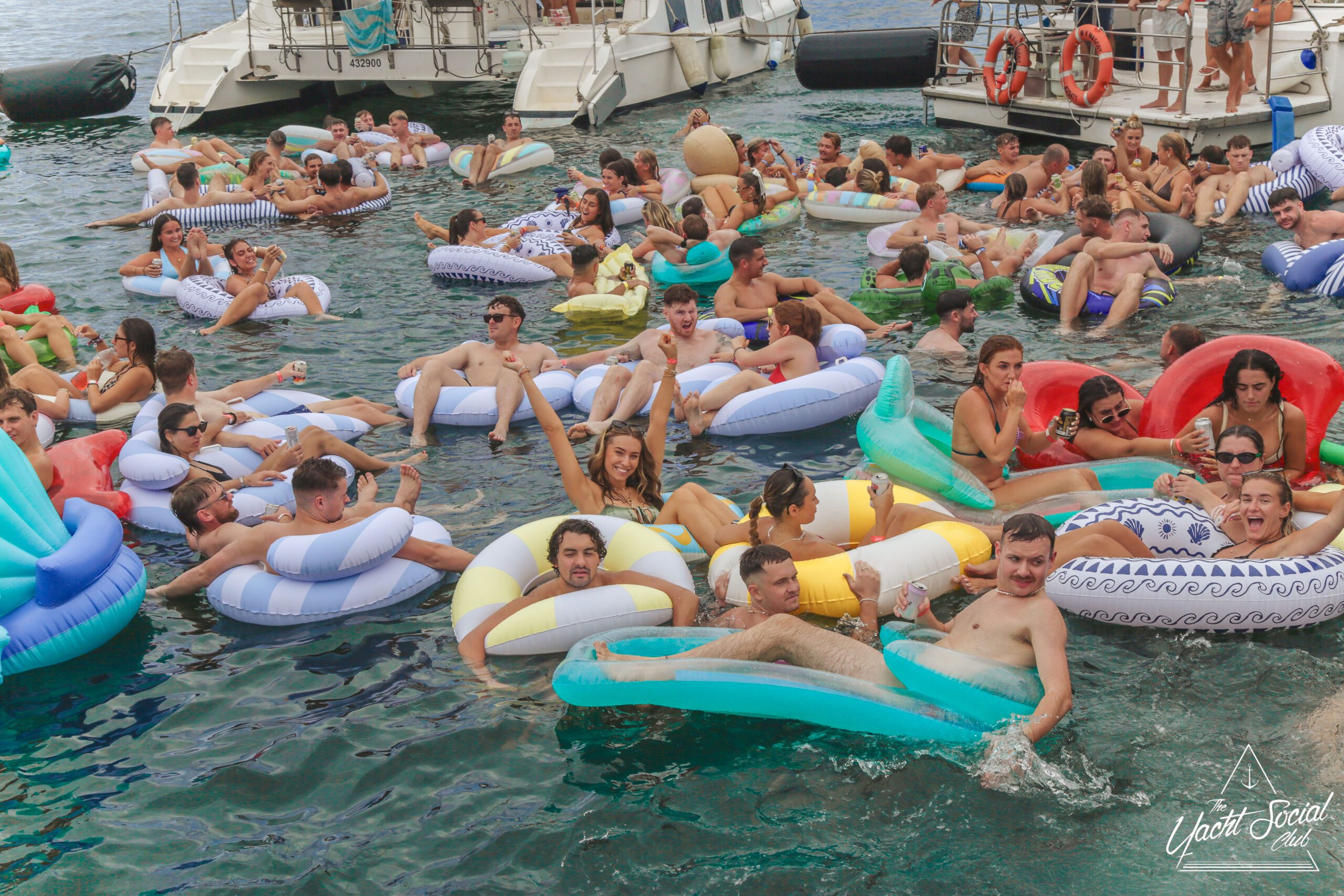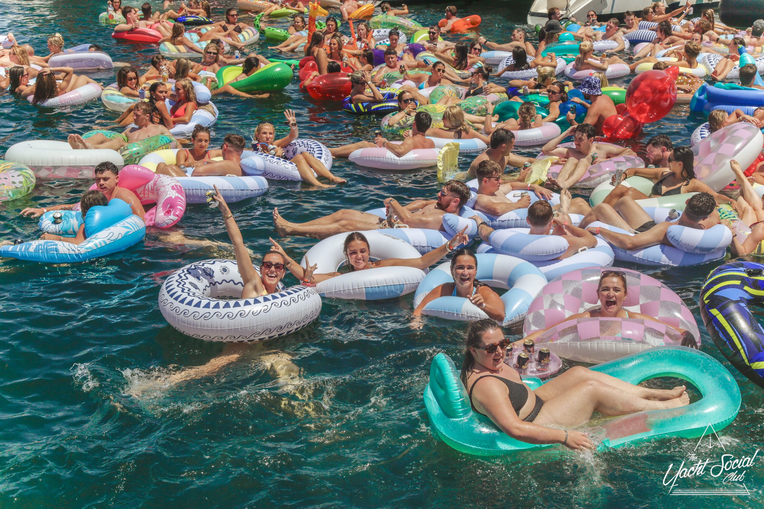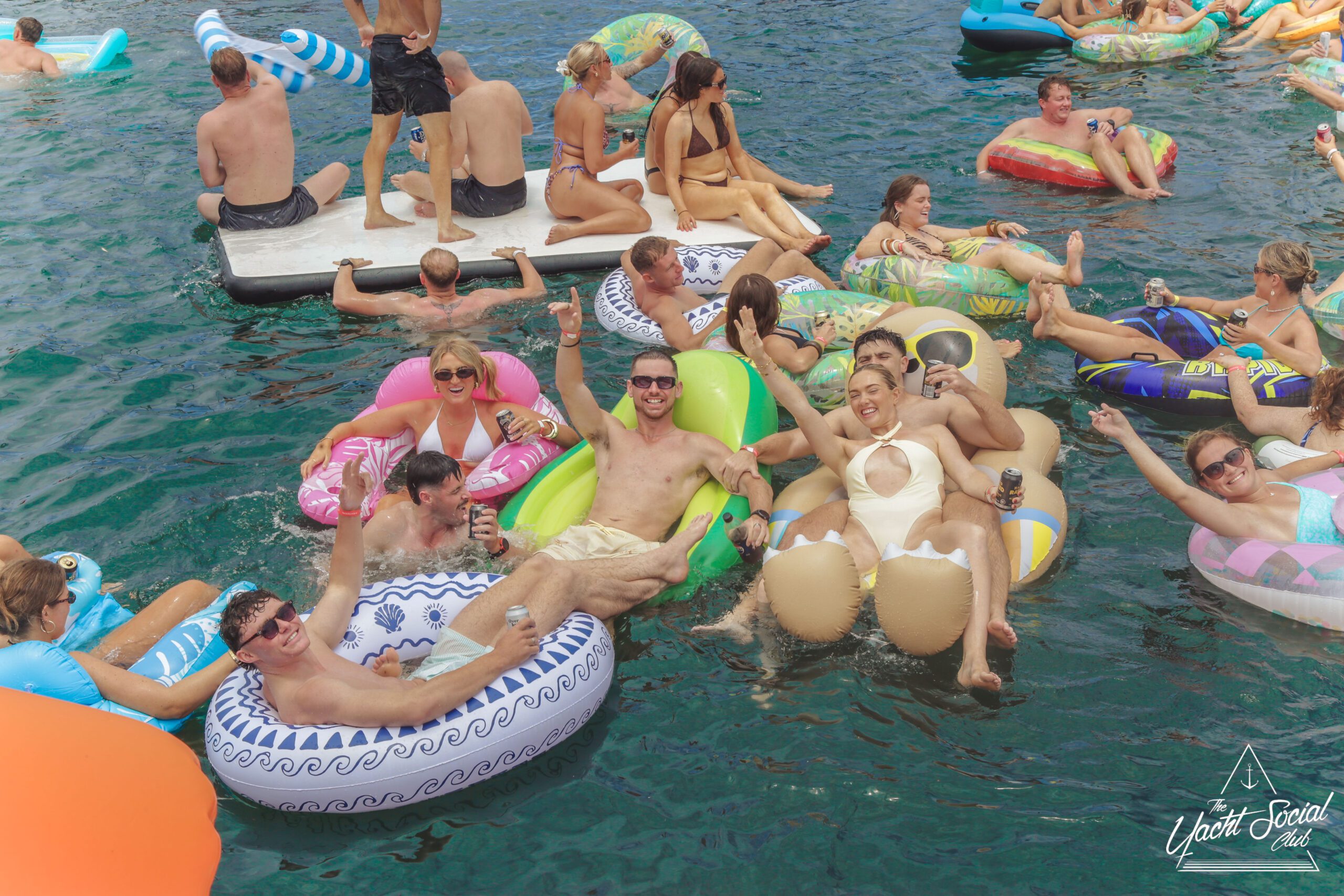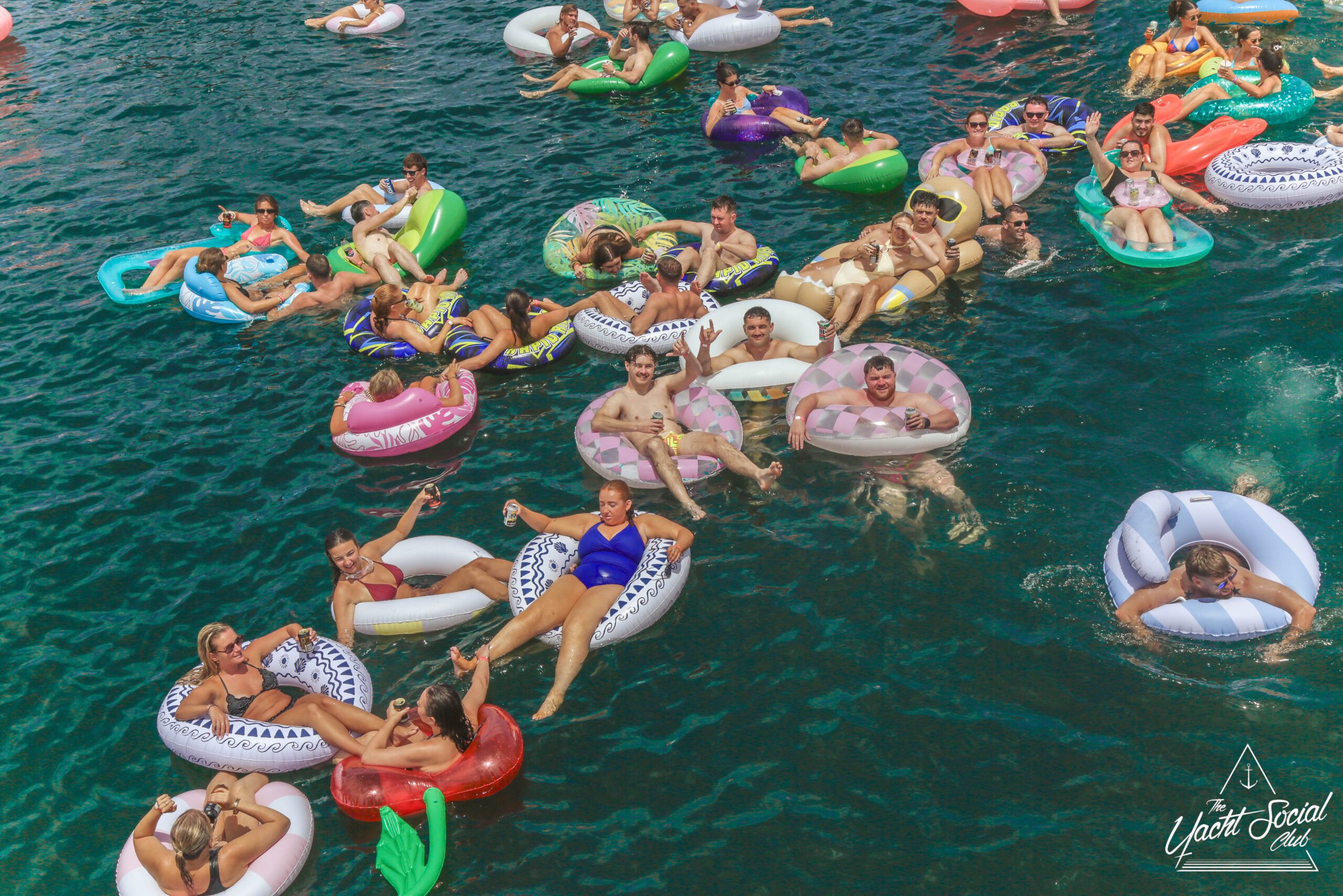 A group of people relax on inflatable pool floats in the water near two party boats, with others mingling, swimming, and enjoying a lively atmosphere under a cloudy sky. "Yacht Social Club" logo is visible in the corner.