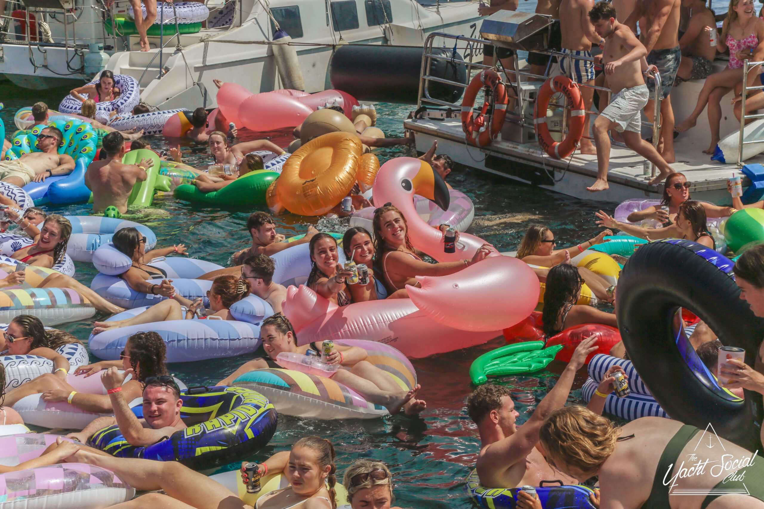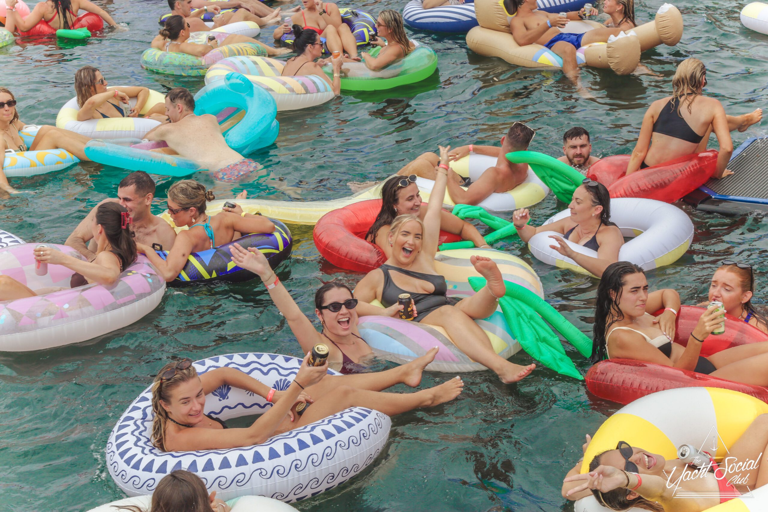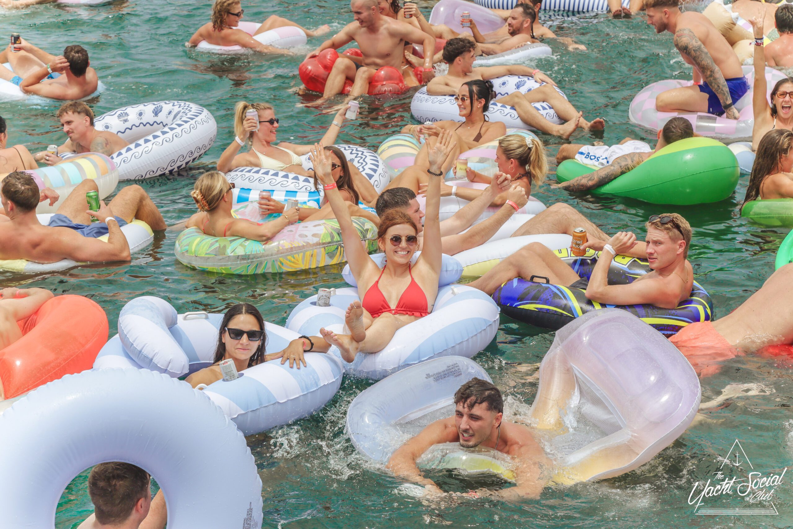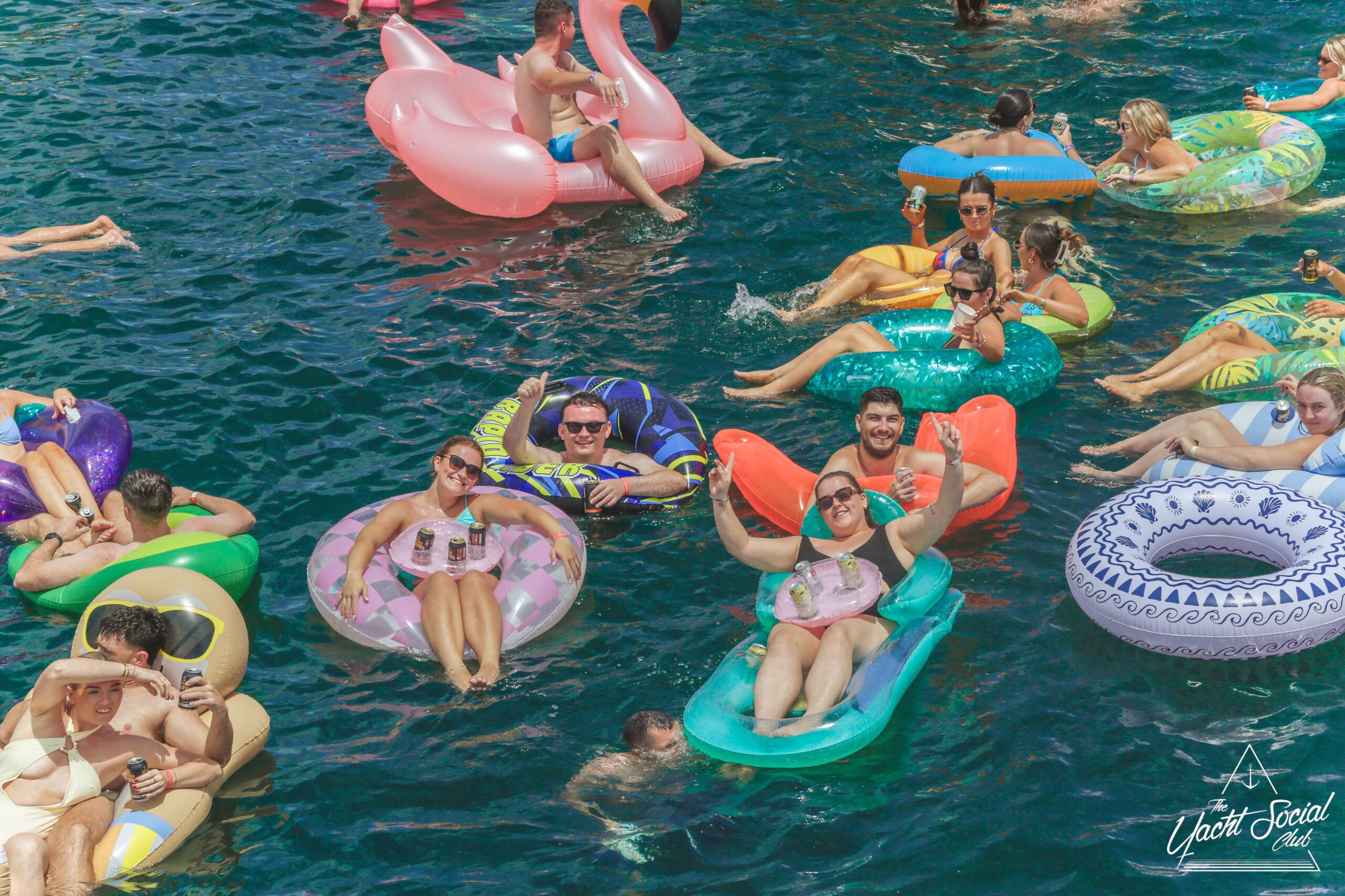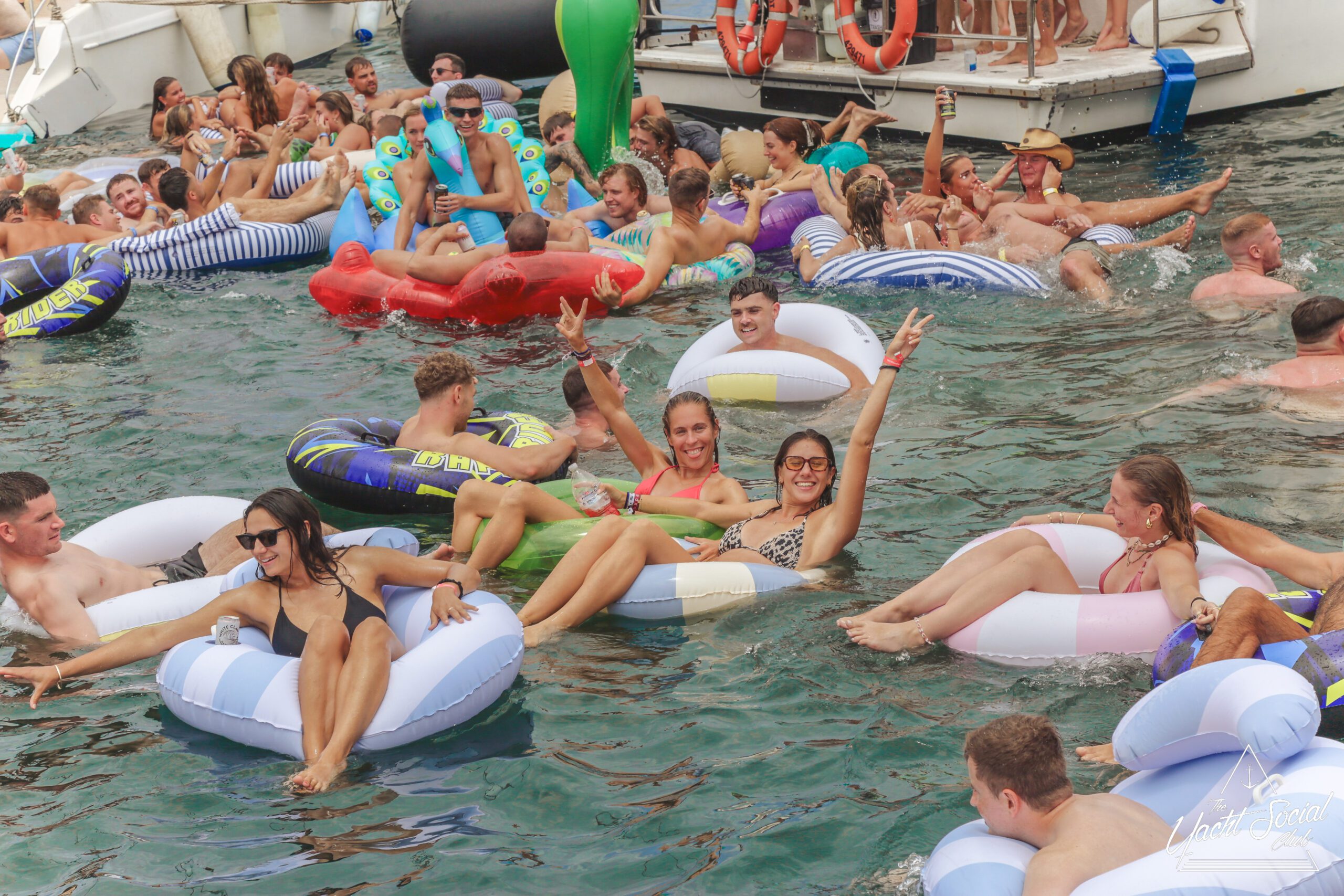 A group of people relax on inflatable pool floats in the water near two party boats, with others mingling, swimming, and enjoying a lively atmosphere under a cloudy sky. "Yacht Social Club" logo is visible in the corner.