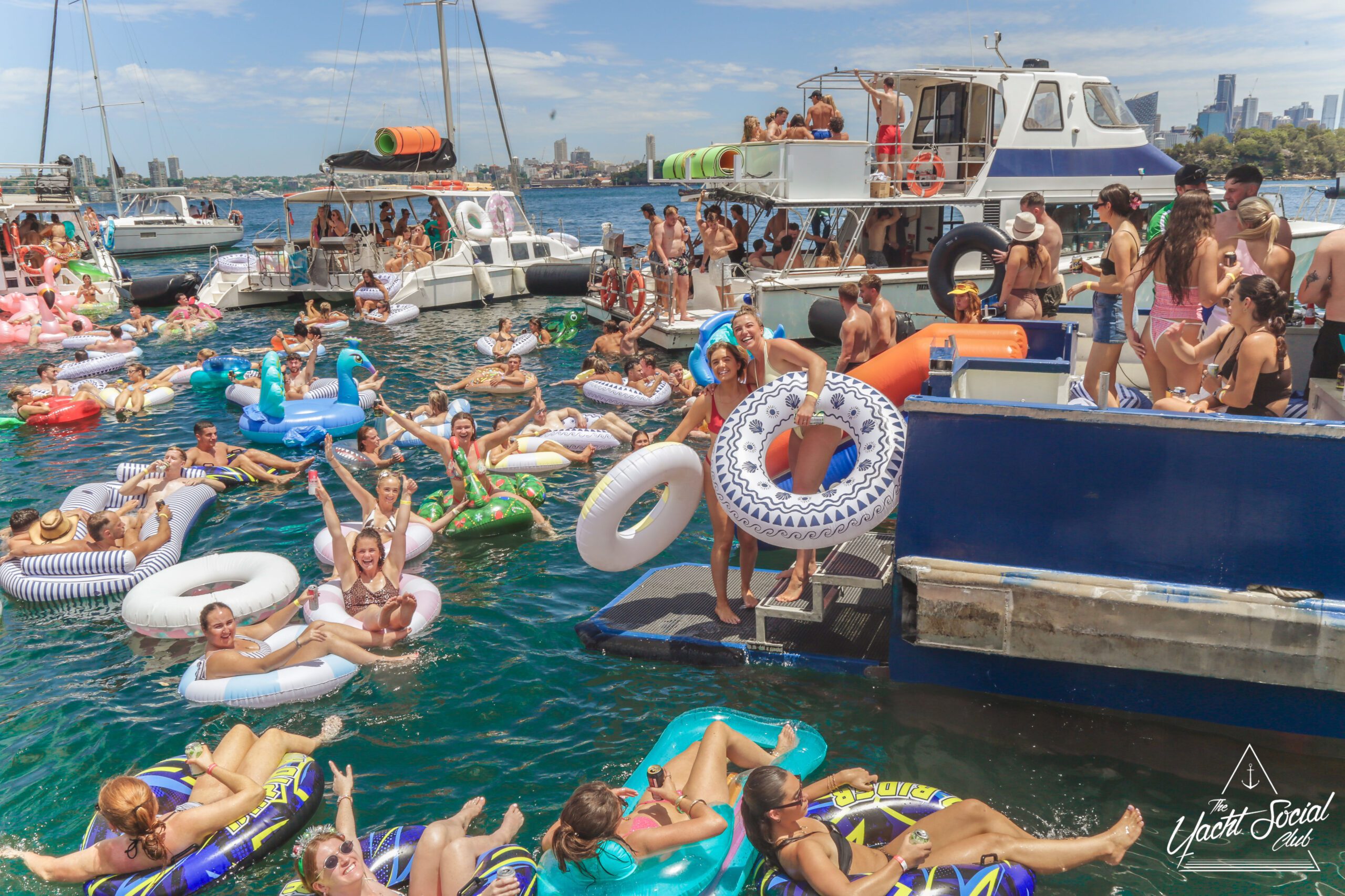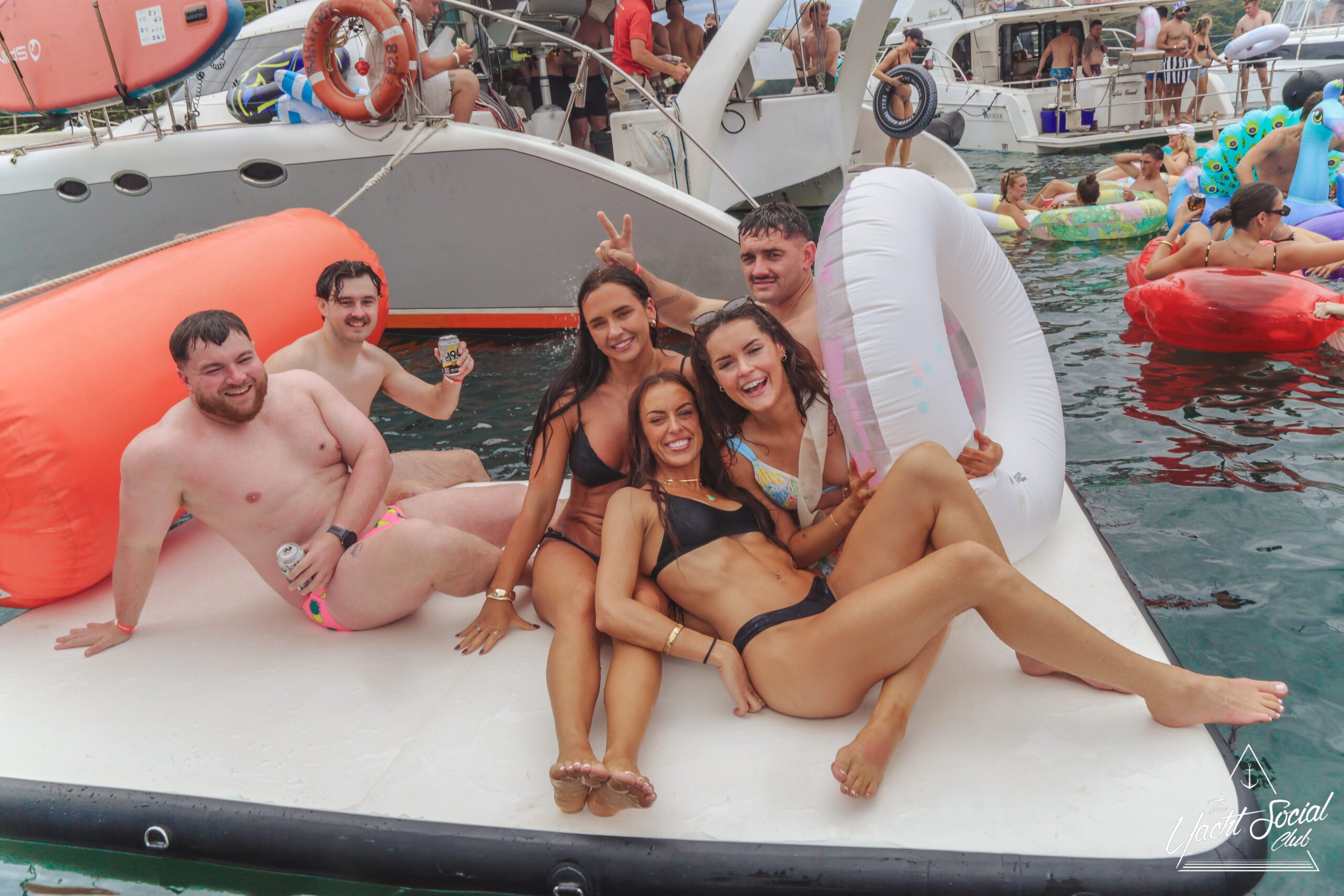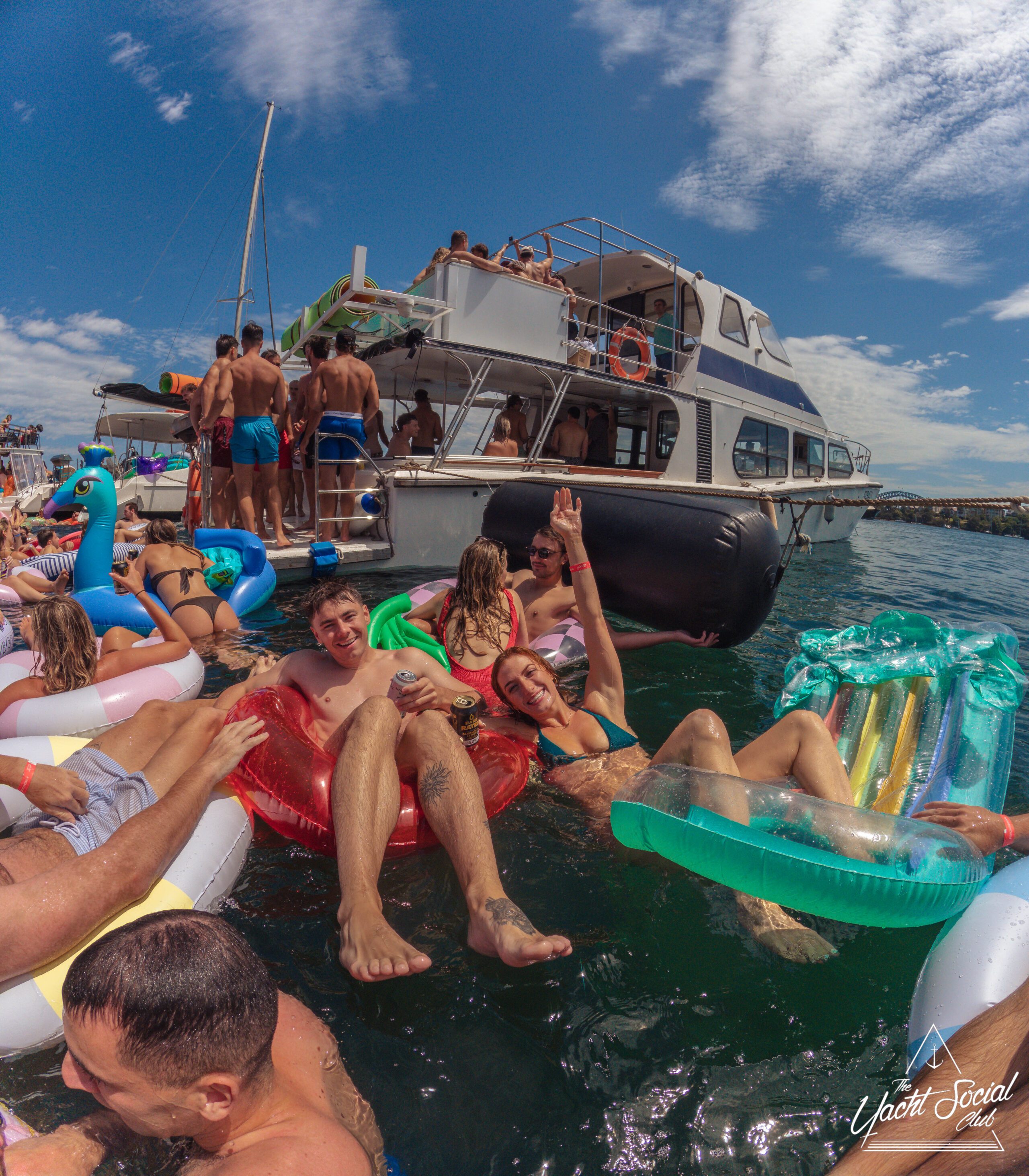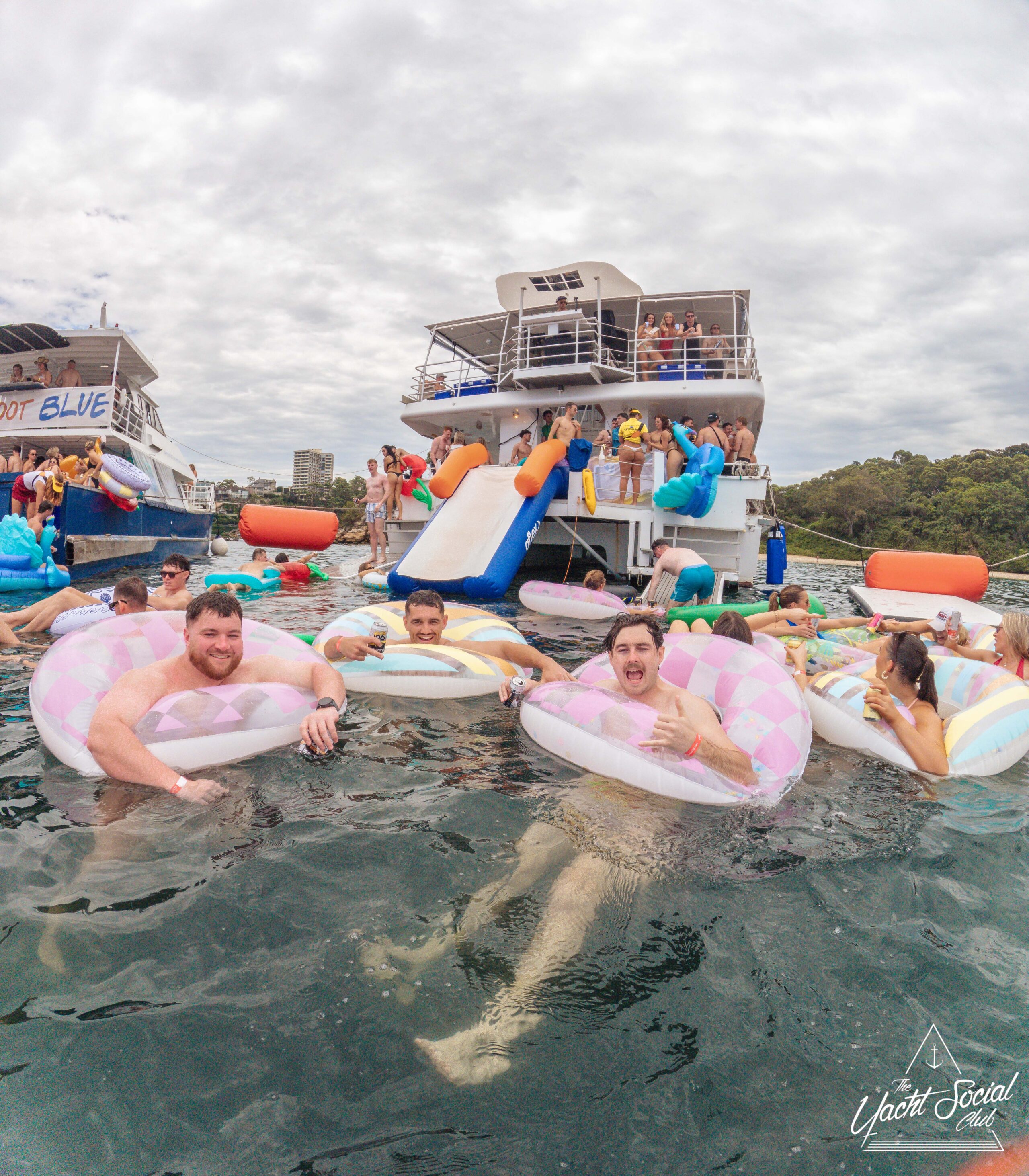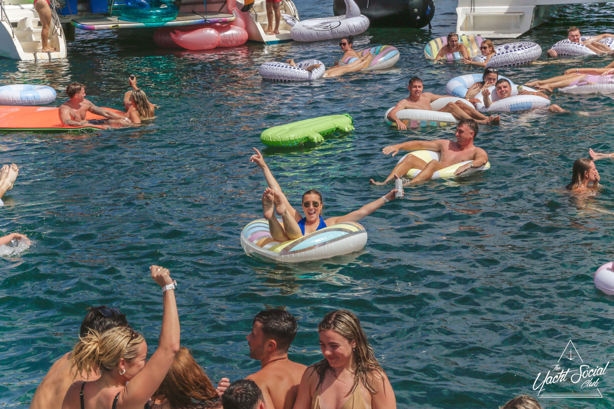 A group of people relax on inflatable pool floats in the water near two party boats, with others mingling, swimming, and enjoying a lively atmosphere under a cloudy sky. "Yacht Social Club" logo is visible in the corner.