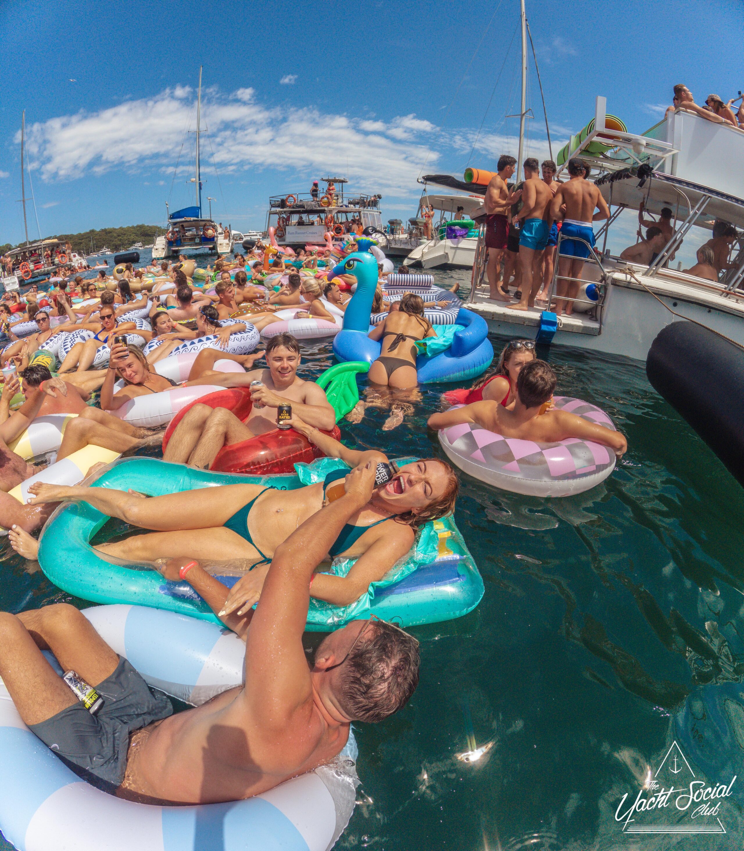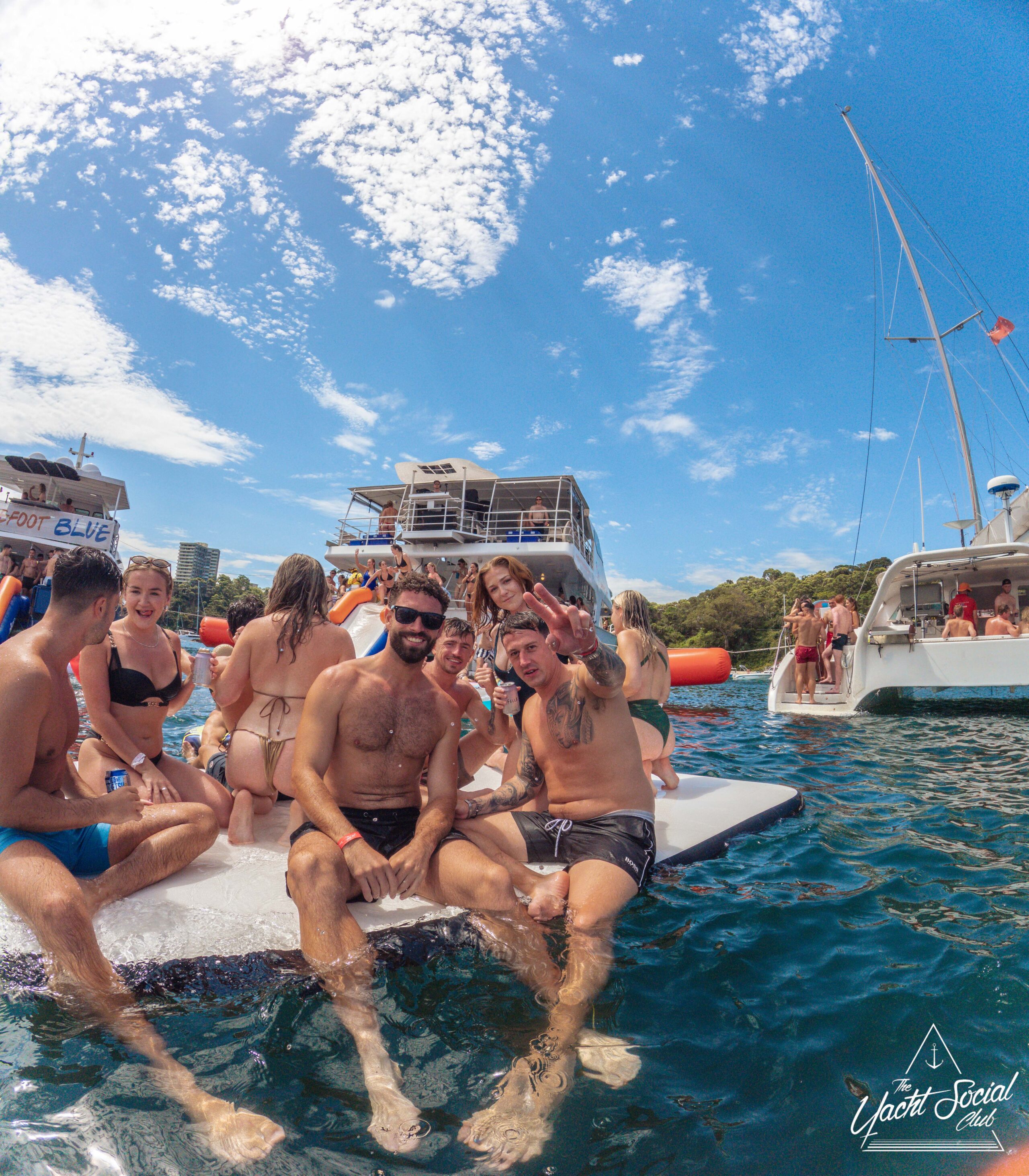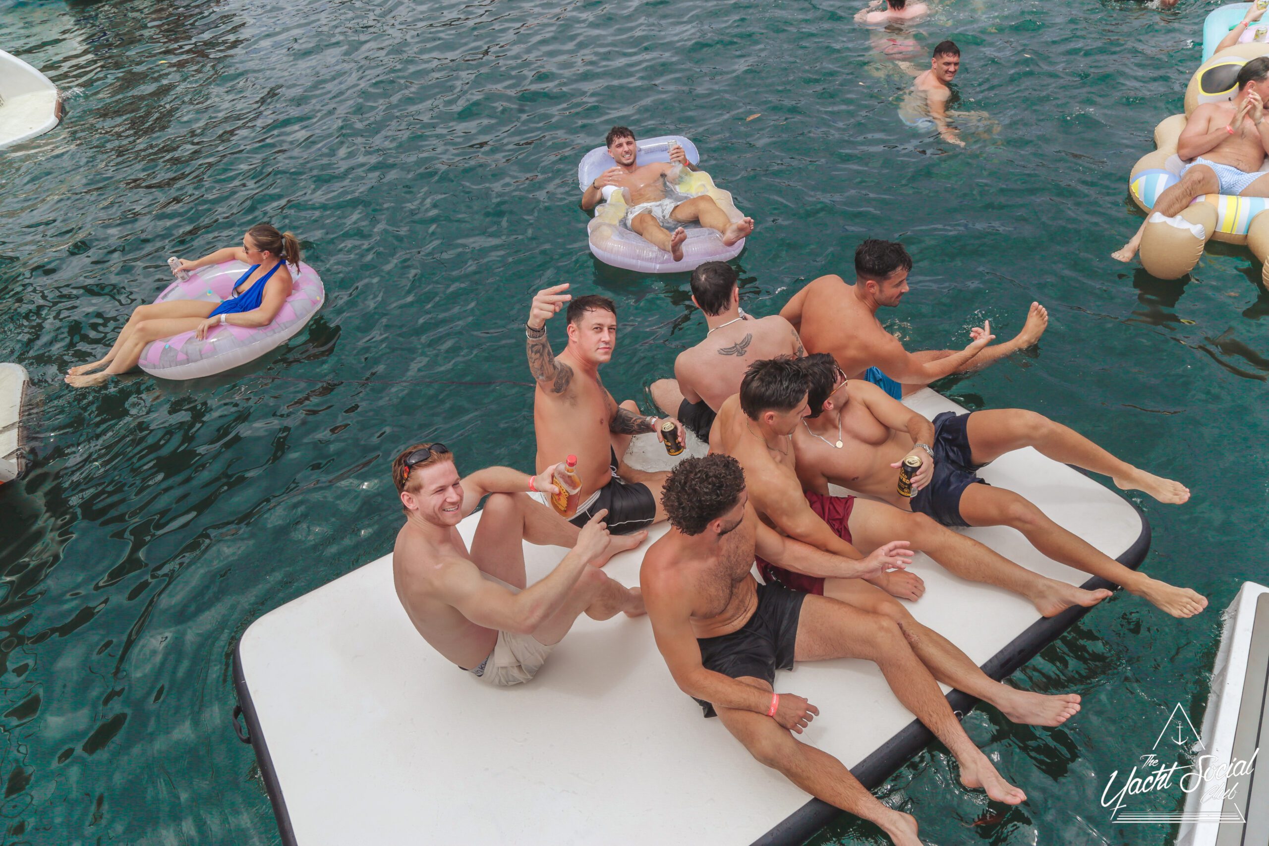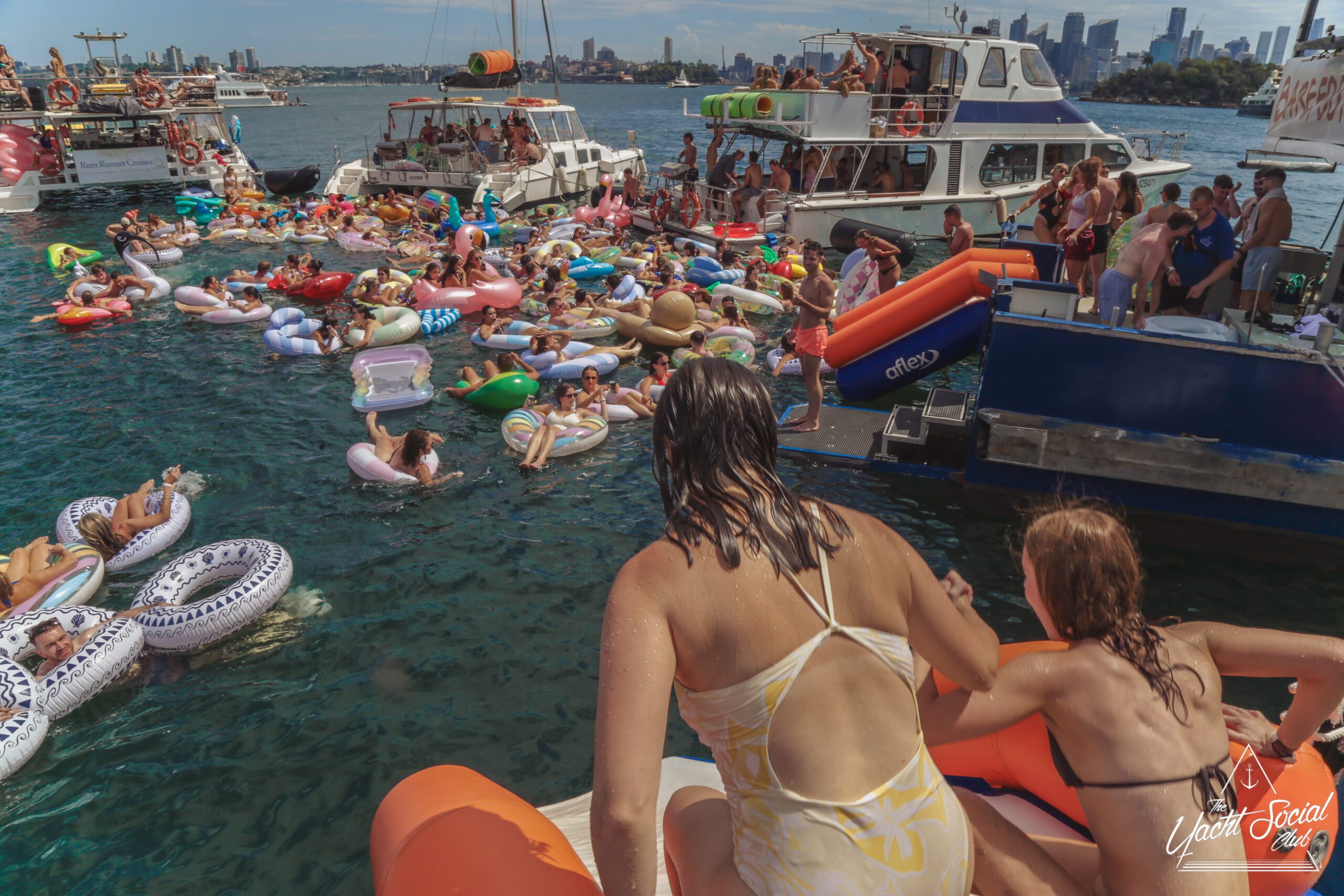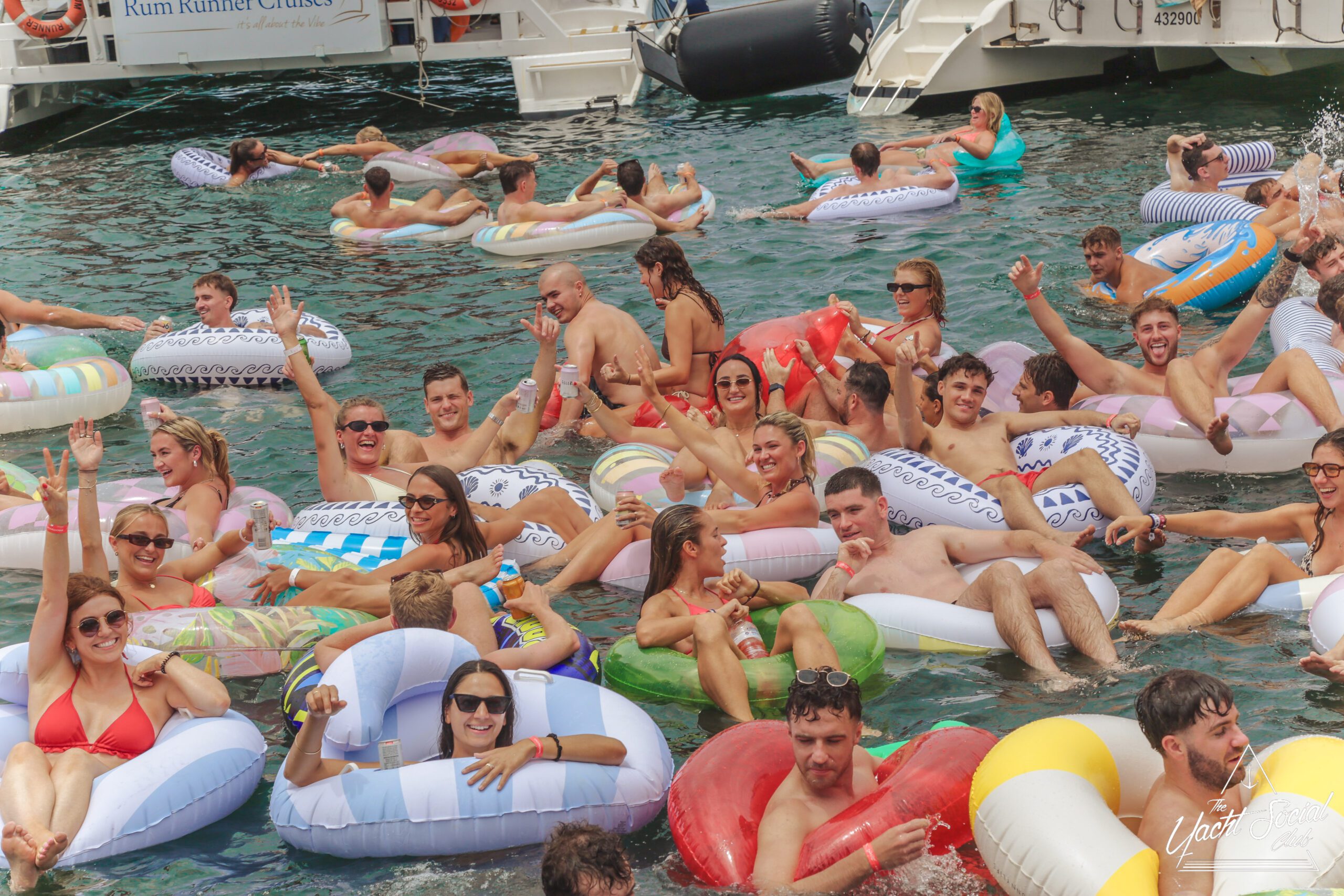 A group of people relax on inflatable pool floats in the water near two party boats, with others mingling, swimming, and enjoying a lively atmosphere under a cloudy sky. "Yacht Social Club" logo is visible in the corner.