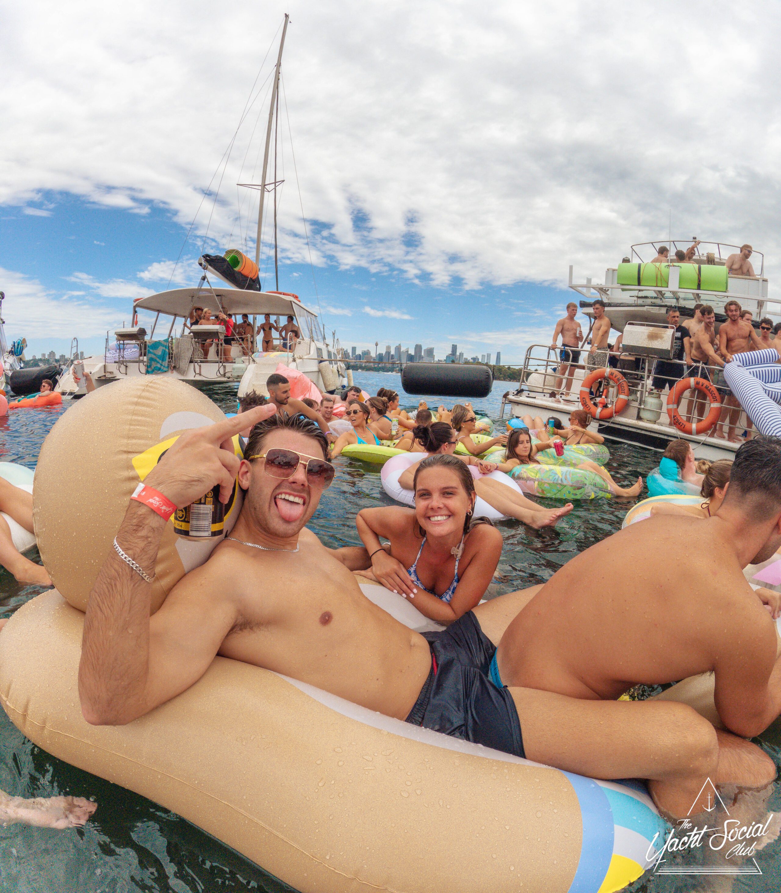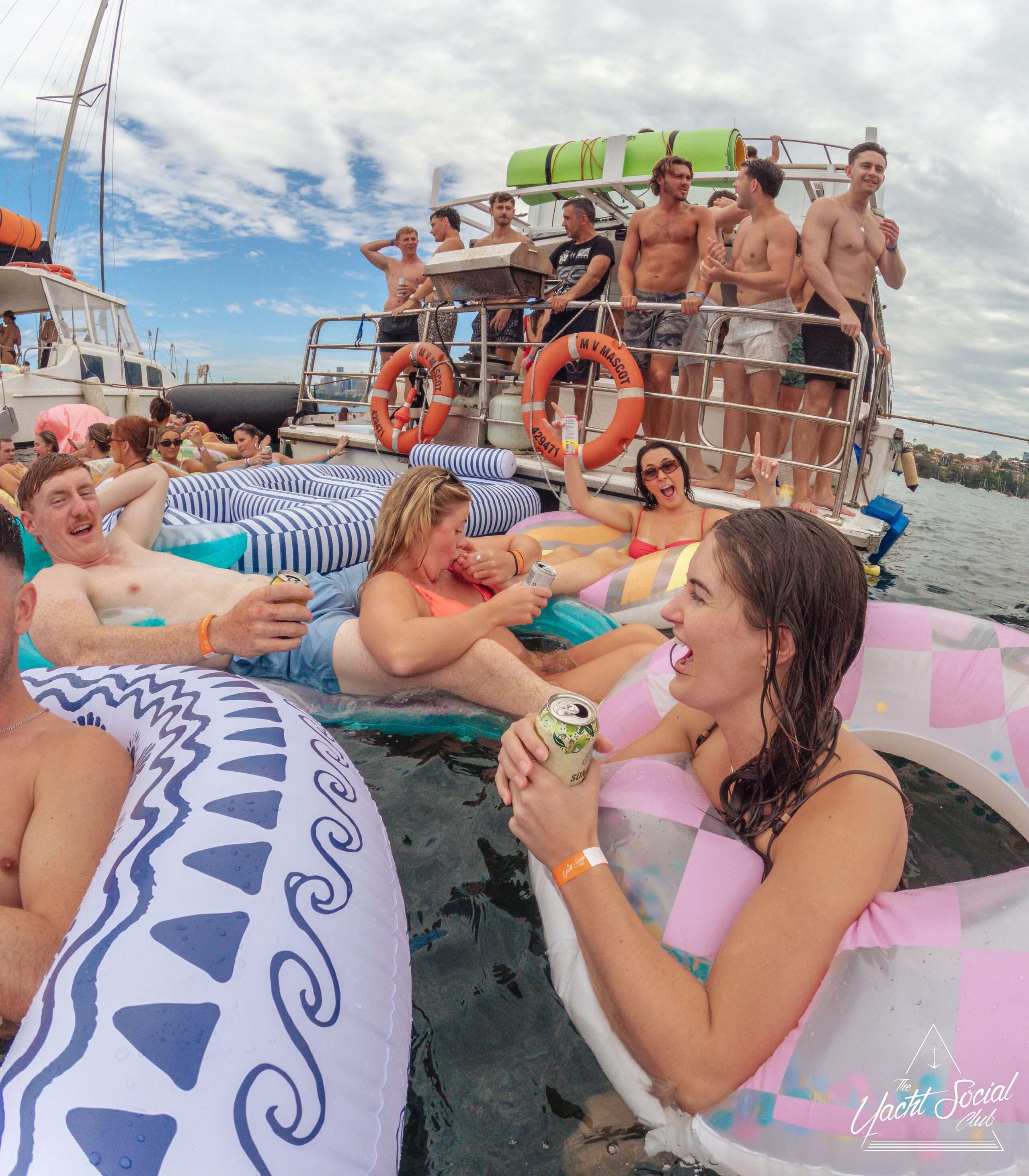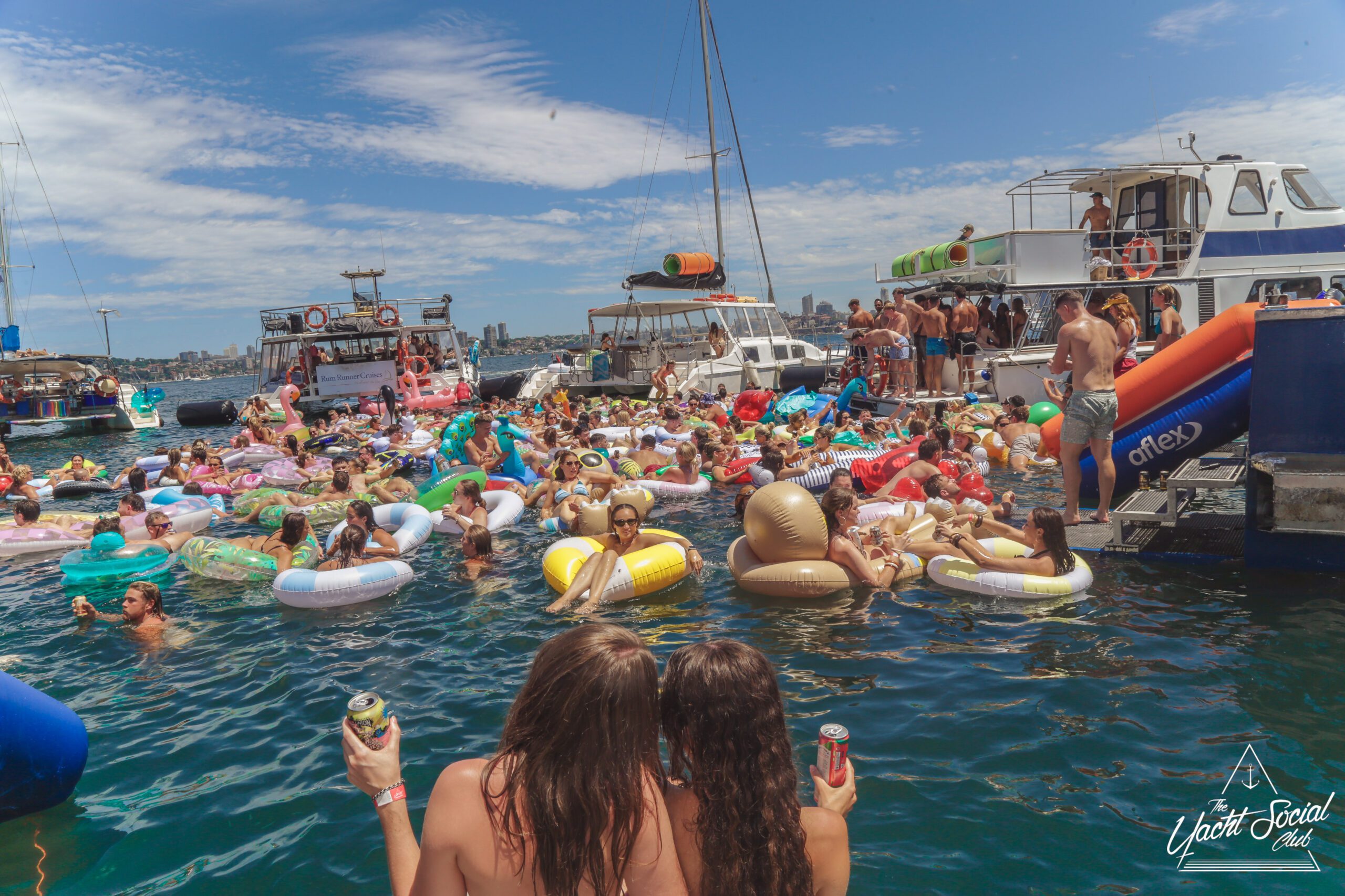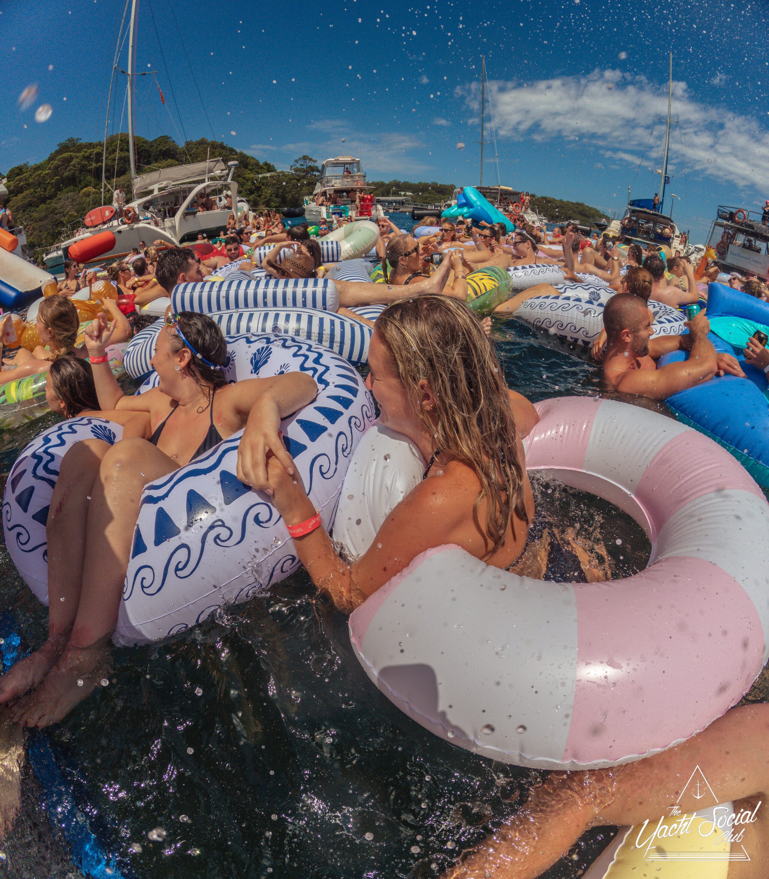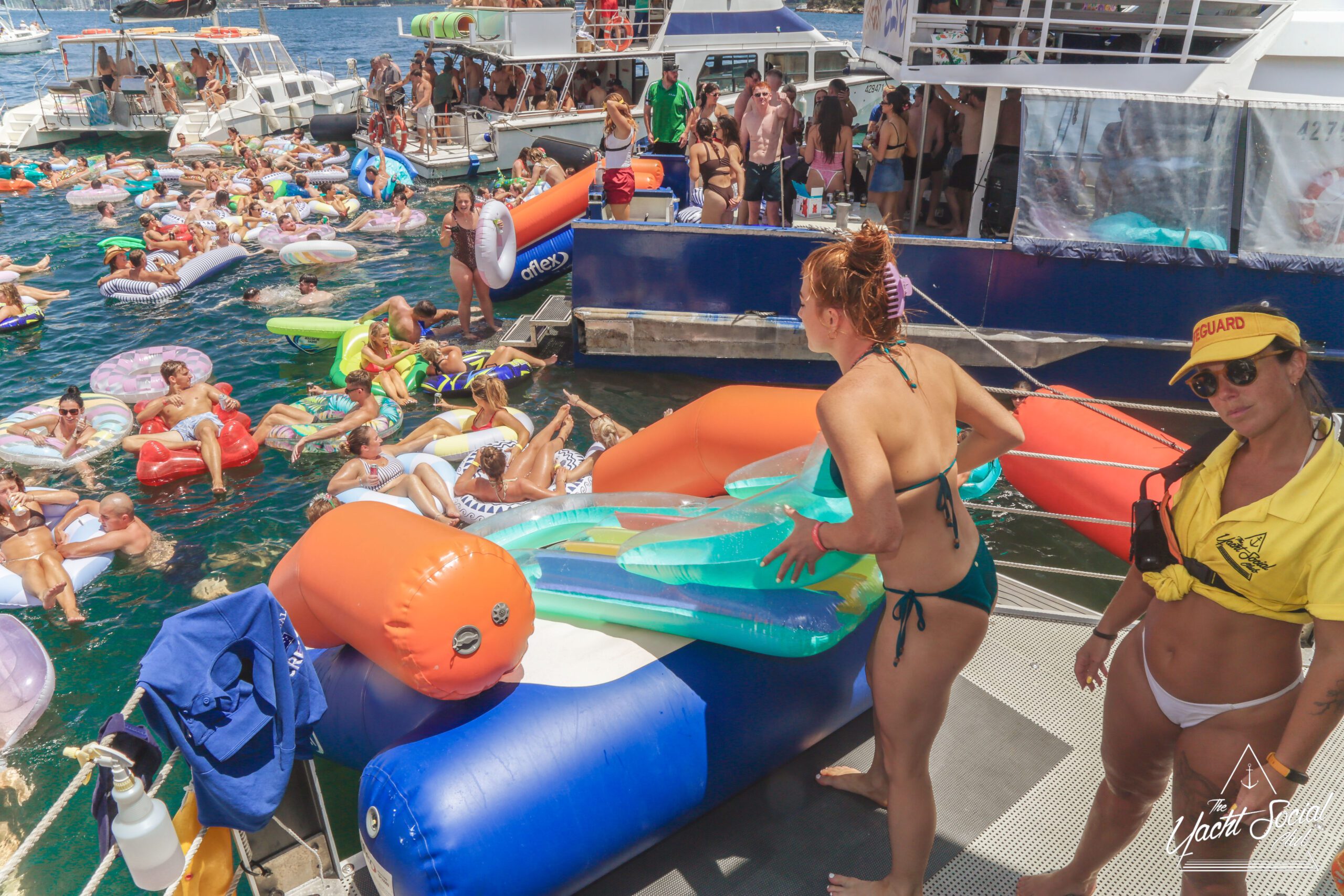 A group of people relax on inflatable pool floats in the water near two party boats, with others mingling, swimming, and enjoying a lively atmosphere under a cloudy sky. "Yacht Social Club" logo is visible in the corner.