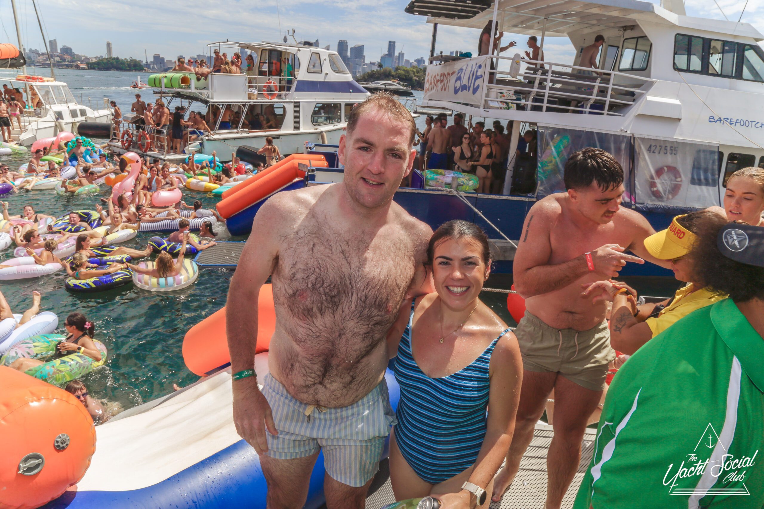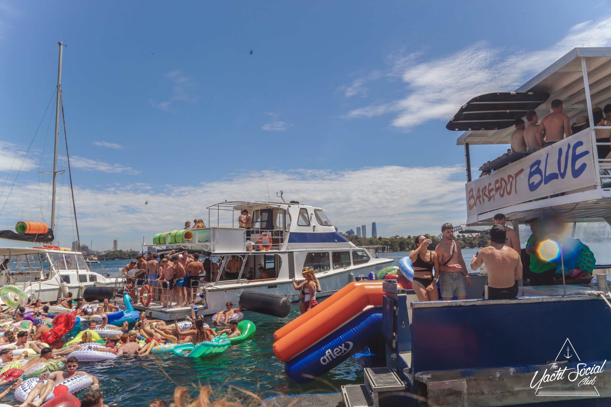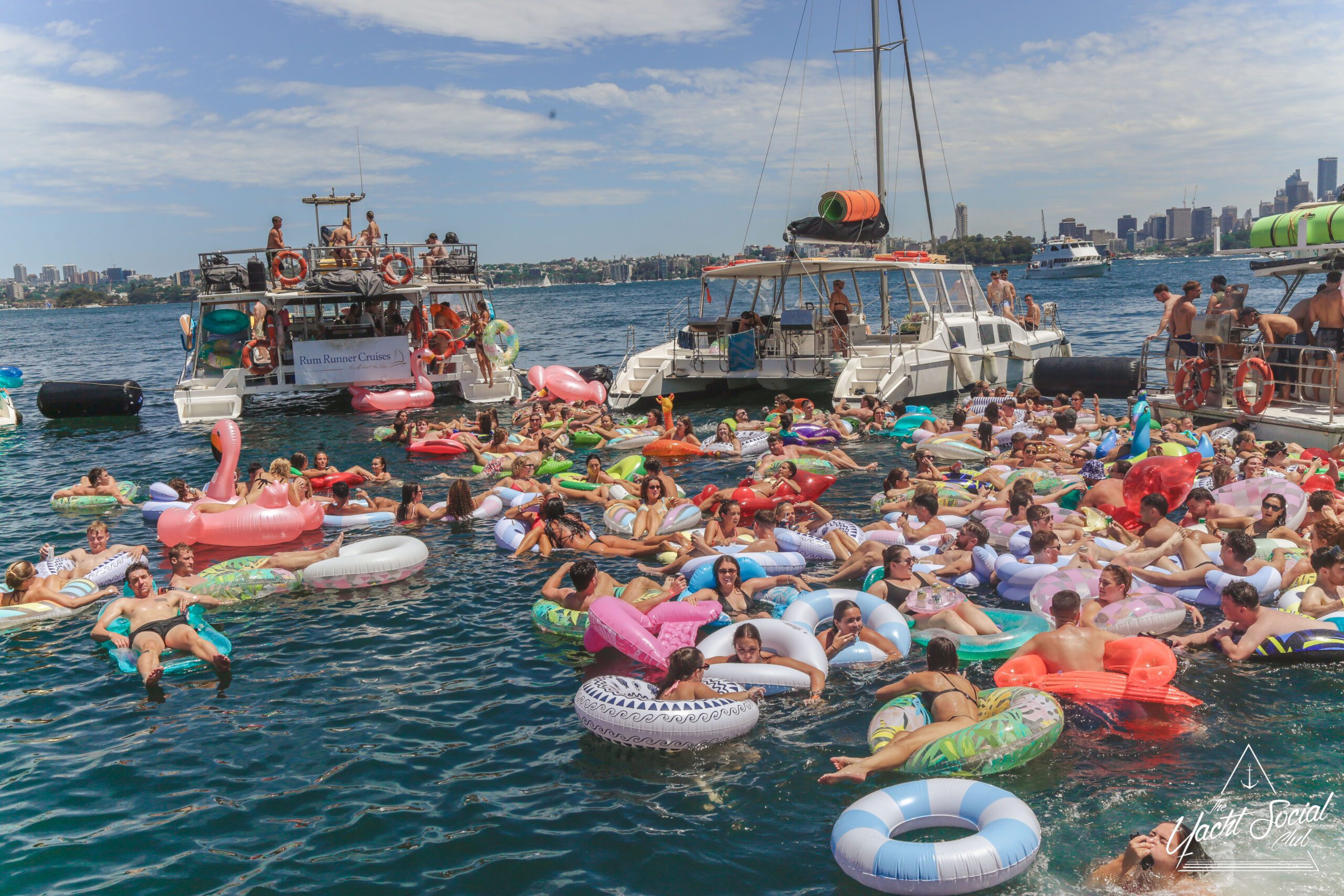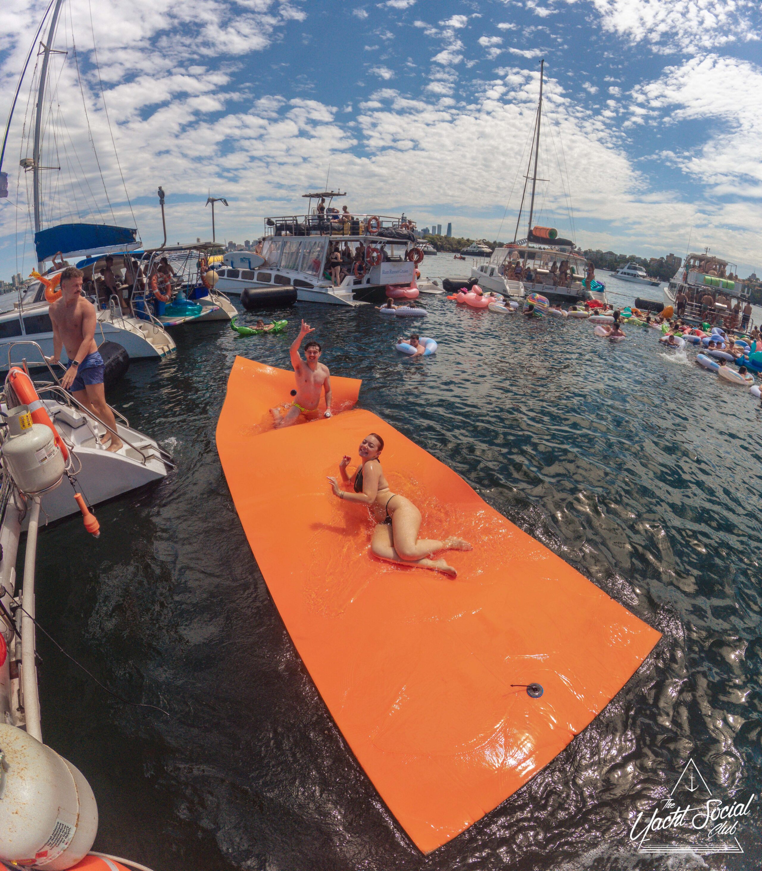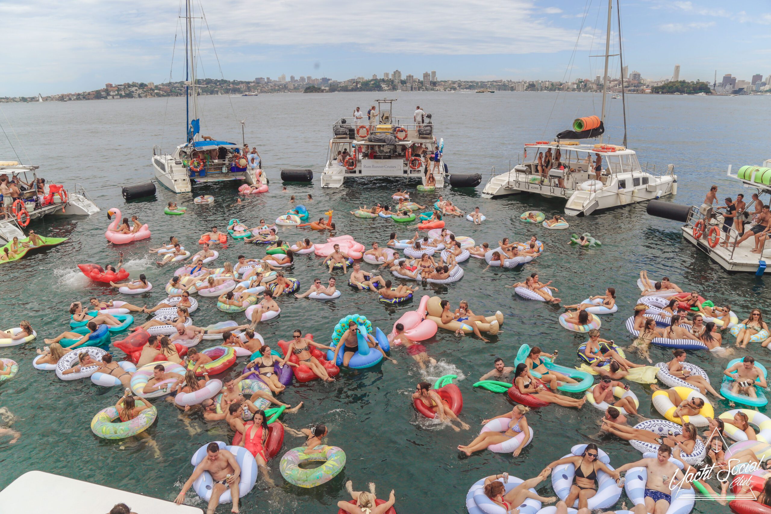 A group of people relax on inflatable pool floats in the water near two party boats, with others mingling, swimming, and enjoying a lively atmosphere under a cloudy sky. "Yacht Social Club" logo is visible in the corner.