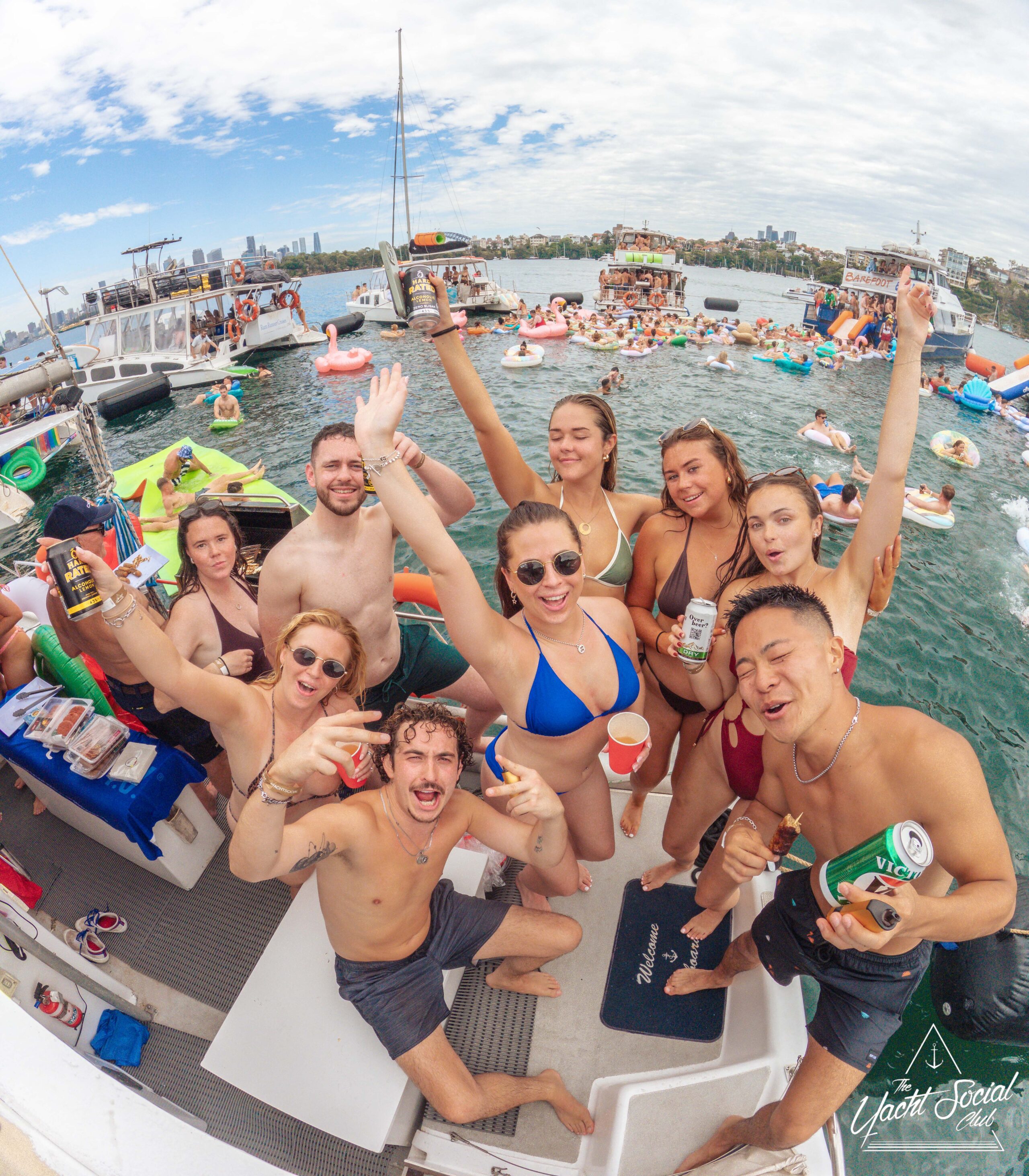 A group of young adults in swimsuits smile, cheer, and hold drinks on a boat during a lively summer party. Other boats and people floating in the water are visible in the background under a partly cloudy sky.