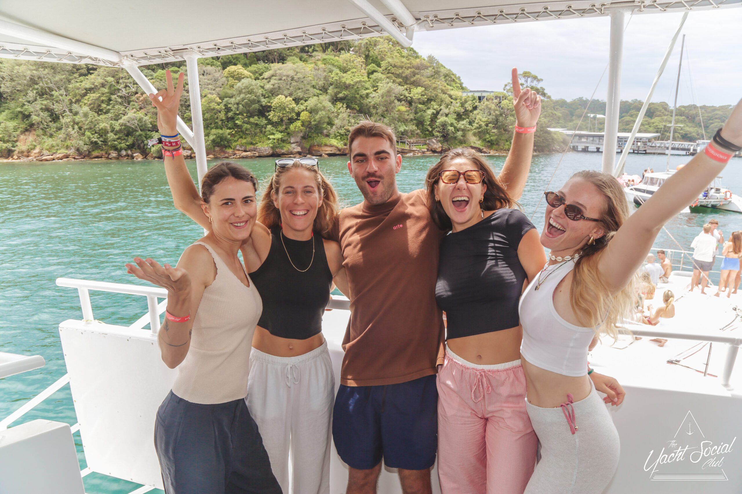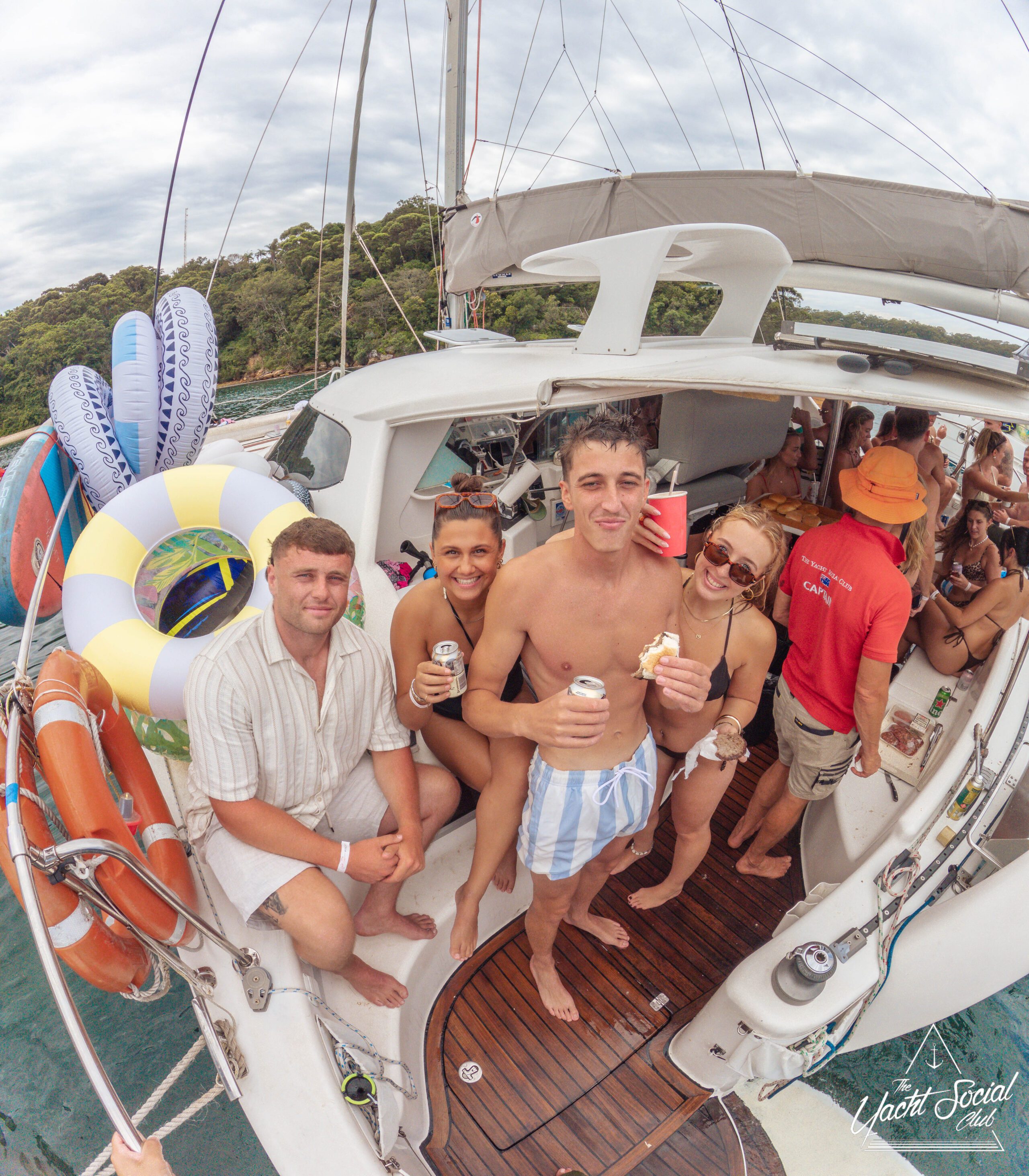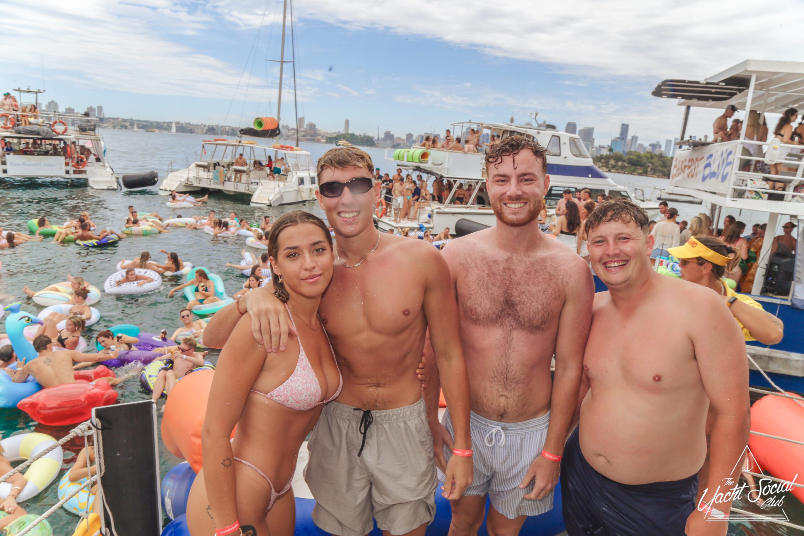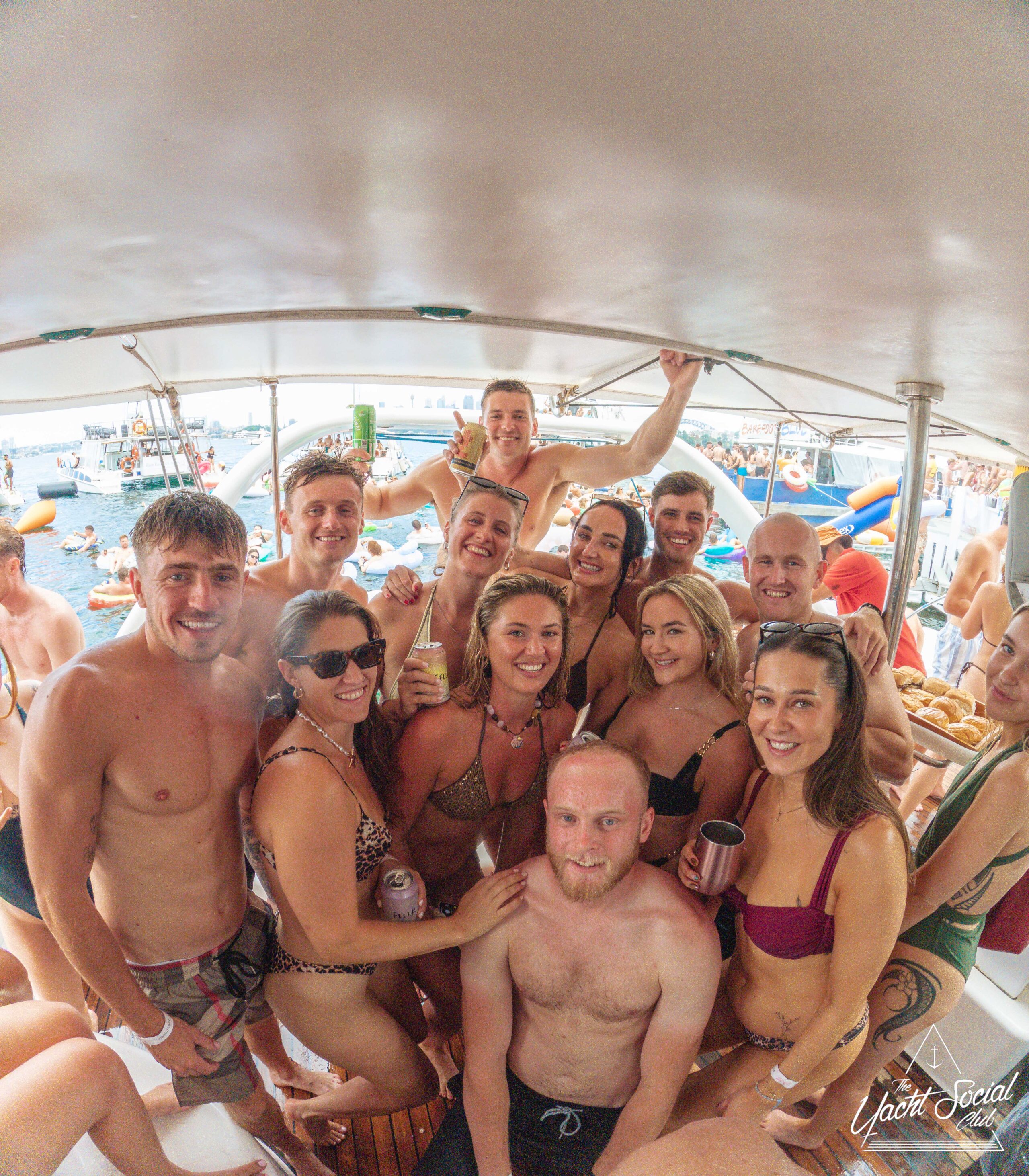 Five young adults in swimsuits smile for a group photo on a boat during a lively yacht party, with more people, boats, and blue skies visible in the background. Some are holding drinks, and the mood is festive and fun.