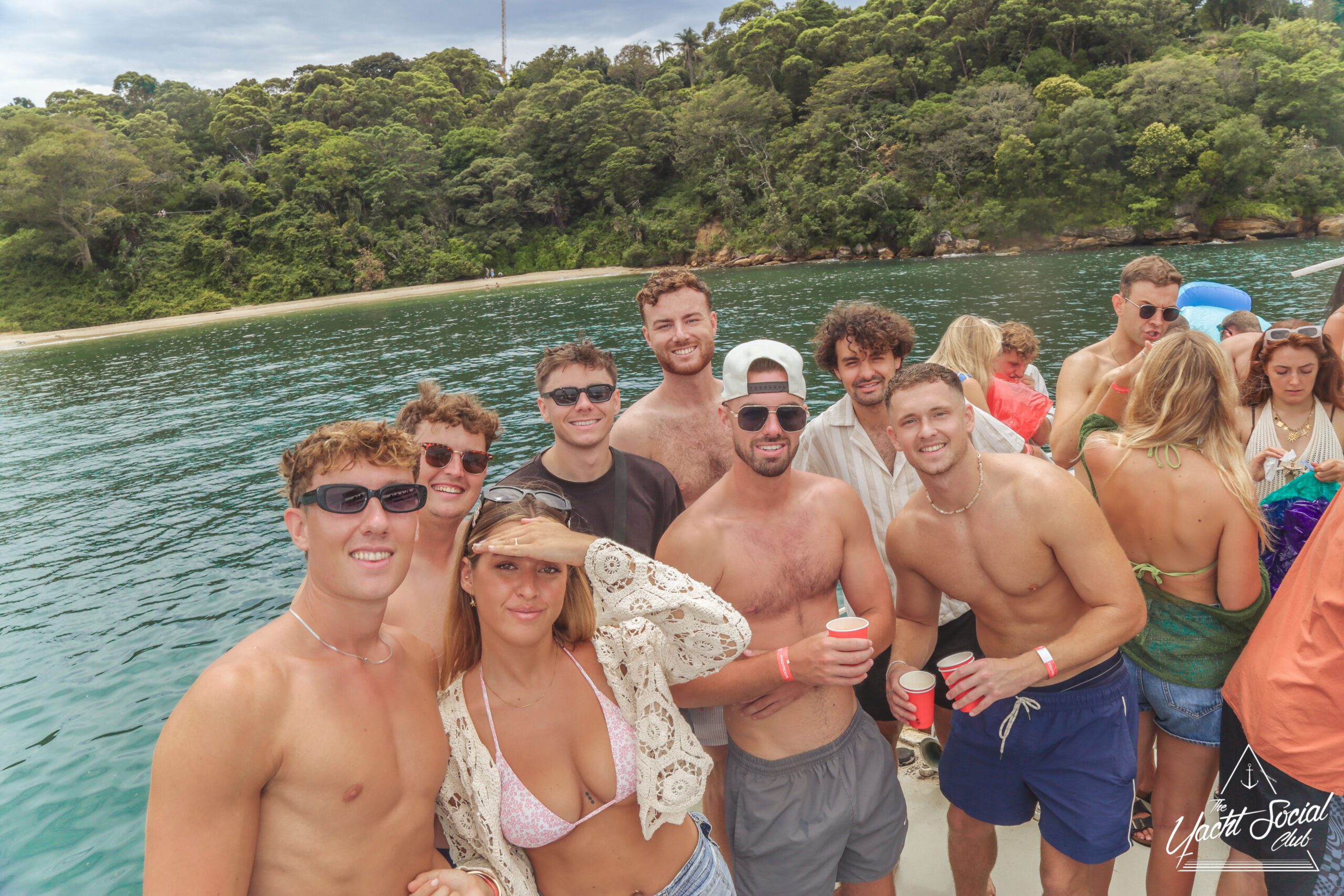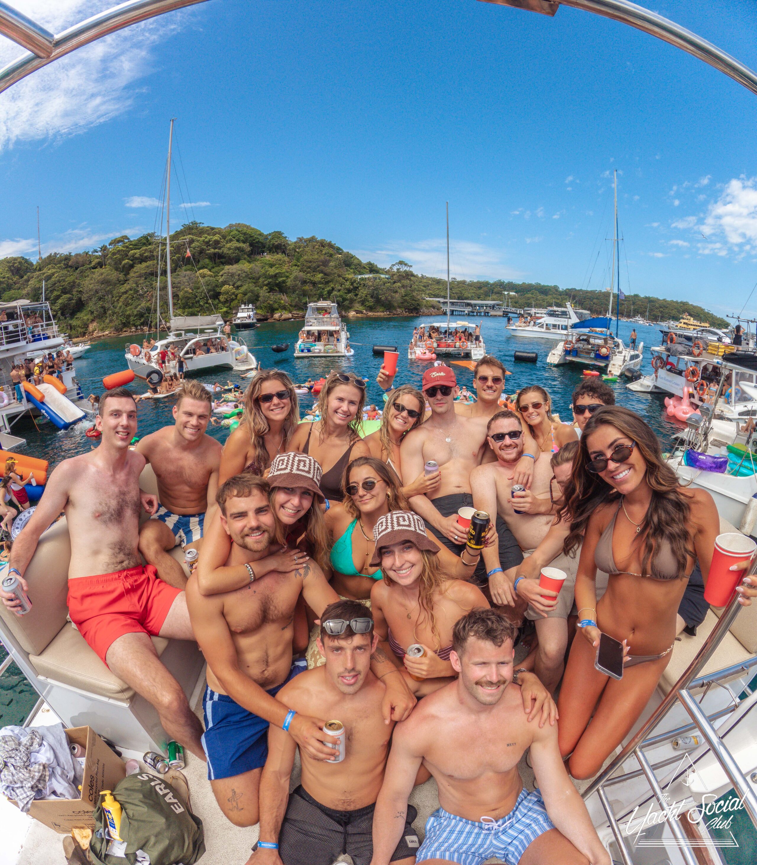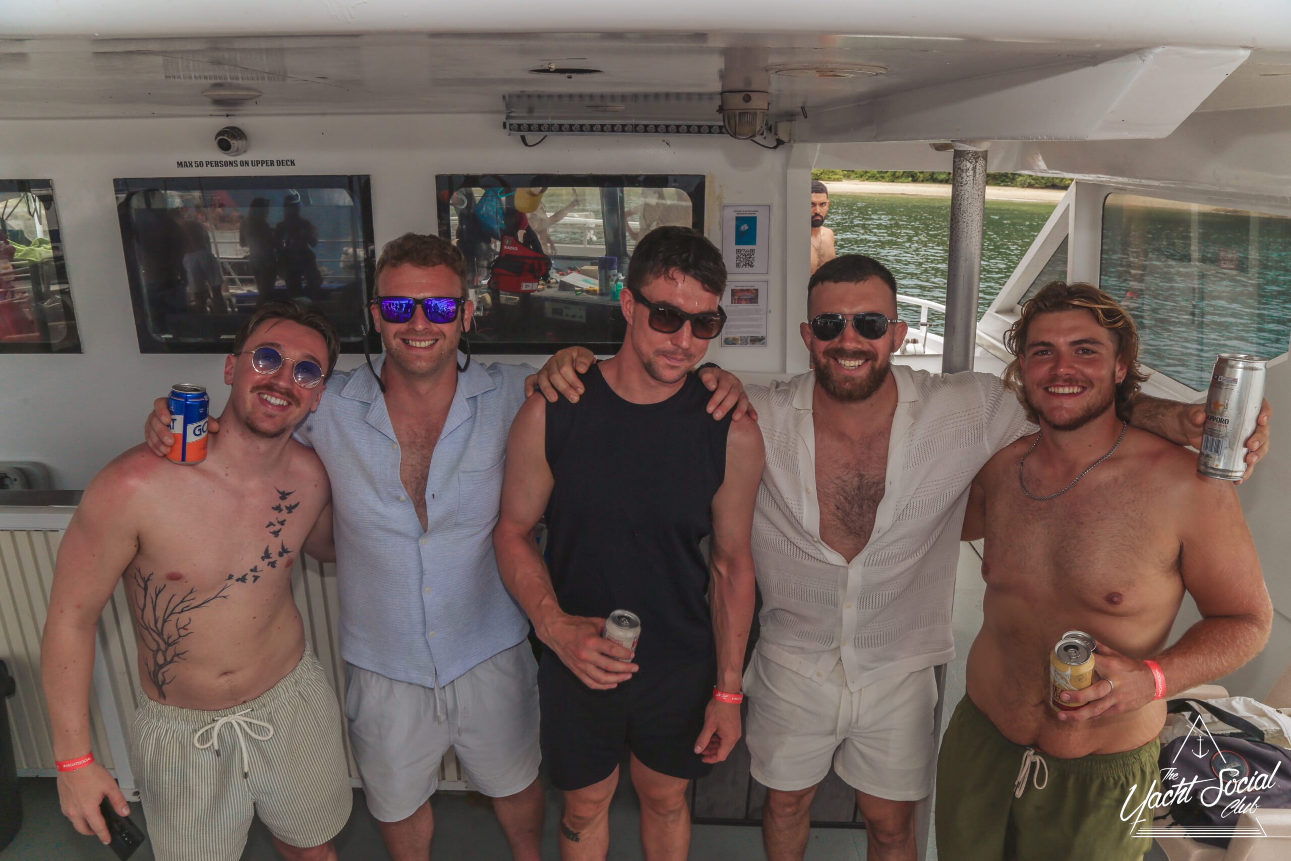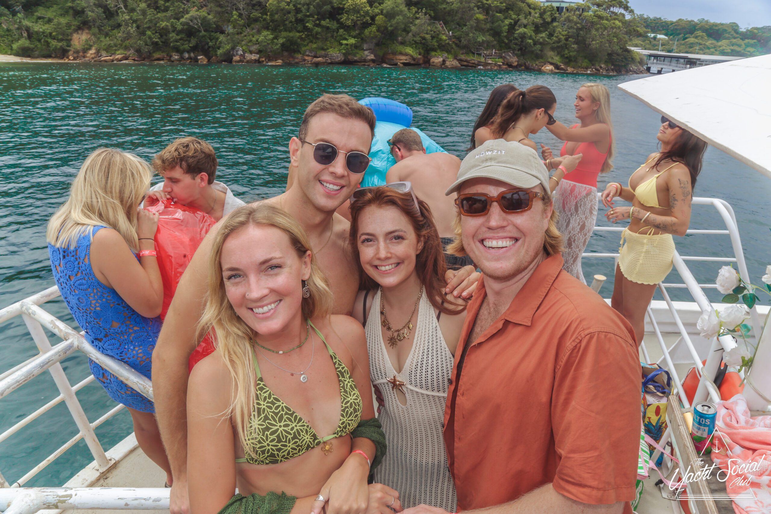 Five young adults in swimsuits smile for a group photo on a boat during a lively yacht party, with more people, boats, and blue skies visible in the background. Some are holding drinks, and the mood is festive and fun.